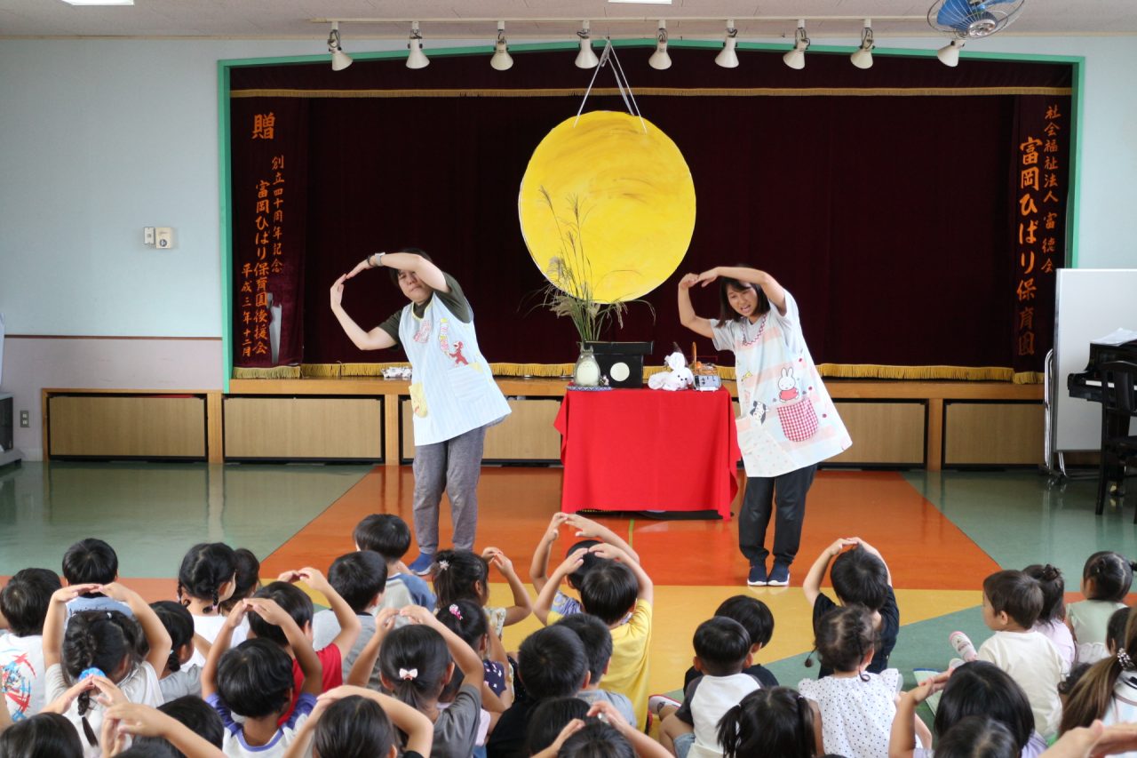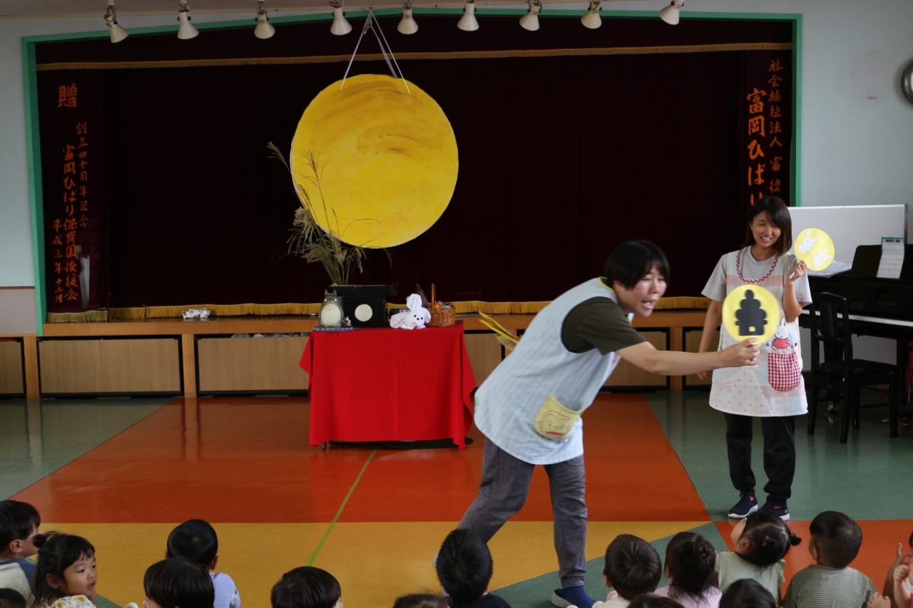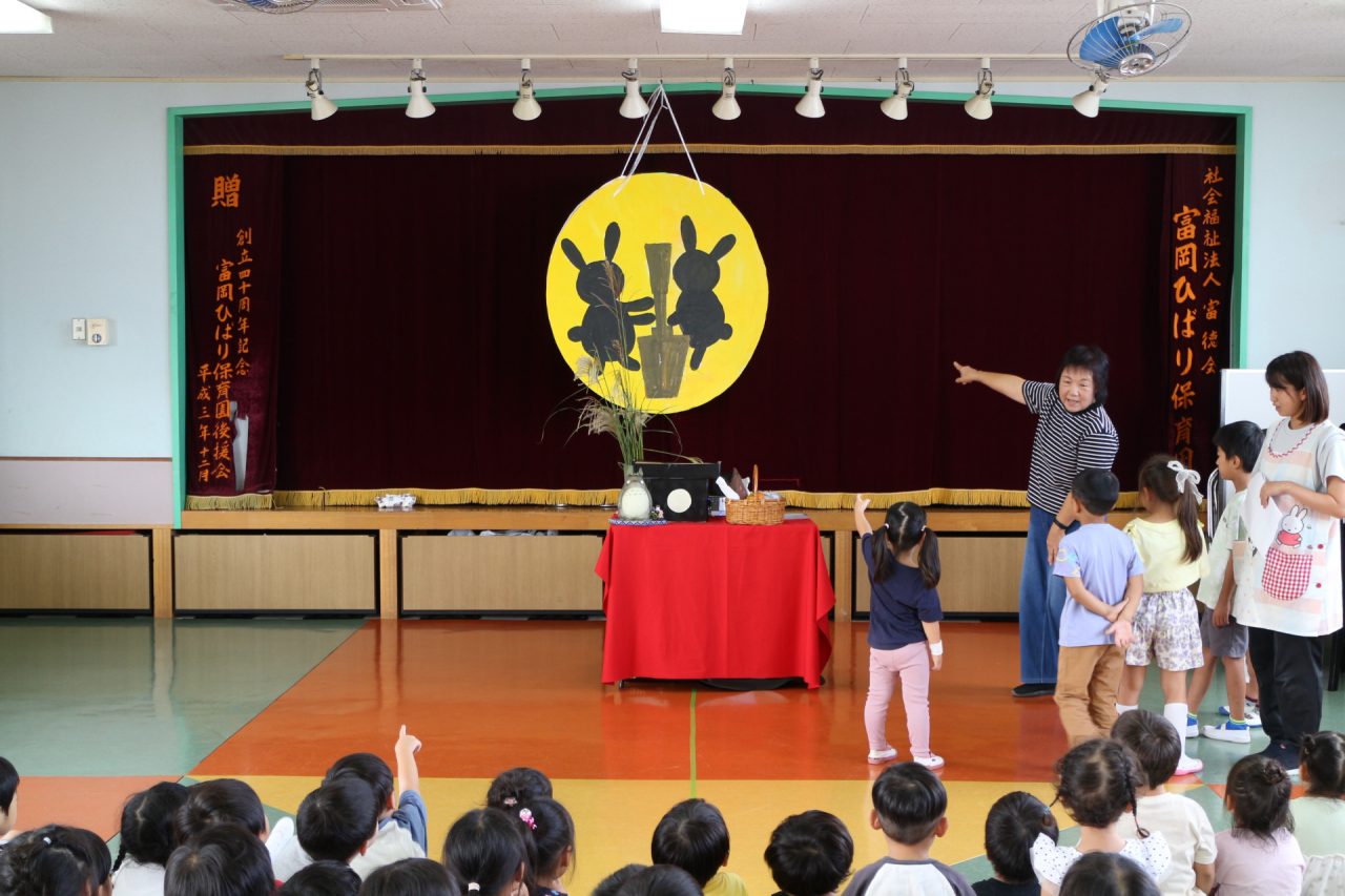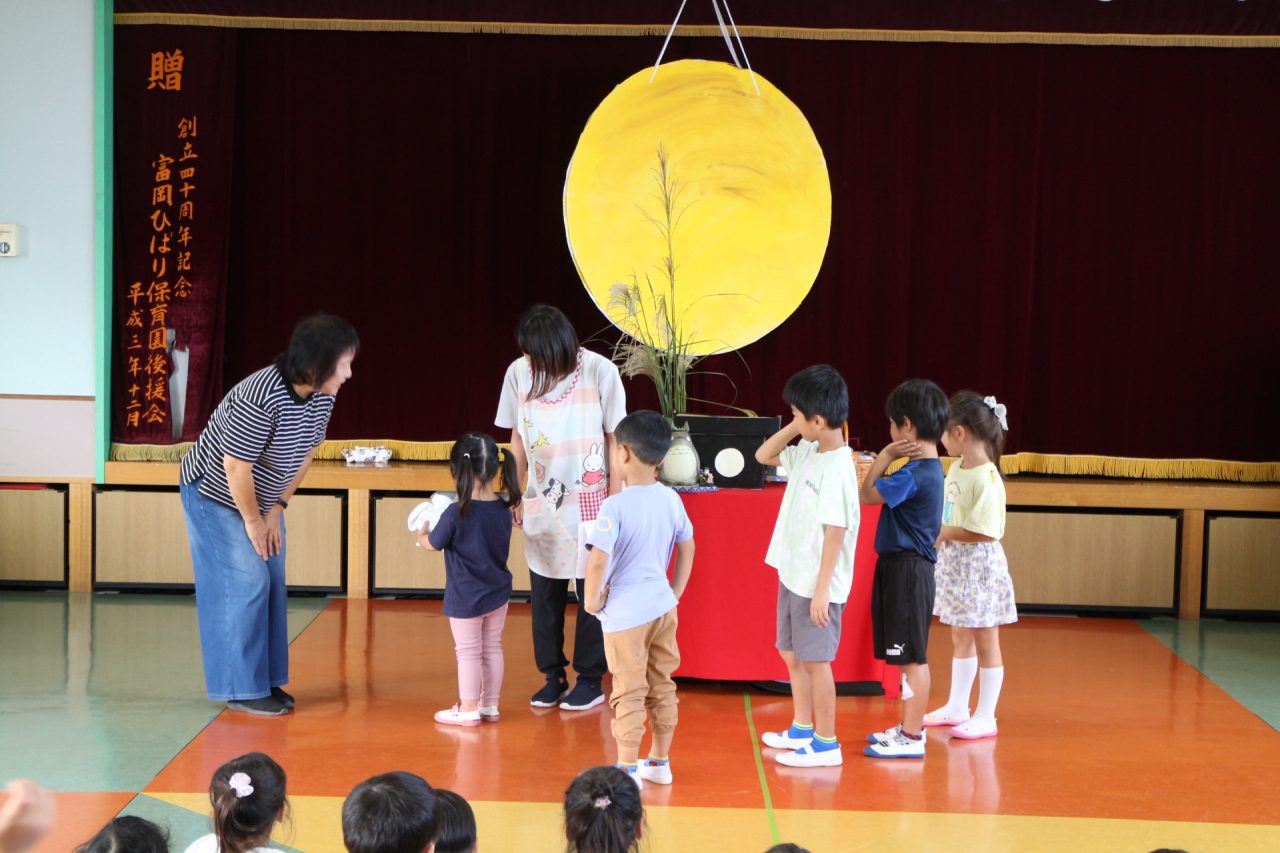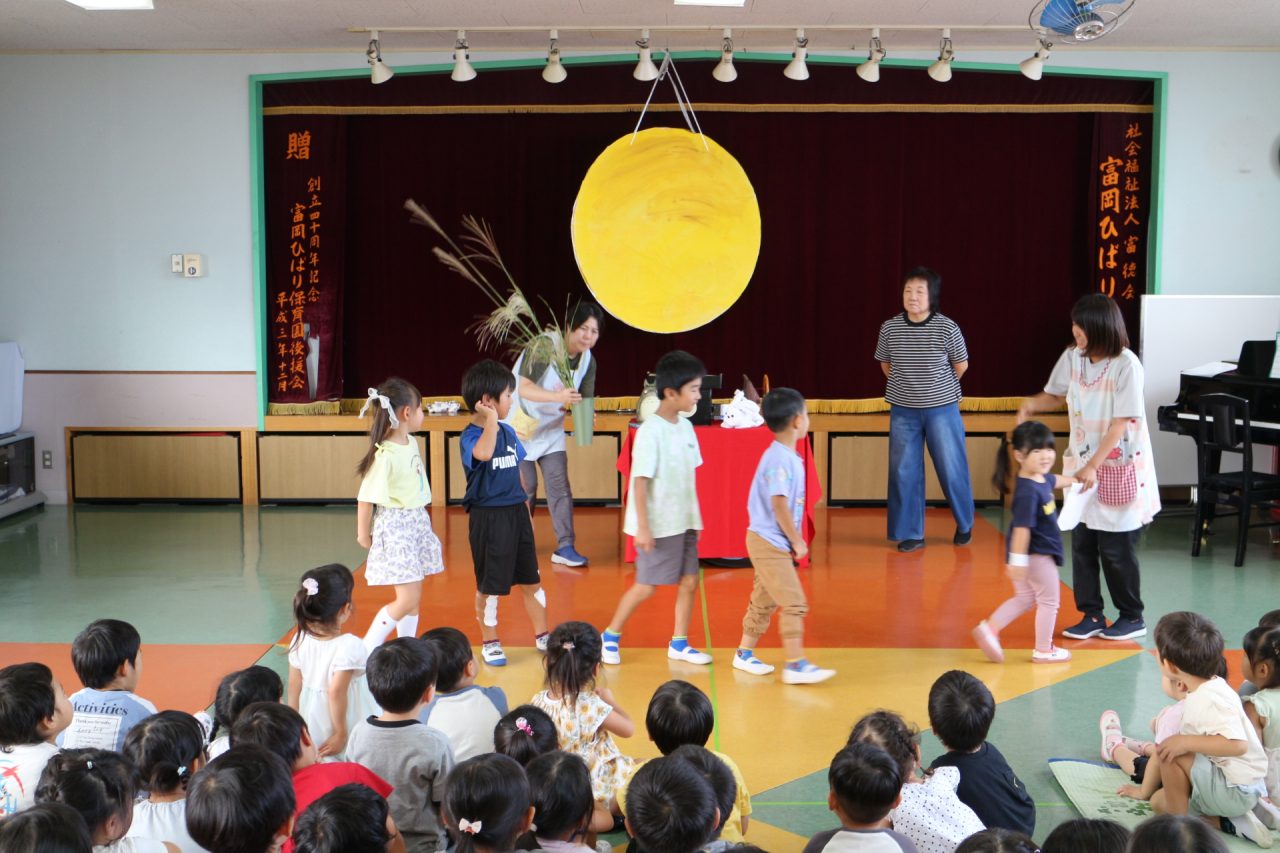 こども園でもみんなでホールに集まって、お月見集会を行いました。