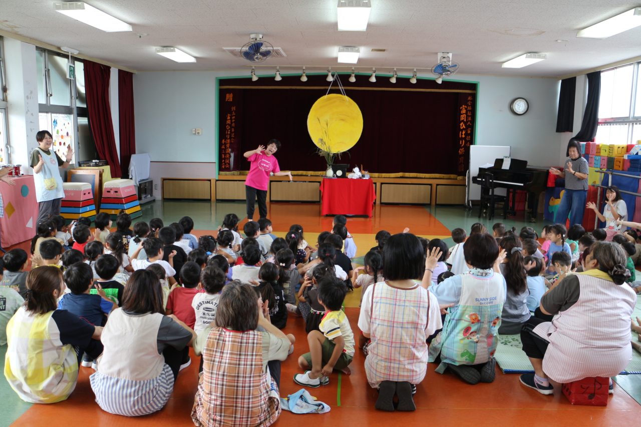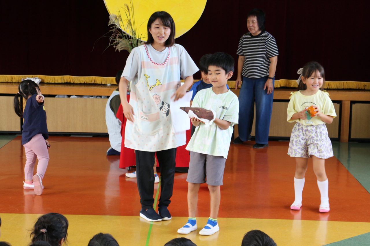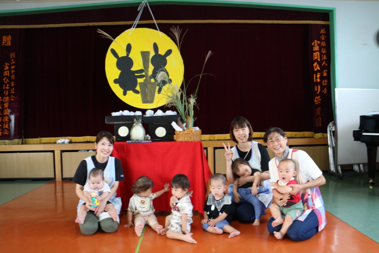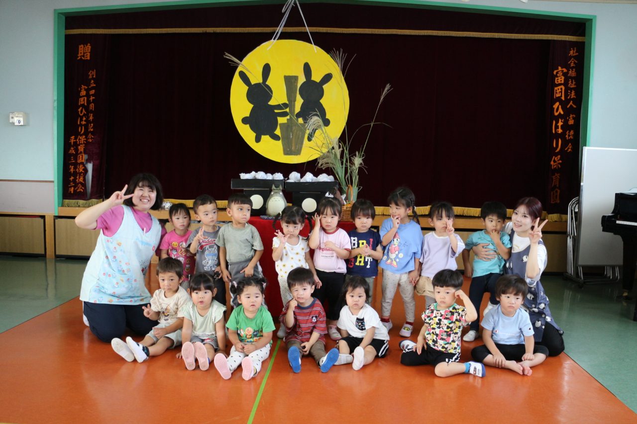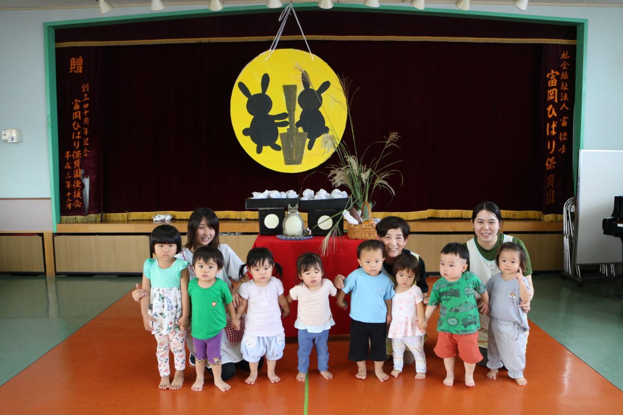 こども園でもみんなでホールに集まって、お月見集会を行いました。