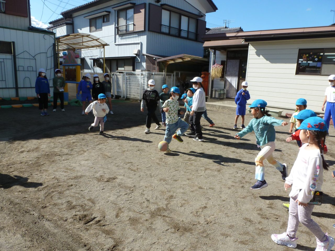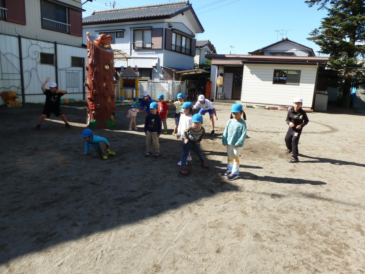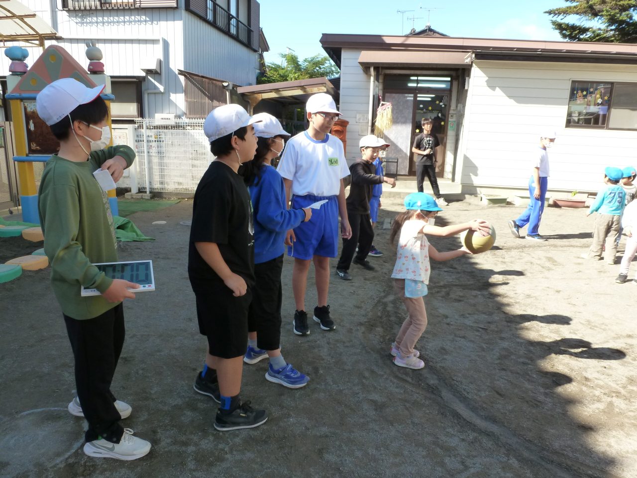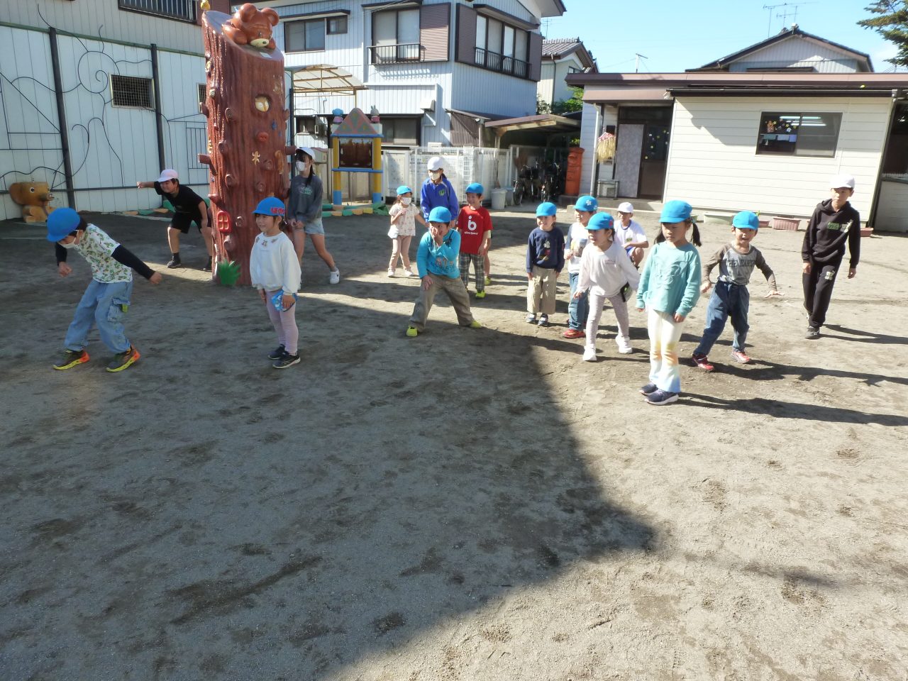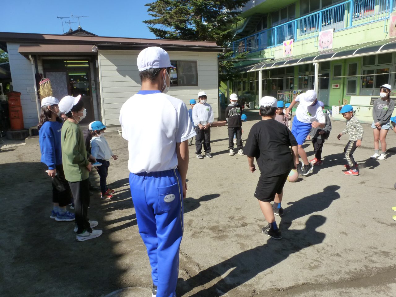 外遊びでは「ばくだんゲーム」と「だるまさんがころんだ」をしました!なじみのある遊びに子どもたちもノリノリで楽しんでいました✨ボールをあてられると喜んで中に入る子どもたち!ゲームが終わった後にはおりがみの手裏剣などをプレゼントしてもらいました♪