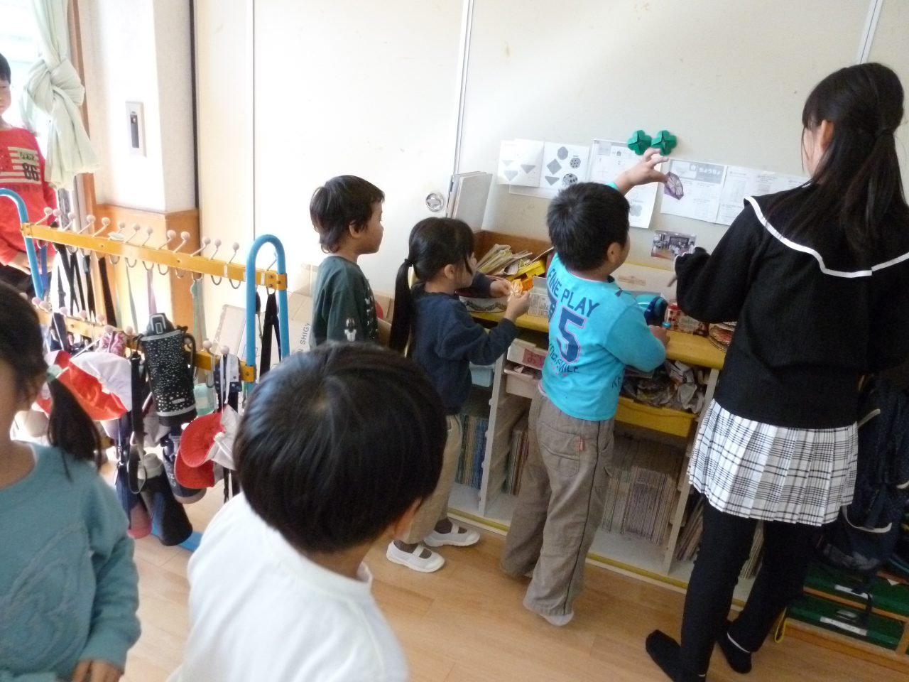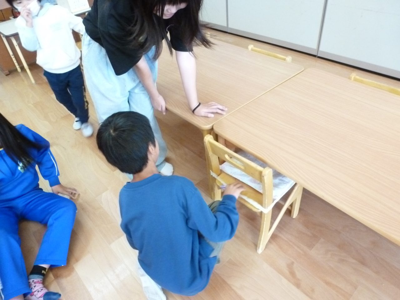 お部屋の中では「宝探しゲーム」をして、子どもたちも真剣になって探していました👀なかなか見つからないとお兄さんたちにこそっとと教えてもらっている姿も見られました。見つけられると手作りのぬりえとおりがみをプレセントしてもらいました♪