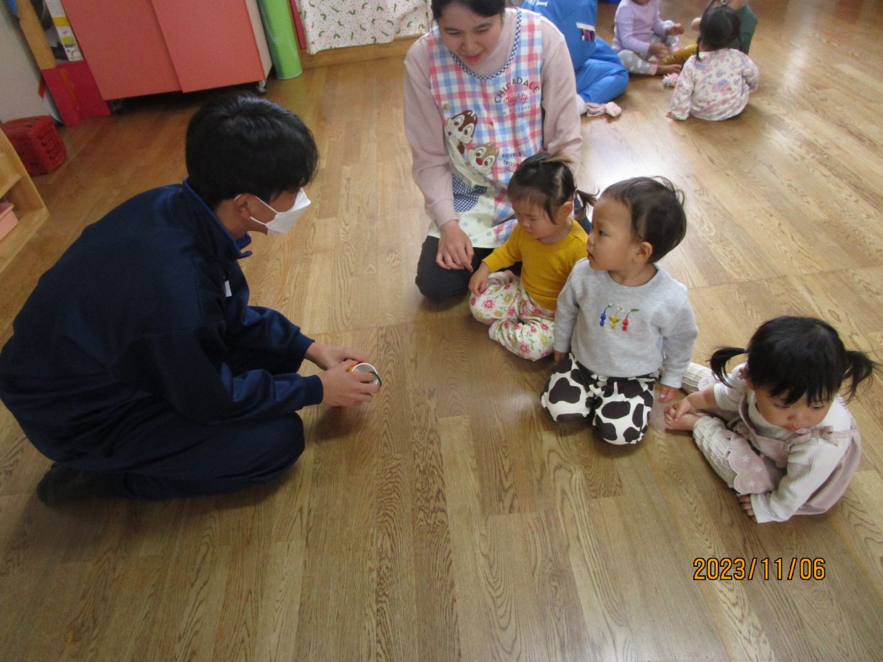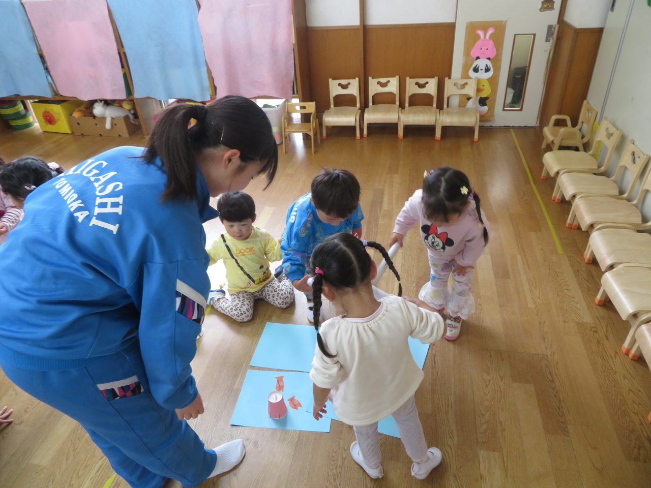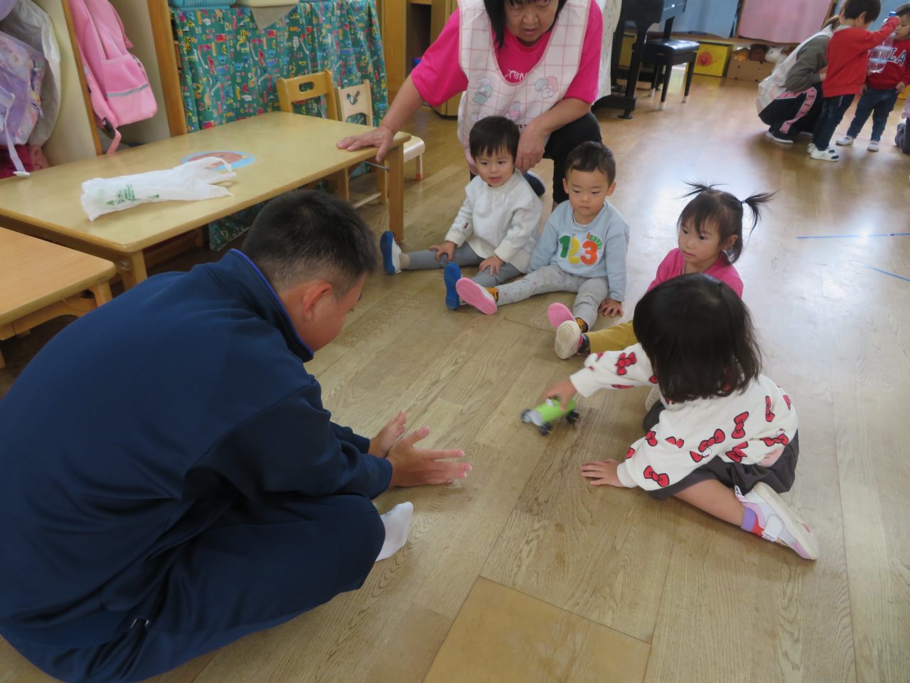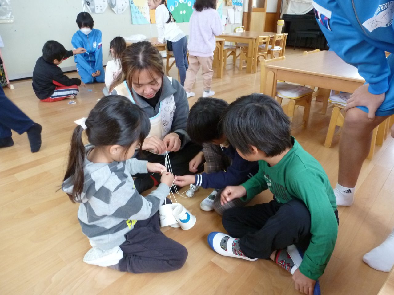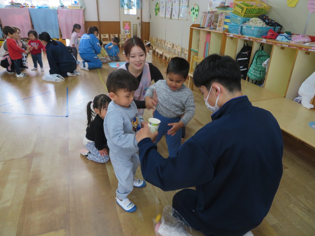 おもちゃをそれぞれ作ってきてくれて遊び方など教えてくれました♪お兄さんお姉さんと一緒に遊んでもらいとても嬉しそうな子どもたちでした😆