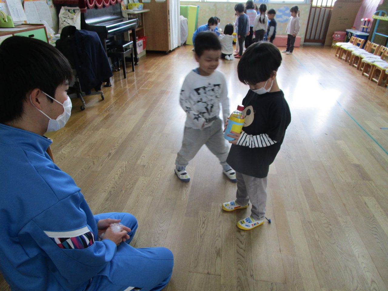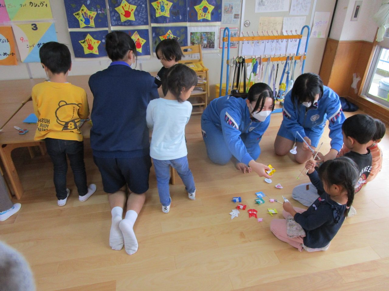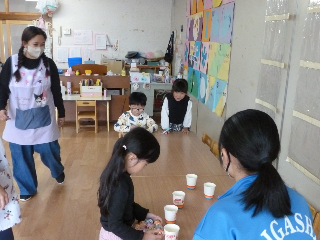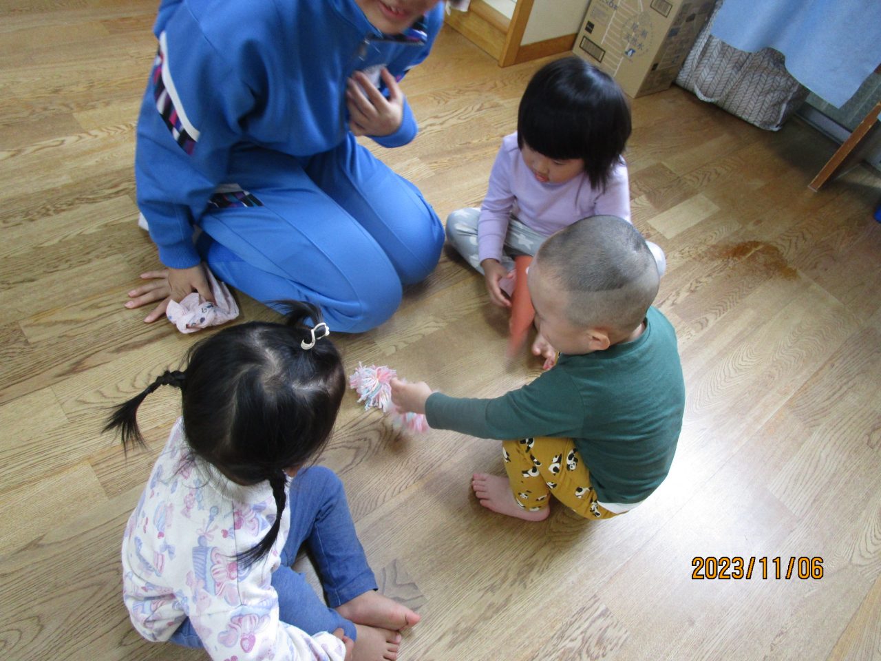おもちゃをそれぞれ作ってきてくれて遊び方など教えてくれました♪お兄さんお姉さんと一緒に遊んでもらいとても嬉しそうな子どもたちでした😆