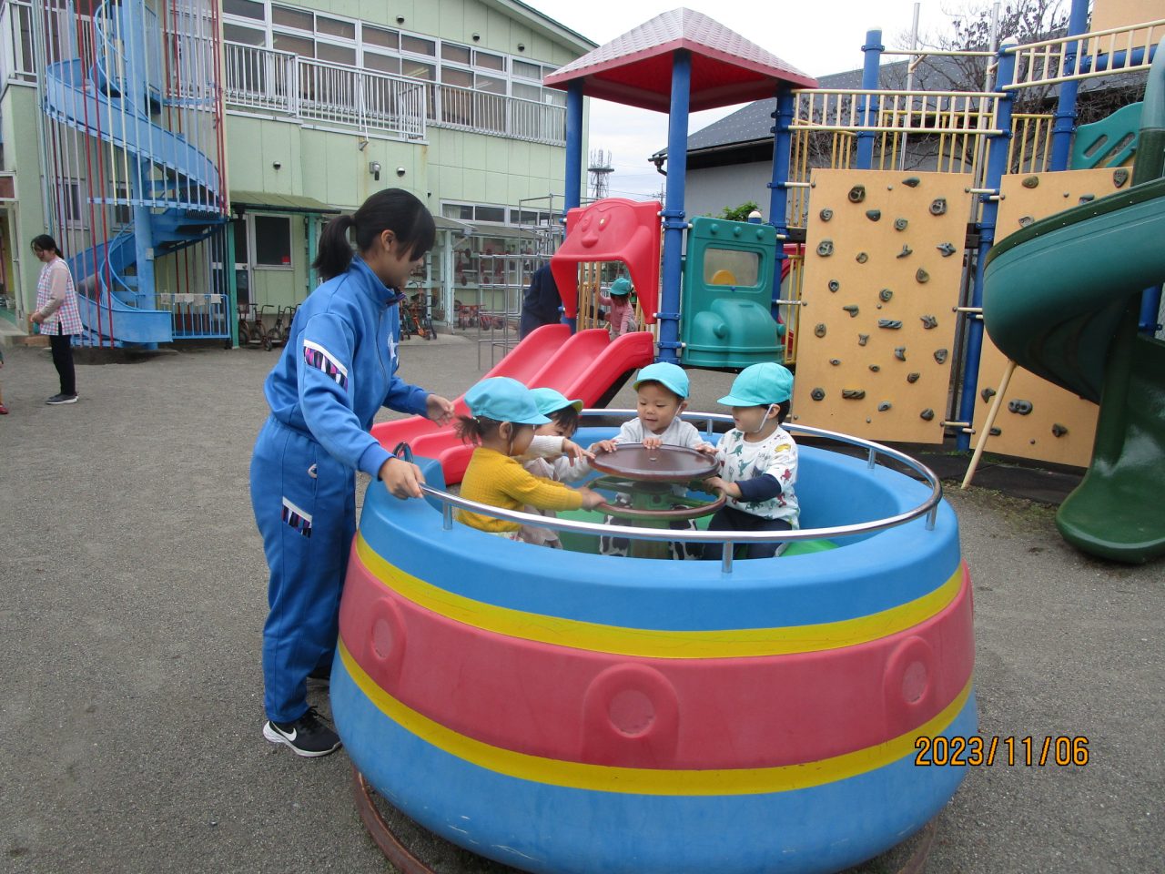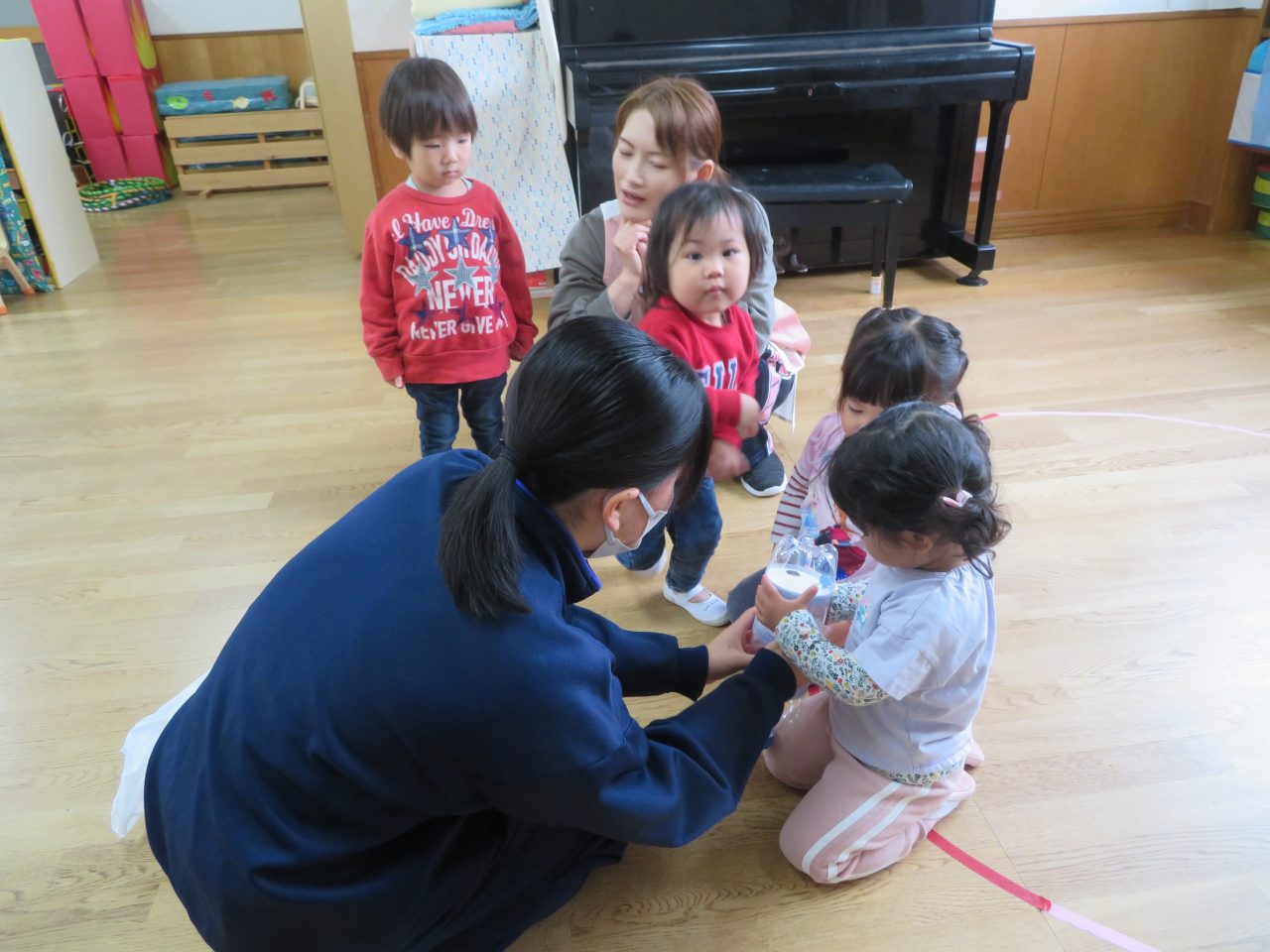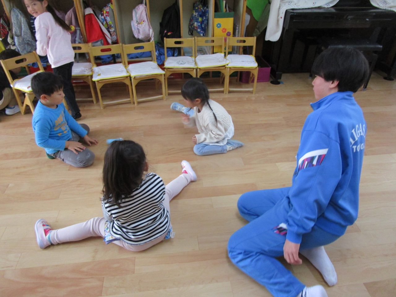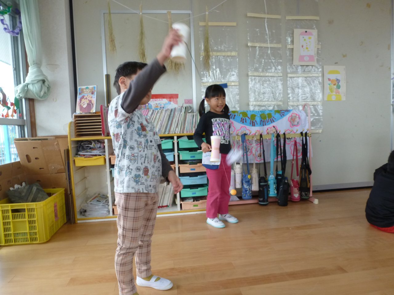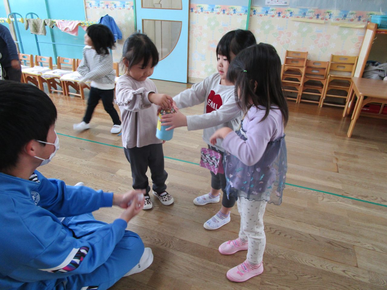 おもちゃをそれぞれ作ってきてくれて遊び方など教えてくれました♪お兄さんお姉さんと一緒に遊んでもらいとても嬉しそうな子どもたちでした😆