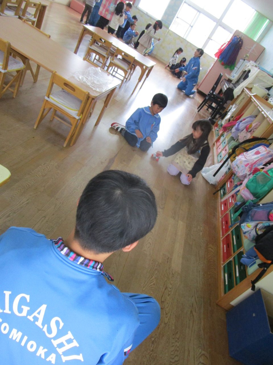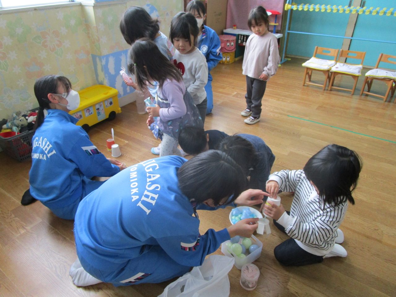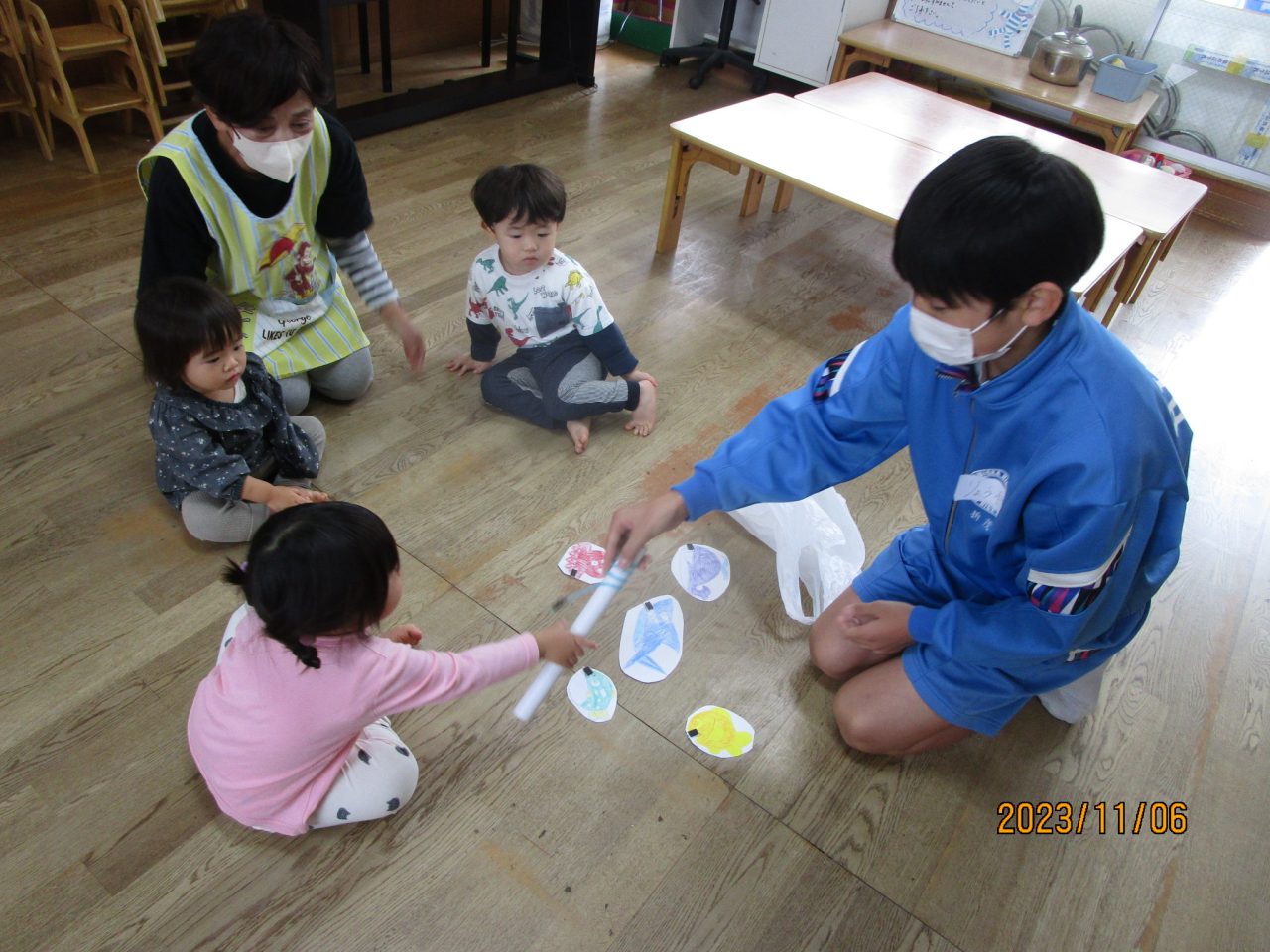 今日は富岡中学校のお兄さんお姉さんが来てくれて手作りおもちゃで一緒に遊んでくれました☺