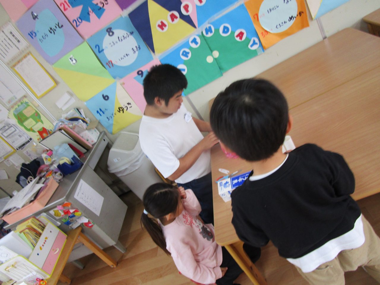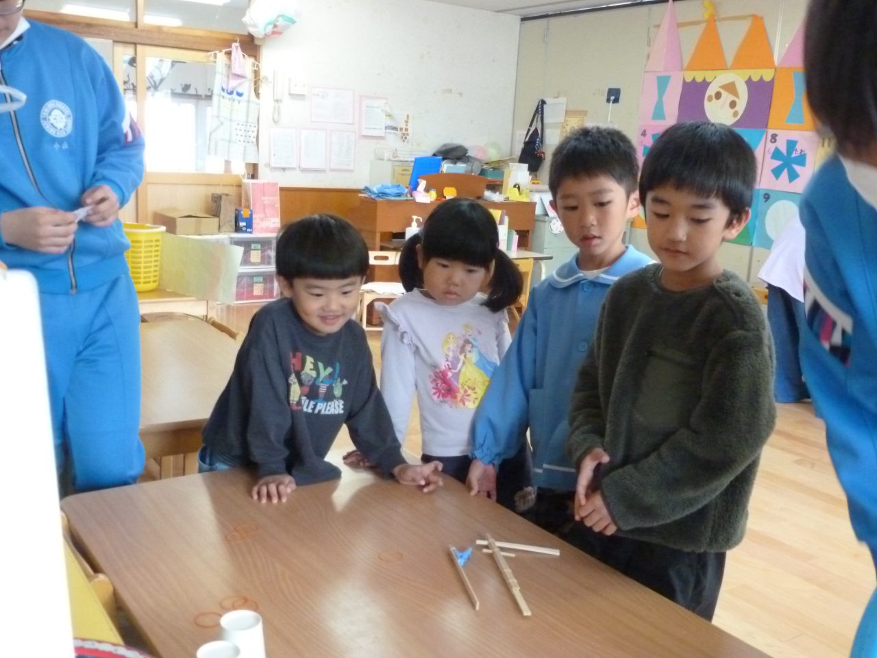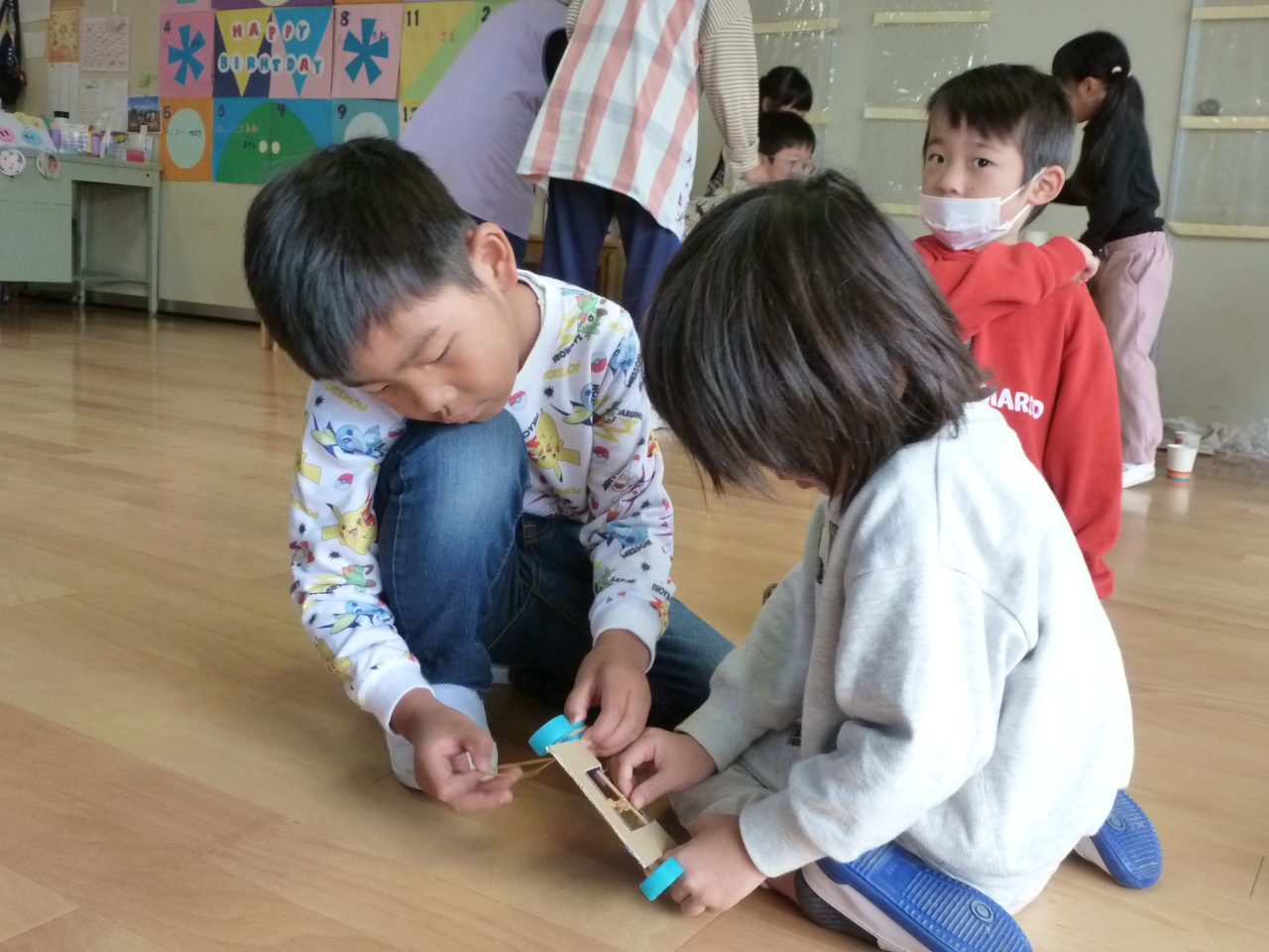 今日は富岡中学校のお兄さんお姉さんが来てくれて手作りおもちゃで一緒に遊んでくれました☺