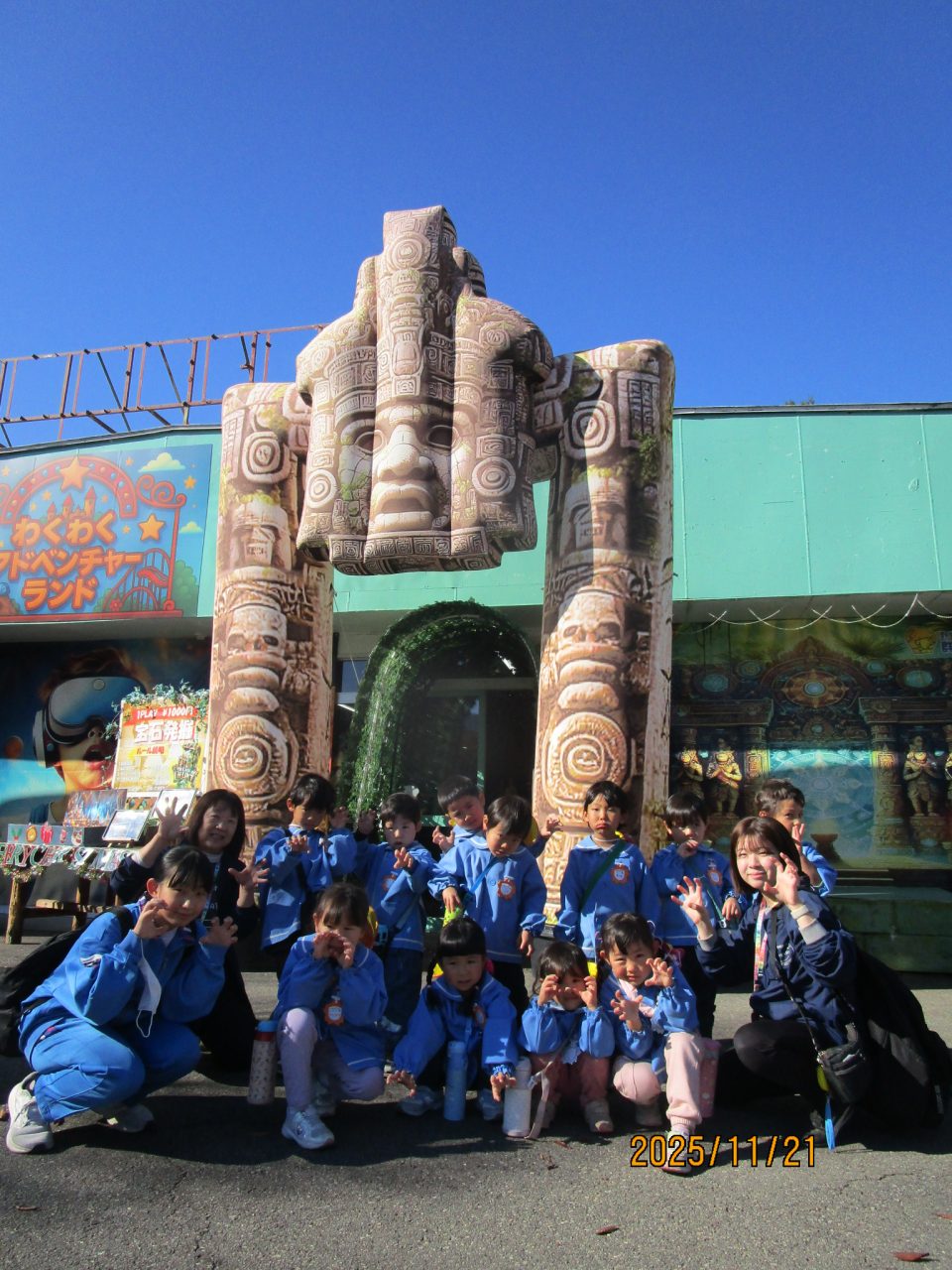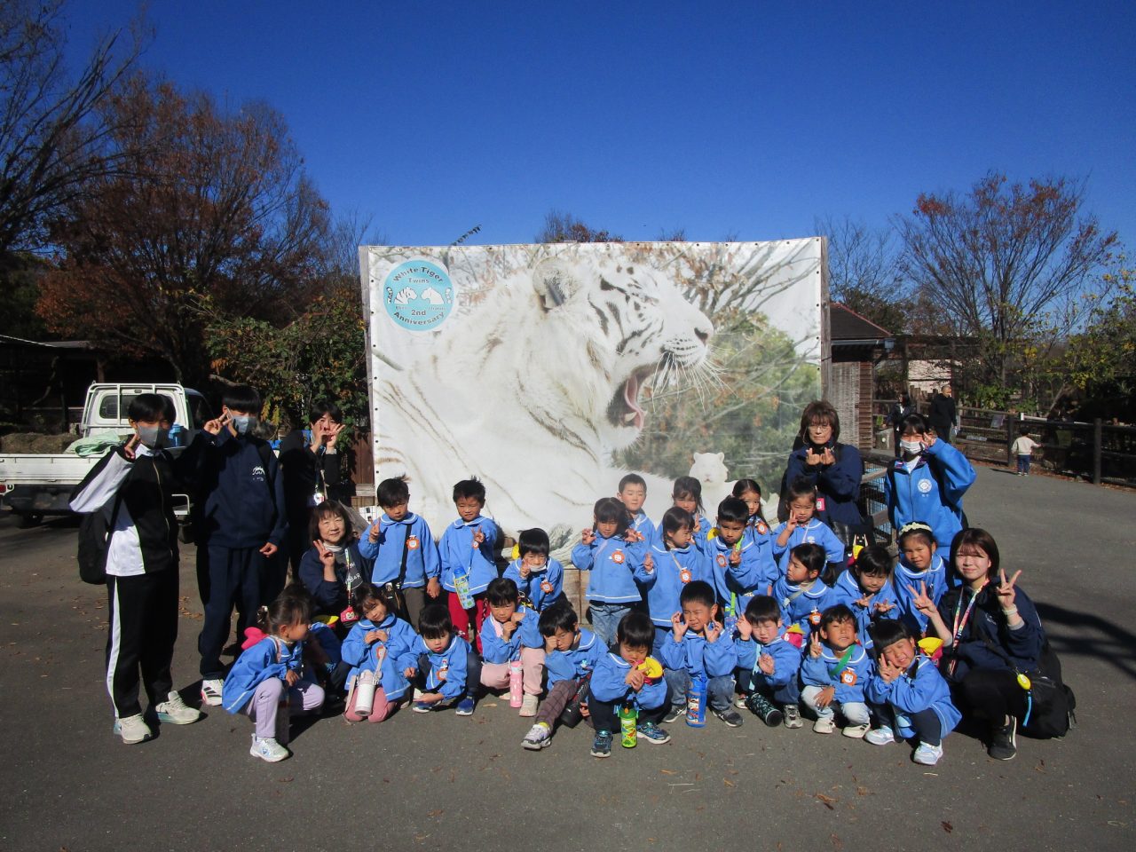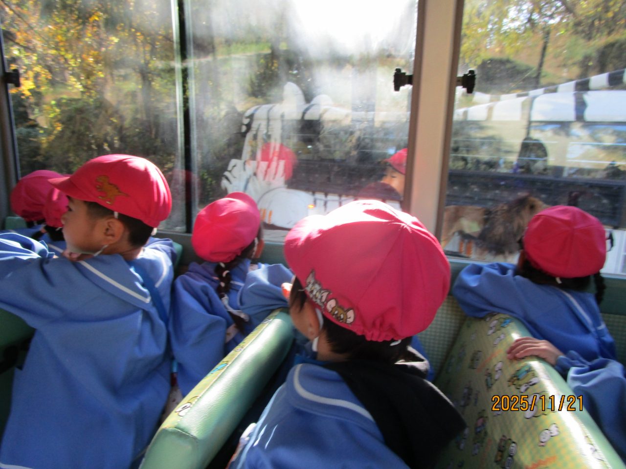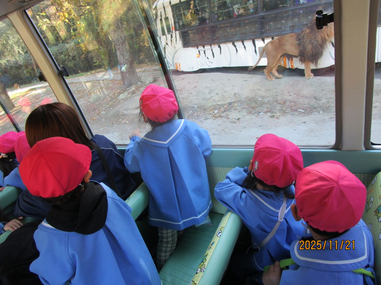 11月21日(金)待ちに待った群馬サファリパーク🐯へ行ってきました。モルモット🐭のふれあい体験では『思いやりの心』を学んでいざ園バスで園内へ。🦒きりんやさい(3500㎏あるそうです‼)水牛、今話題の🐻くまをそっと見たり、🐒サルの親子に癒されたり・・・ウオーキングゾーンでは、ニホンオオカミ、ホワイトタイガー(〇美先生と同い年⁉)、しかなどのつのをさわったりして、再びバスに乗ってラクダやバク、象を見て猛獣ゾーへ・・・🦁ライオンのえさやりをみて、まるでライオンキングのシンバとナラみたいなライオンの子供たちにキュン💕として、お弁当へ。愛情たっぷりのお弁当🍱を嬉しそうに「見てみて~😊」と見せ合いながら食べていました。