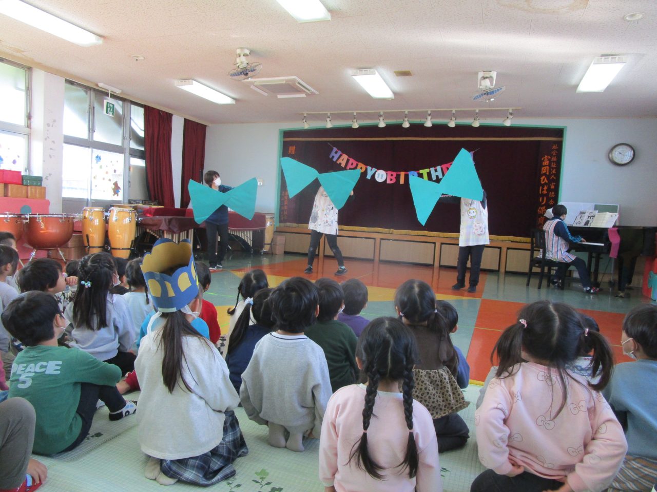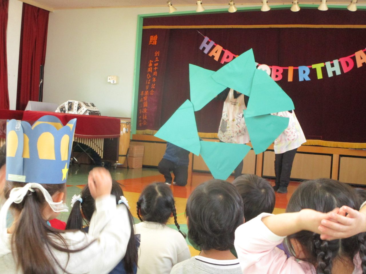 みんなでうたや質問をしたり、「子ねこのミャオのお誕生日」の劇を見たりしました🎶劇では6枚の三角の板がピアノに合わせていろんな形に変化するのがとてもワクワクで興味深々でした🔍
