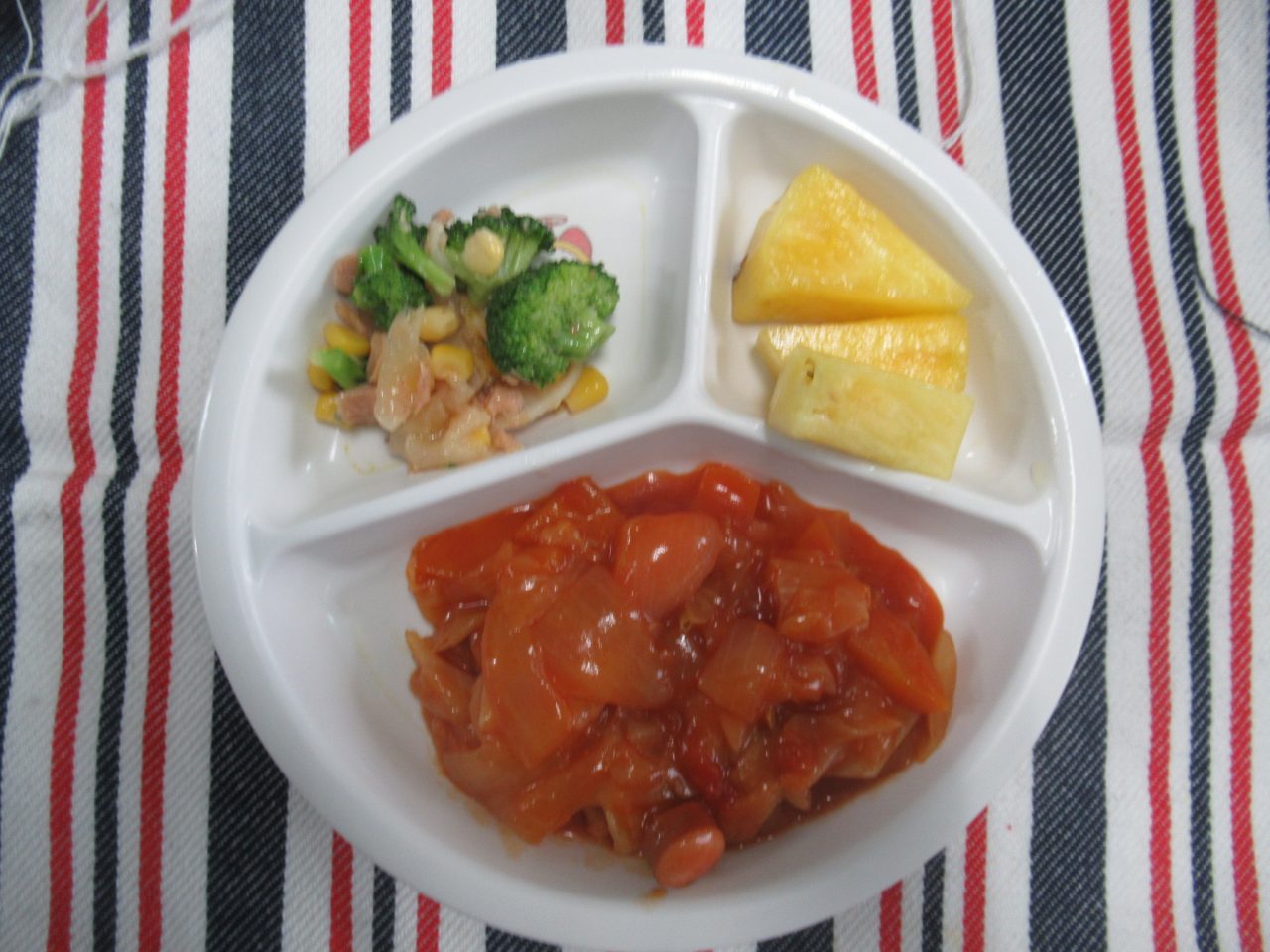 お昼・・・キャベツのトマト煮/大根の彩りサラダ/パイン