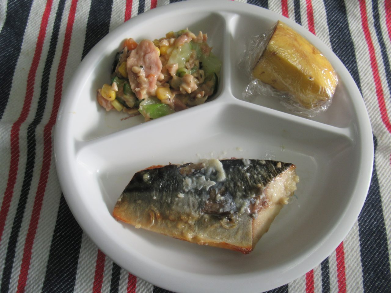 お昼・・・サバの塩こうじ/納豆サラダ/バナナ