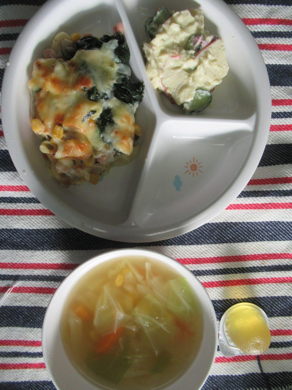 お昼・・・マカロニグラタン/さつまいもとりんごのサラダ/コンソメスープ/一口ゼリー