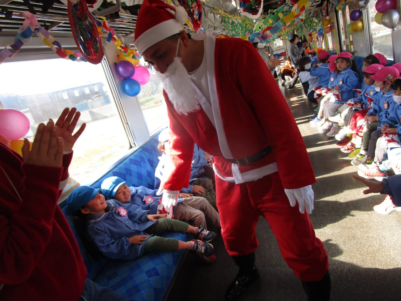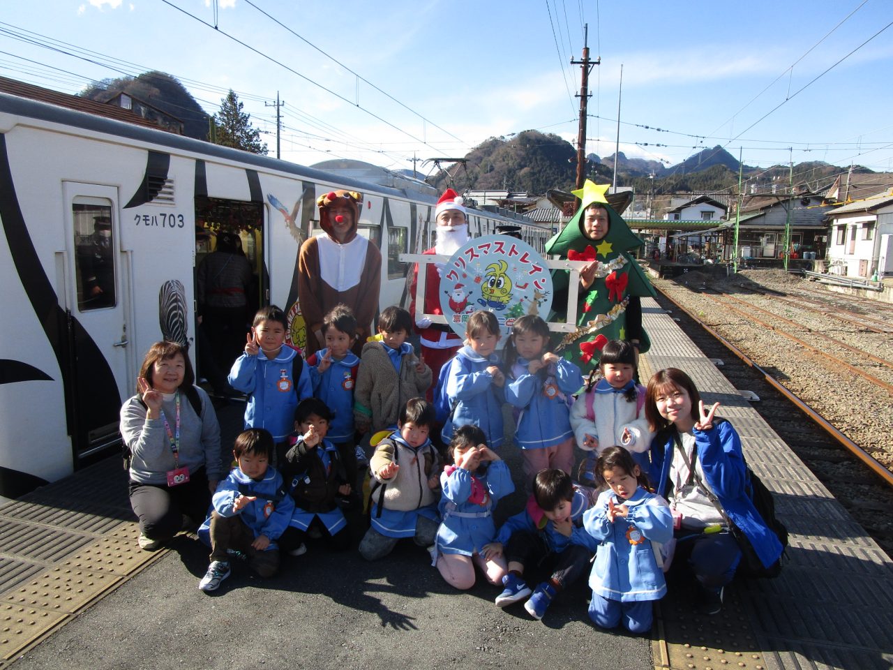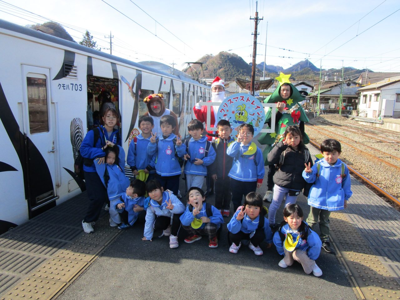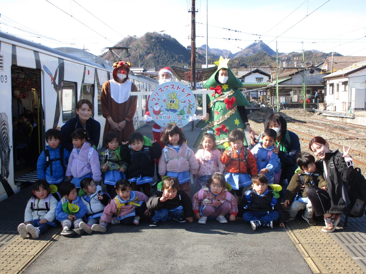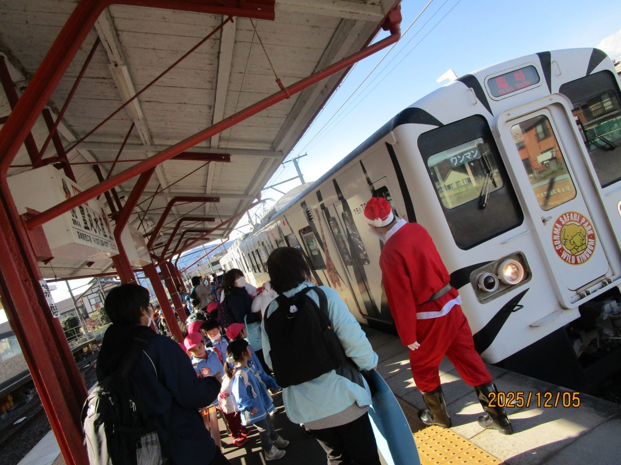 12月5日(金)毎年恒例の『ひばり号クリスマストレイン特別臨時列車』に乗って、下仁田駅まで行ってきました。新しいサファリ電車がひばり号に飾り付けられて富岡駅のホームに入ってくると子どもたちから大歓声が沸き上がりました‼電車の中は、たんぽぽ組さんからクラスごとに作った飾りや輪つなぎで🎄クリスマスムード一面。ちゅうりっぷ組もコスモス組も初めはちょっと緊張していたけれど🎅サンタさんにプレゼント🎁をもらって😊にこにこに・・・荷物の重そうなトナカイさん🦌に「がんばれー!」と応援して、サンタさんに「メリークリスマス、ありがとう」とお話ししたり、歌を歌ったりしながら下仁田駅へ到着🚃