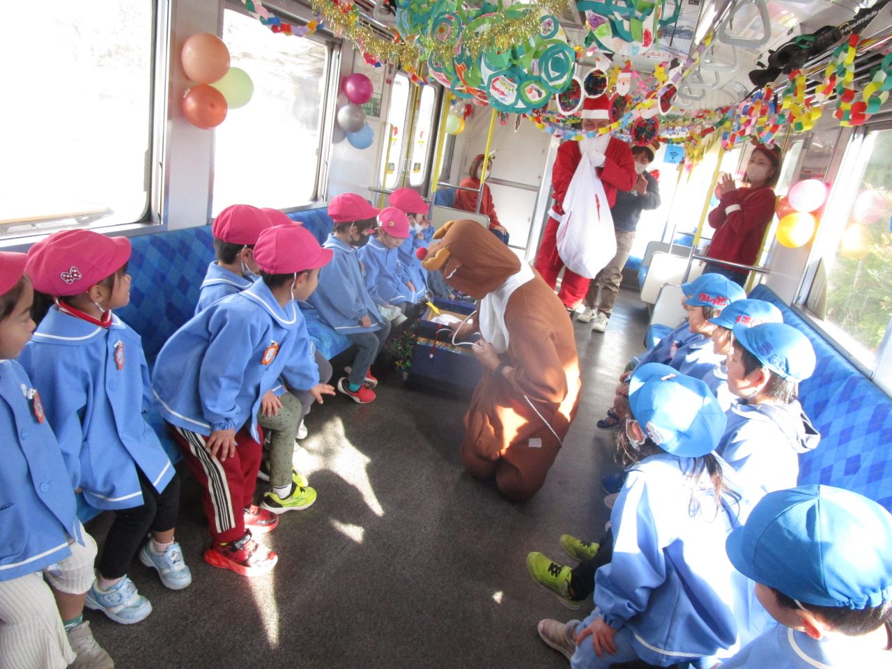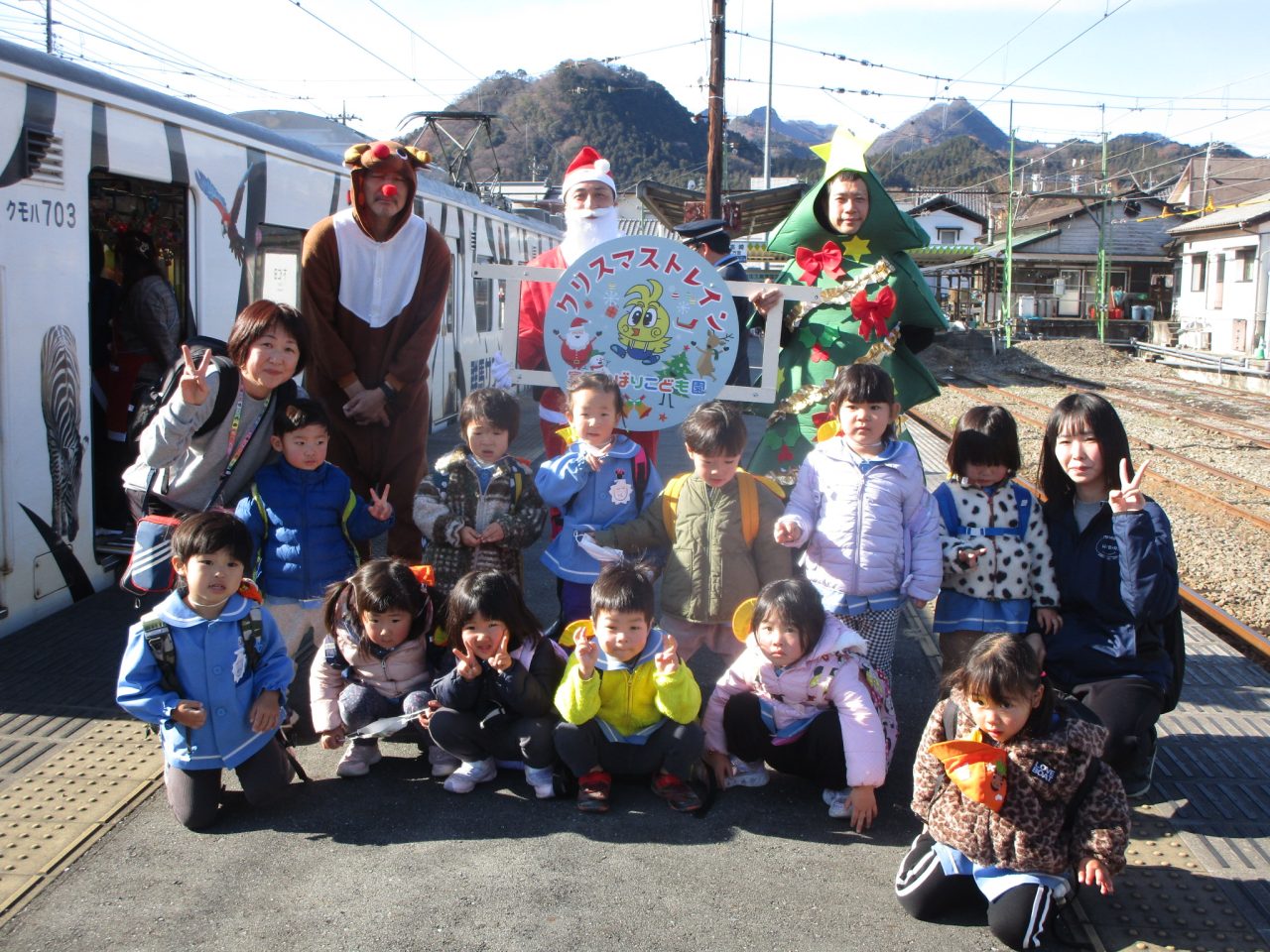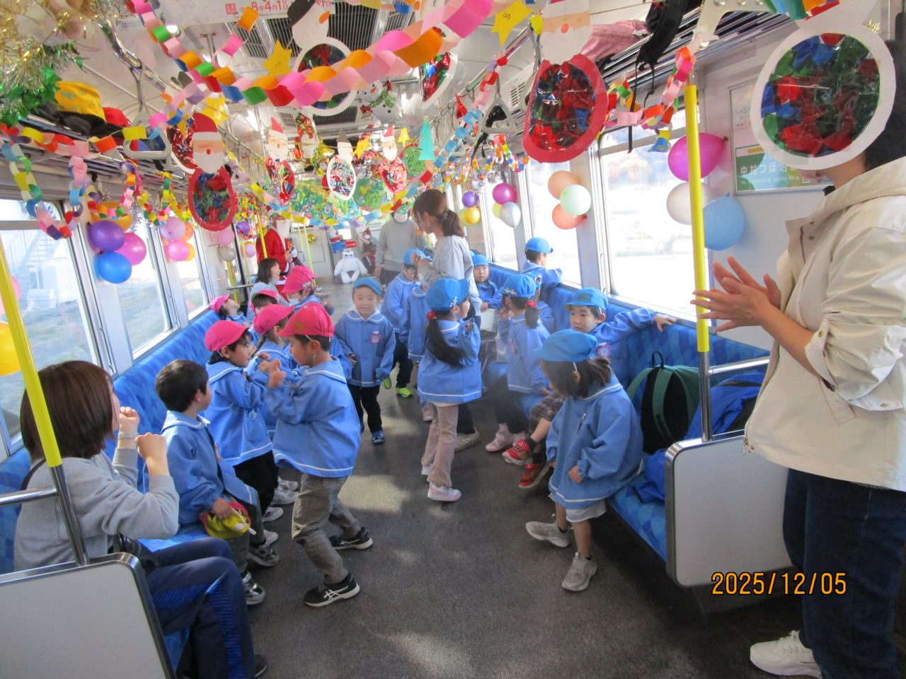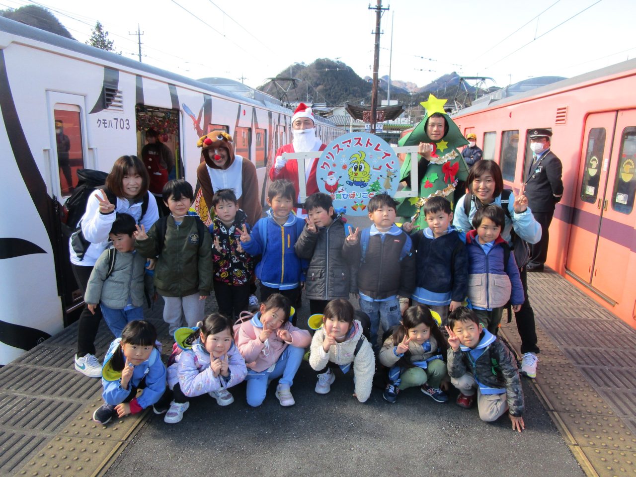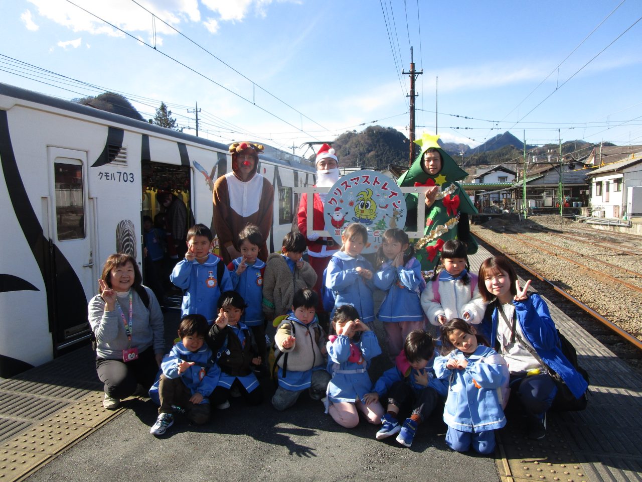 12月5日(金)毎年恒例の『ひばり号クリスマストレイン特別臨時列車』に乗って、下仁田駅まで行ってきました。新しいサファリ電車がひばり号に飾り付けられて富岡駅のホームに入ってくると子どもたちから大歓声が沸き上がりました‼電車の中は、たんぽぽ組さんからクラスごとに作った飾りや輪つなぎで🎄クリスマスムード一面。ちゅうりっぷ組もコスモス組も初めはちょっと緊張していたけれど🎅サンタさんにプレゼント🎁をもらって😊にこにこに・・・荷物の重そうなトナカイさん🦌に「がんばれー!」と応援して、サンタさんに「メリークリスマス、ありがとう」とお話ししたり、歌を歌ったりしながら下仁田駅へ到着🚃