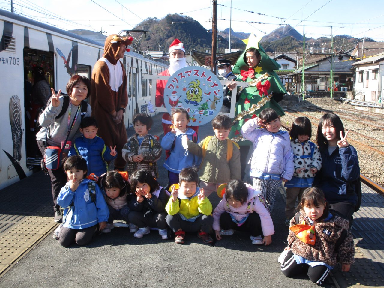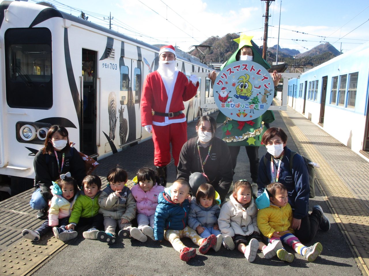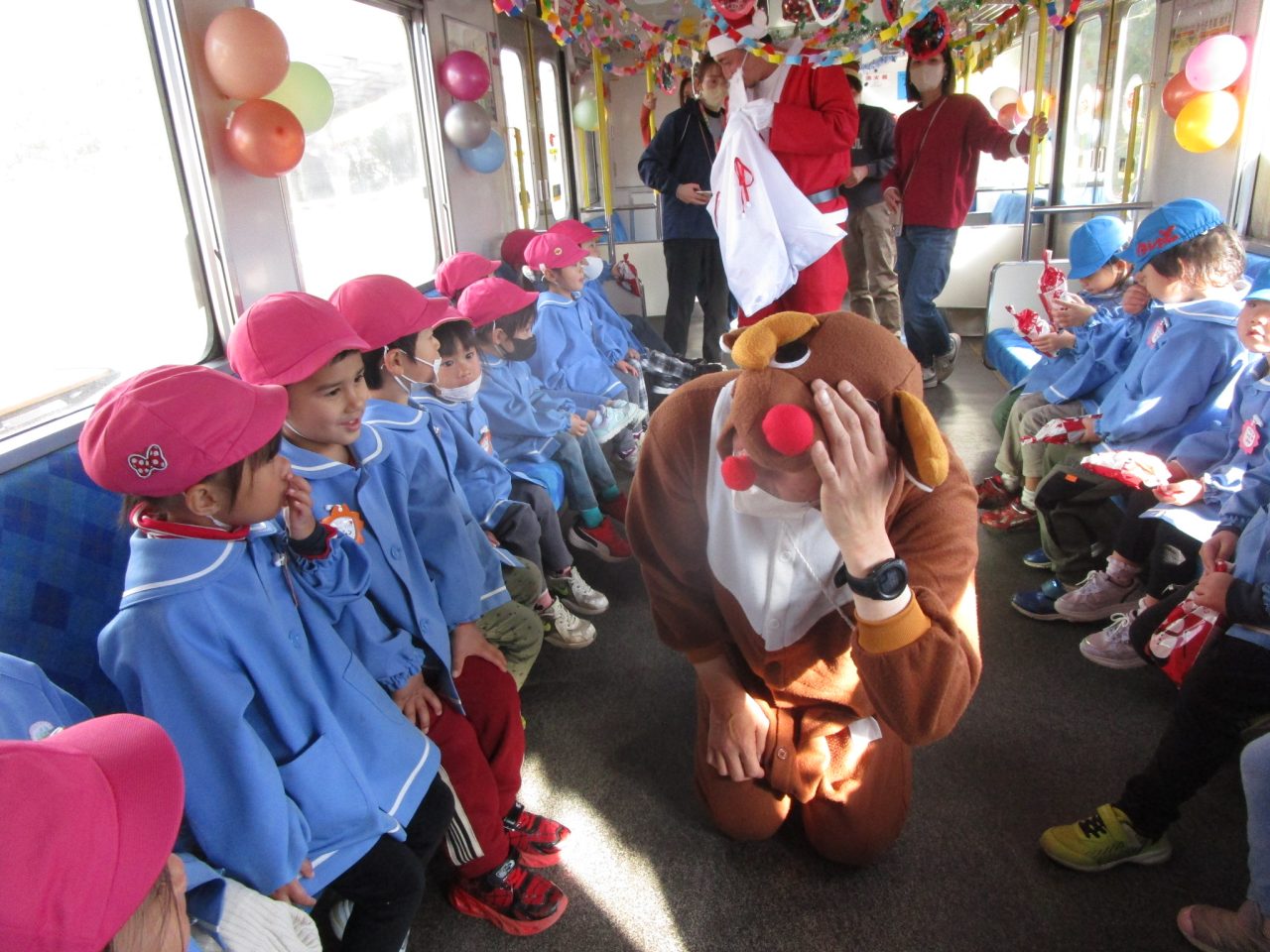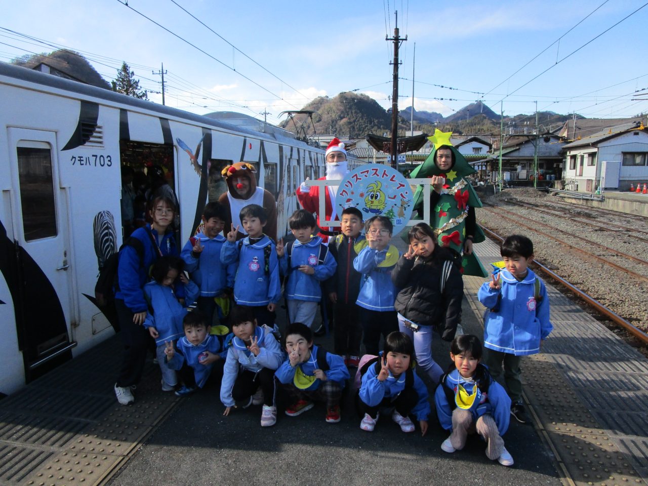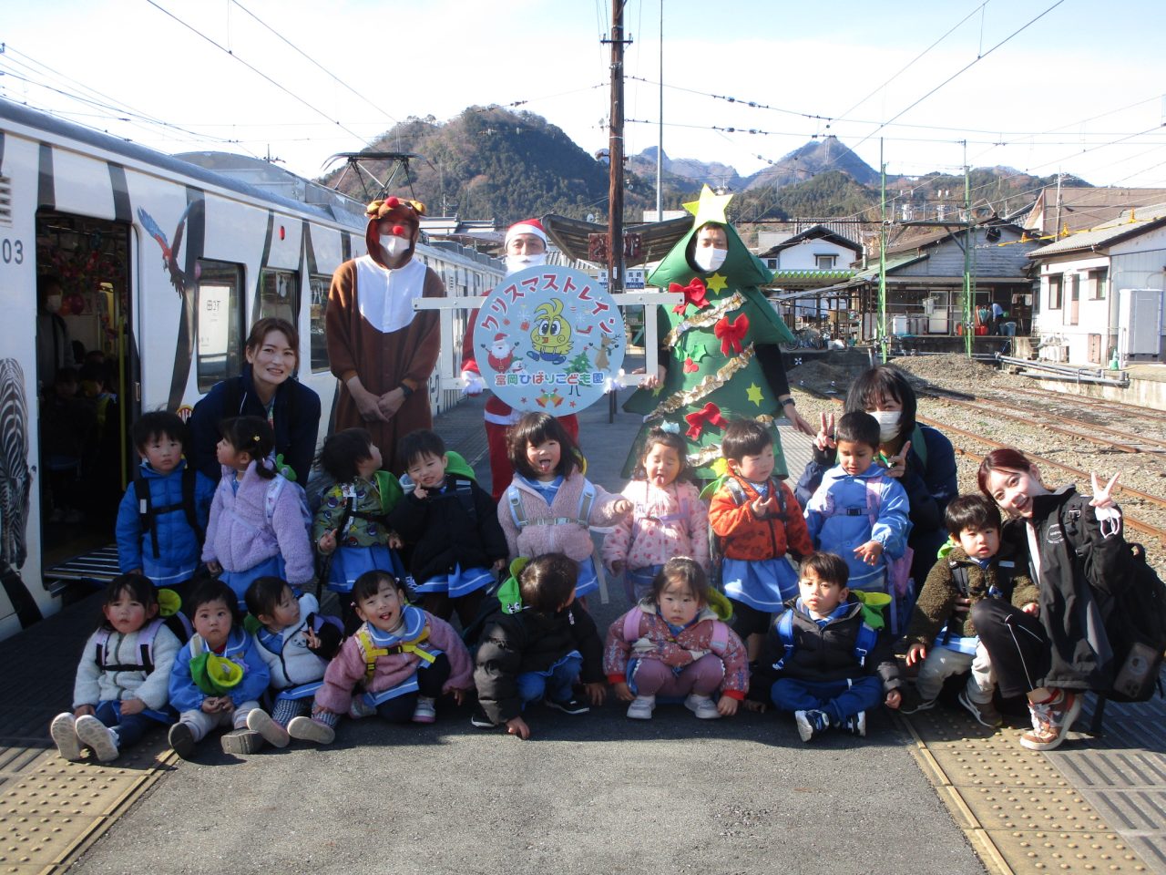 12月5日(金)毎年恒例の『ひばり号クリスマストレイン特別臨時列車』に乗って、下仁田駅まで行ってきました。新しいサファリ電車がひばり号に飾り付けられて富岡駅のホームに入ってくると子どもたちから大歓声が沸き上がりました‼電車の中は、たんぽぽ組さんからクラスごとに作った飾りや輪つなぎで🎄クリスマスムード一面。ちゅうりっぷ組もコスモス組も初めはちょっと緊張していたけれど🎅サンタさんにプレゼント🎁をもらって😊にこにこに・・・荷物の重そうなトナカイさん🦌に「がんばれー!」と応援して、サンタさんに「メリークリスマス、ありがとう」とお話ししたり、歌を歌ったりしながら下仁田駅へ到着🚃