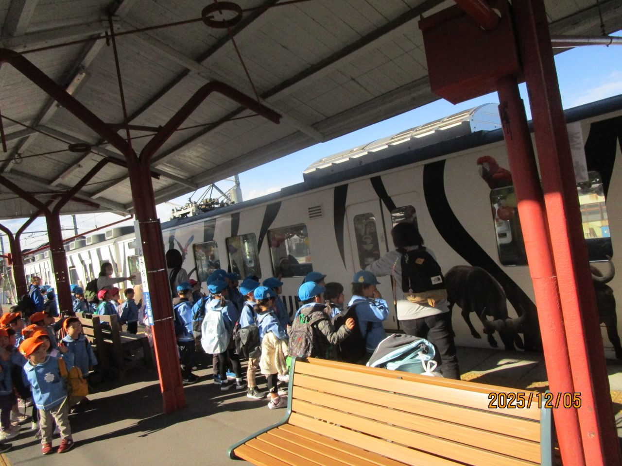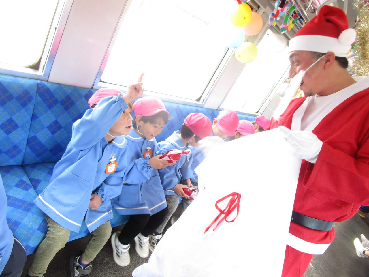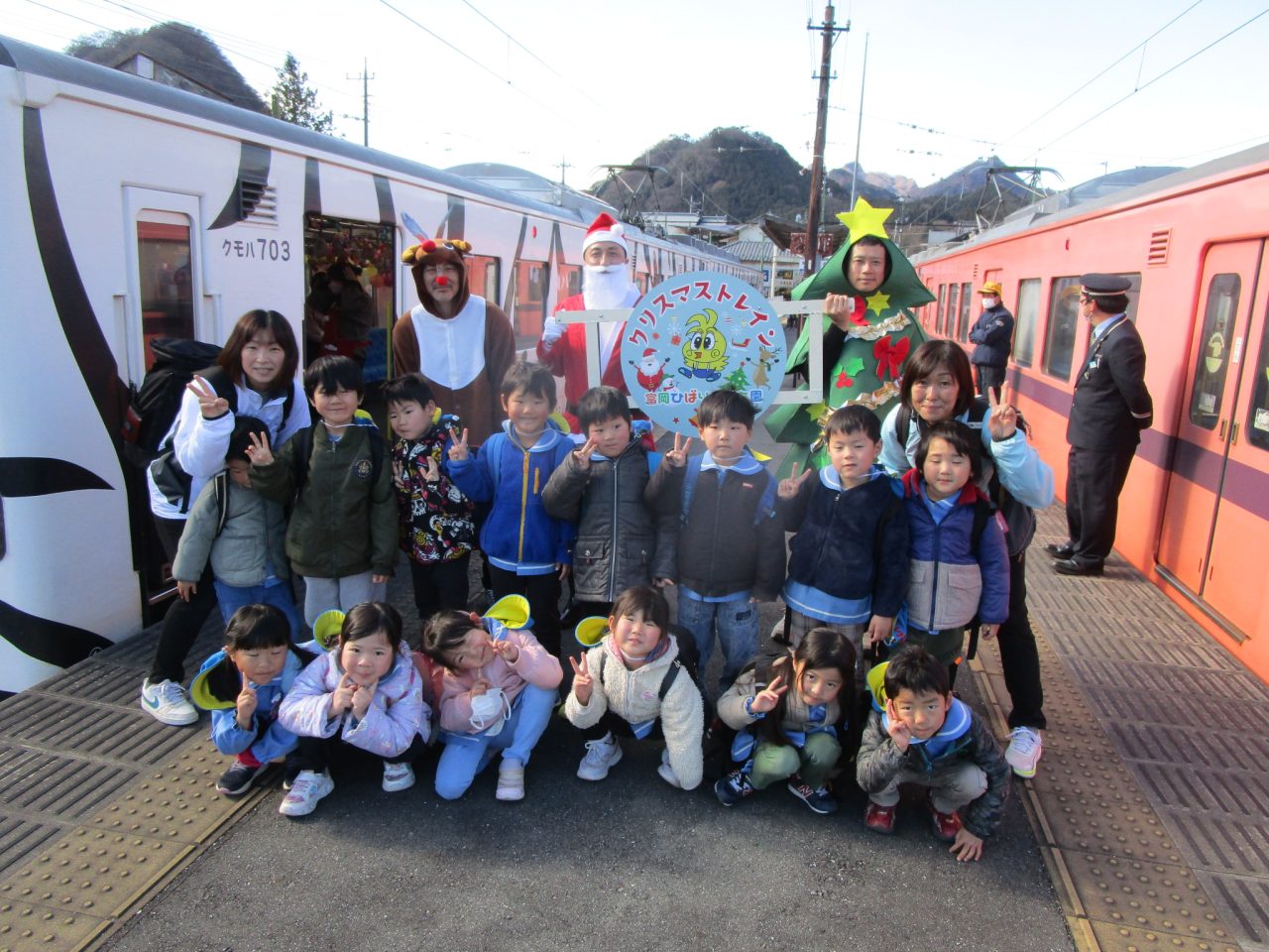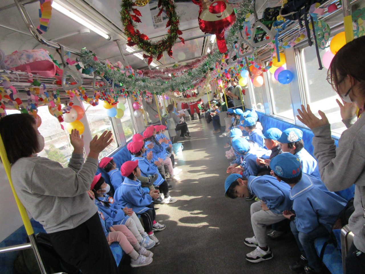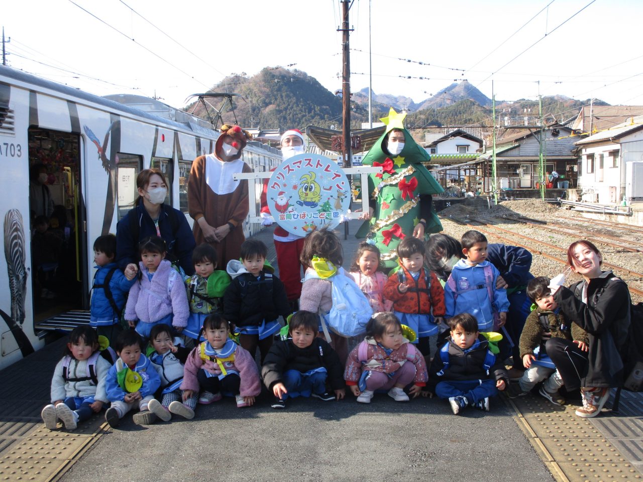 12月5日(金)毎年恒例の『ひばり号クリスマストレイン特別臨時列車』に乗って、下仁田駅まで行ってきました。新しいサファリ電車がひばり号に飾り付けられて富岡駅のホームに入ってくると子どもたちから大歓声が沸き上がりました‼電車の中は、たんぽぽ組さんからクラスごとに作った飾りや輪つなぎで🎄クリスマスムード一面。ちゅうりっぷ組もコスモス組も初めはちょっと緊張していたけれど🎅サンタさんにプレゼント🎁をもらって😊にこにこに・・・荷物の重そうなトナカイさん🦌に「がんばれー!」と応援して、サンタさんに「メリークリスマス、ありがとう」とお話ししたり、歌を歌ったりしながら下仁田駅へ到着🚃