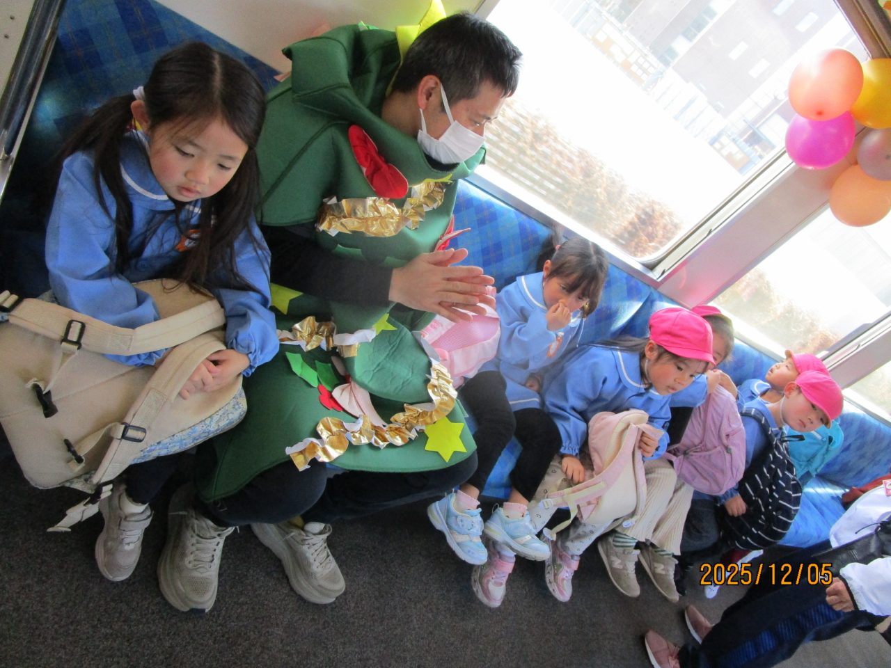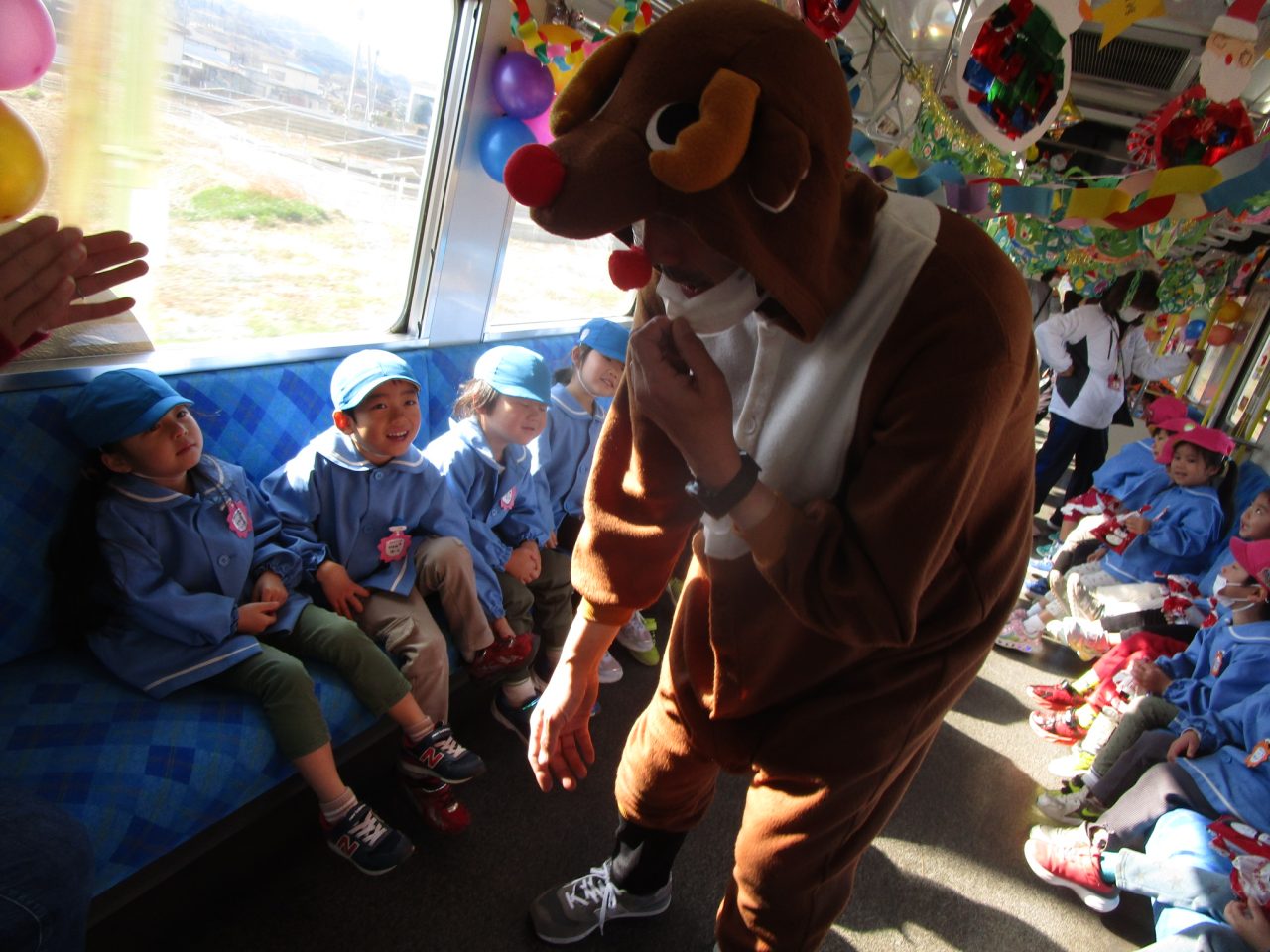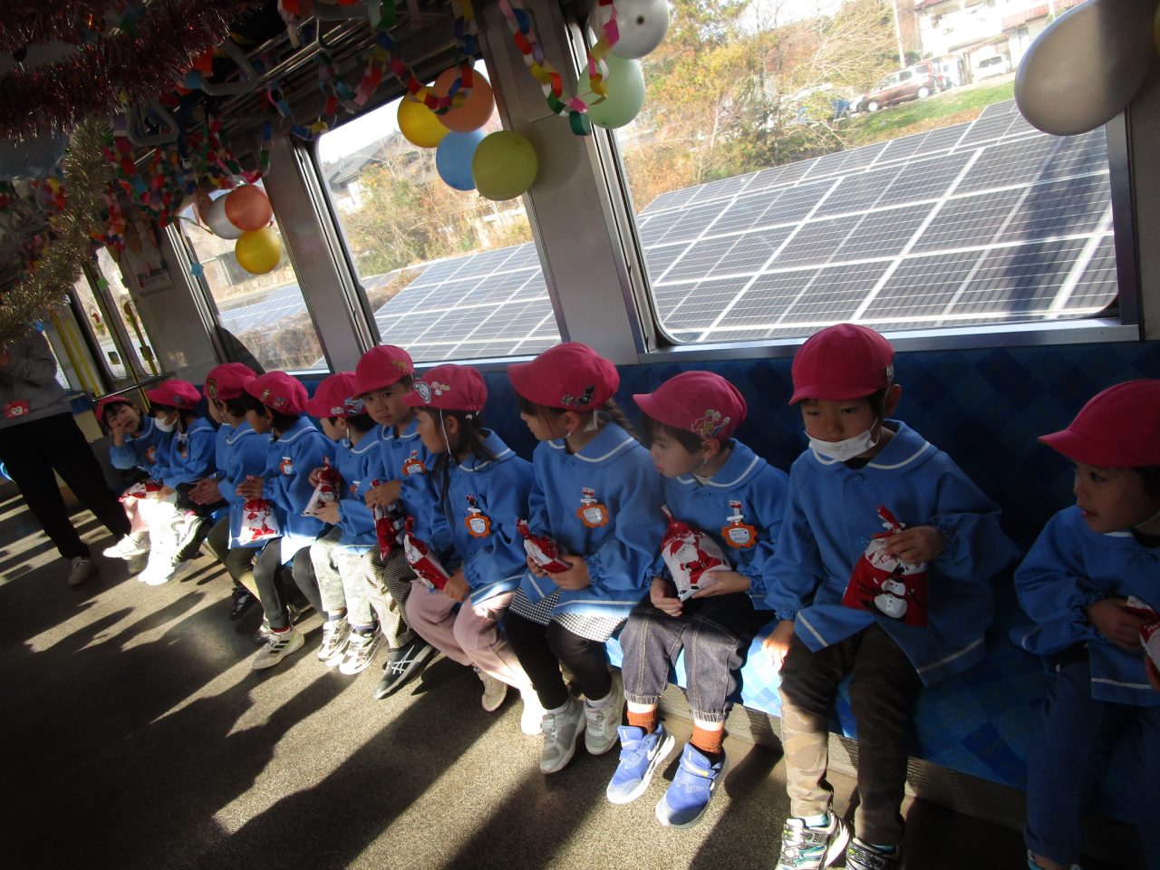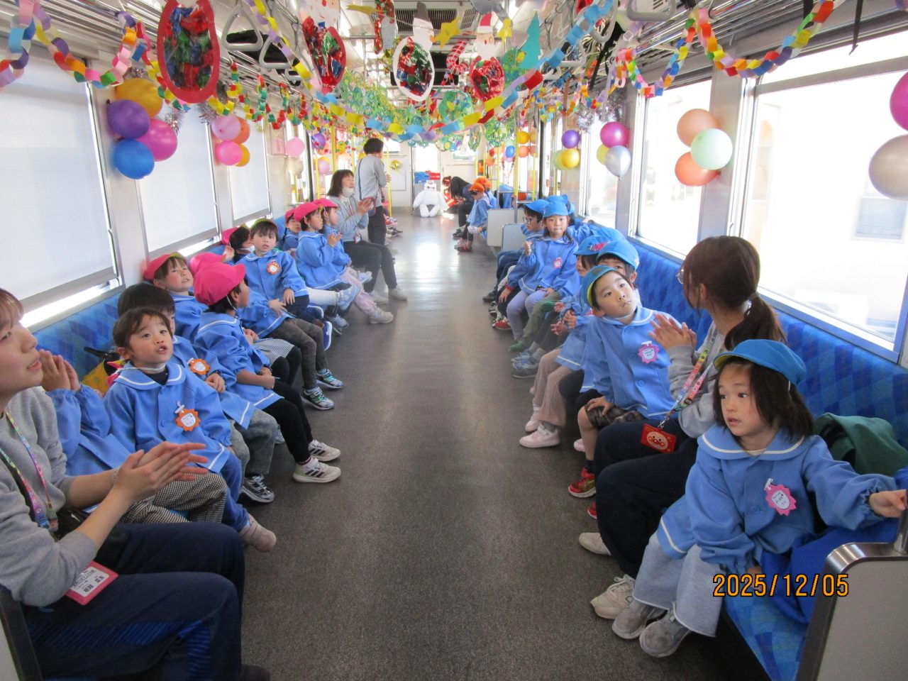 12月5日(金)毎年恒例の『ひばり号クリスマストレイン特別臨時列車』に乗って、下仁田駅まで行ってきました。新しいサファリ電車がひばり号に飾り付けられて富岡駅のホームに入ってくると子どもたちから大歓声が沸き上がりました‼電車の中は、たんぽぽ組さんからクラスごとに作った飾りや輪つなぎで🎄クリスマスムード一面。ちゅうりっぷ組もコスモス組も初めはちょっと緊張していたけれど🎅サンタさんにプレゼント🎁をもらって😊にこにこに・・・荷物の重そうなトナカイさん🦌に「がんばれー!」と応援して、サンタさんに「メリークリスマス、ありがとう」とお話ししたり、歌を歌ったりしながら下仁田駅へ到着🚃