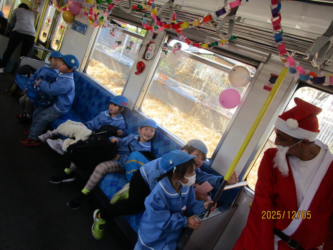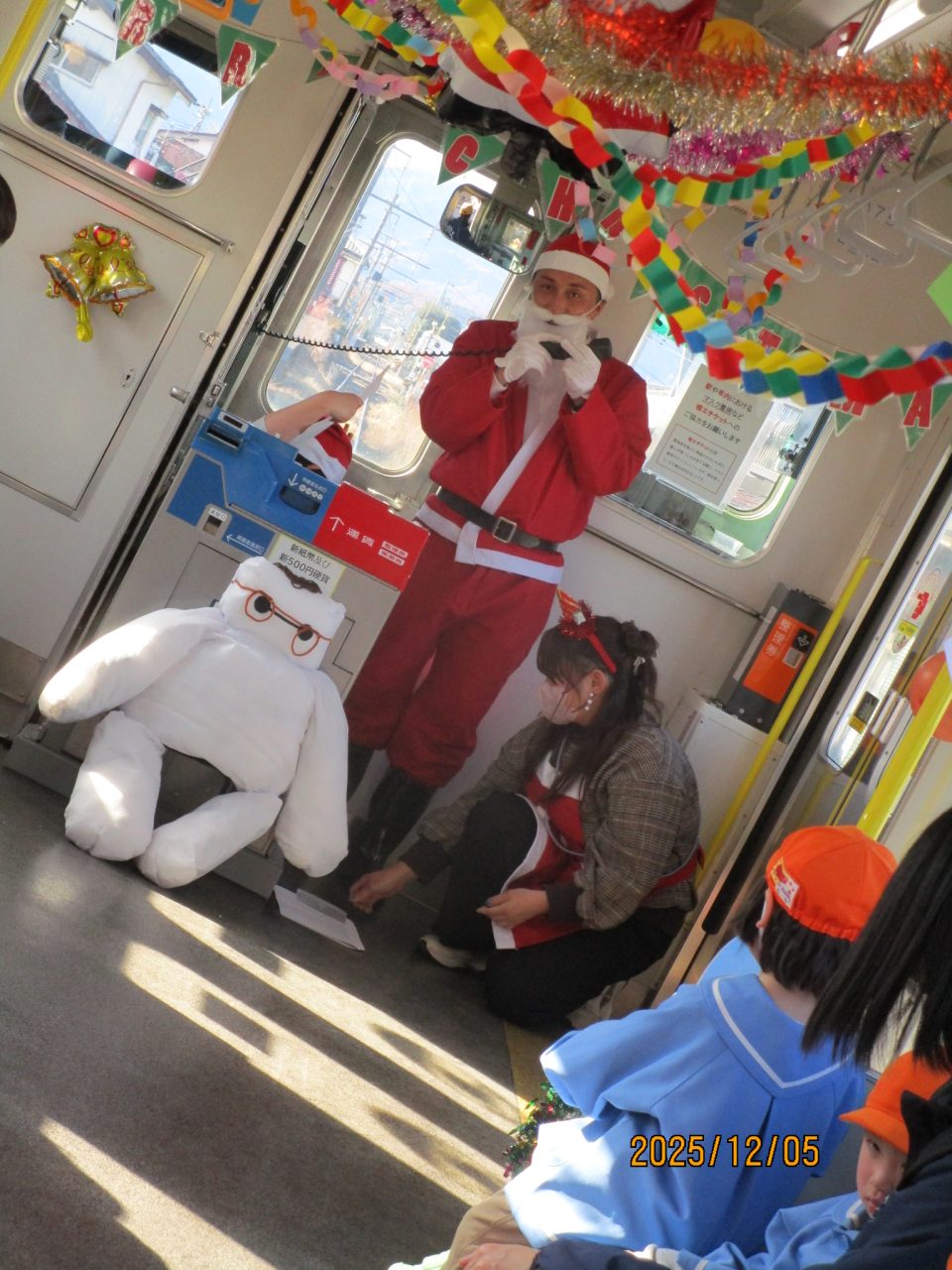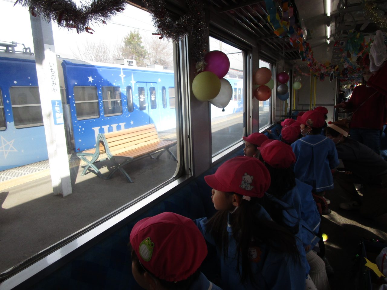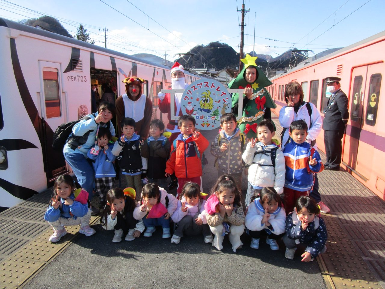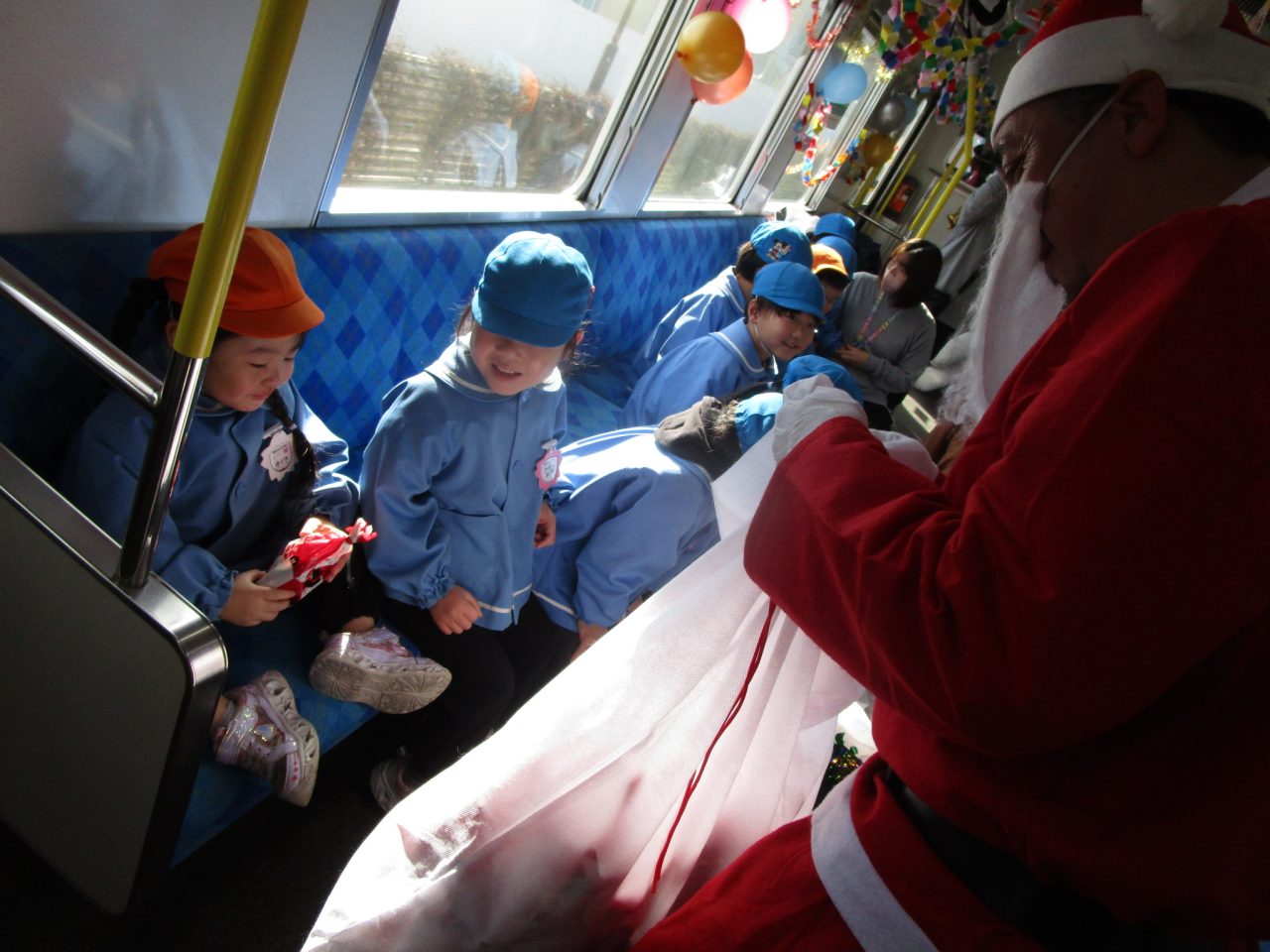 12月5日(金)毎年恒例の『ひばり号クリスマストレイン特別臨時列車』に乗って、下仁田駅まで行ってきました。新しいサファリ電車がひばり号に飾り付けられて富岡駅のホームに入ってくると子どもたちから大歓声が沸き上がりました‼電車の中は、たんぽぽ組さんからクラスごとに作った飾りや輪つなぎで🎄クリスマスムード一面。ちゅうりっぷ組もコスモス組も初めはちょっと緊張していたけれど🎅サンタさんにプレゼント🎁をもらって😊にこにこに・・・荷物の重そうなトナカイさん🦌に「がんばれー!」と応援して、サンタさんに「メリークリスマス、ありがとう」とお話ししたり、歌を歌ったりしながら下仁田駅へ到着🚃