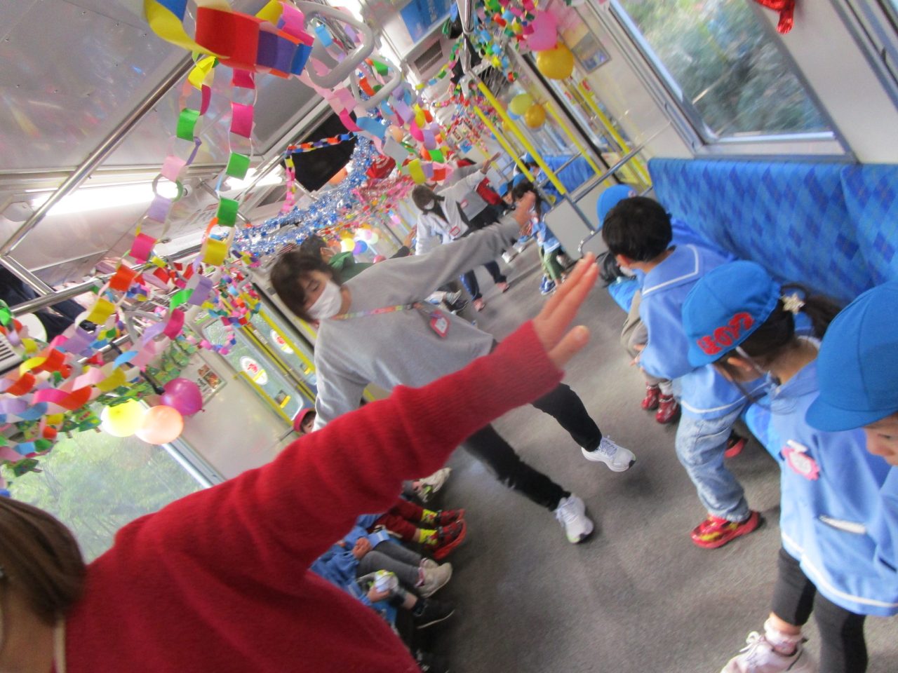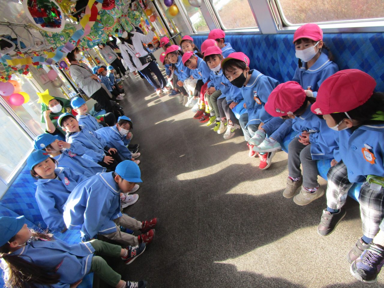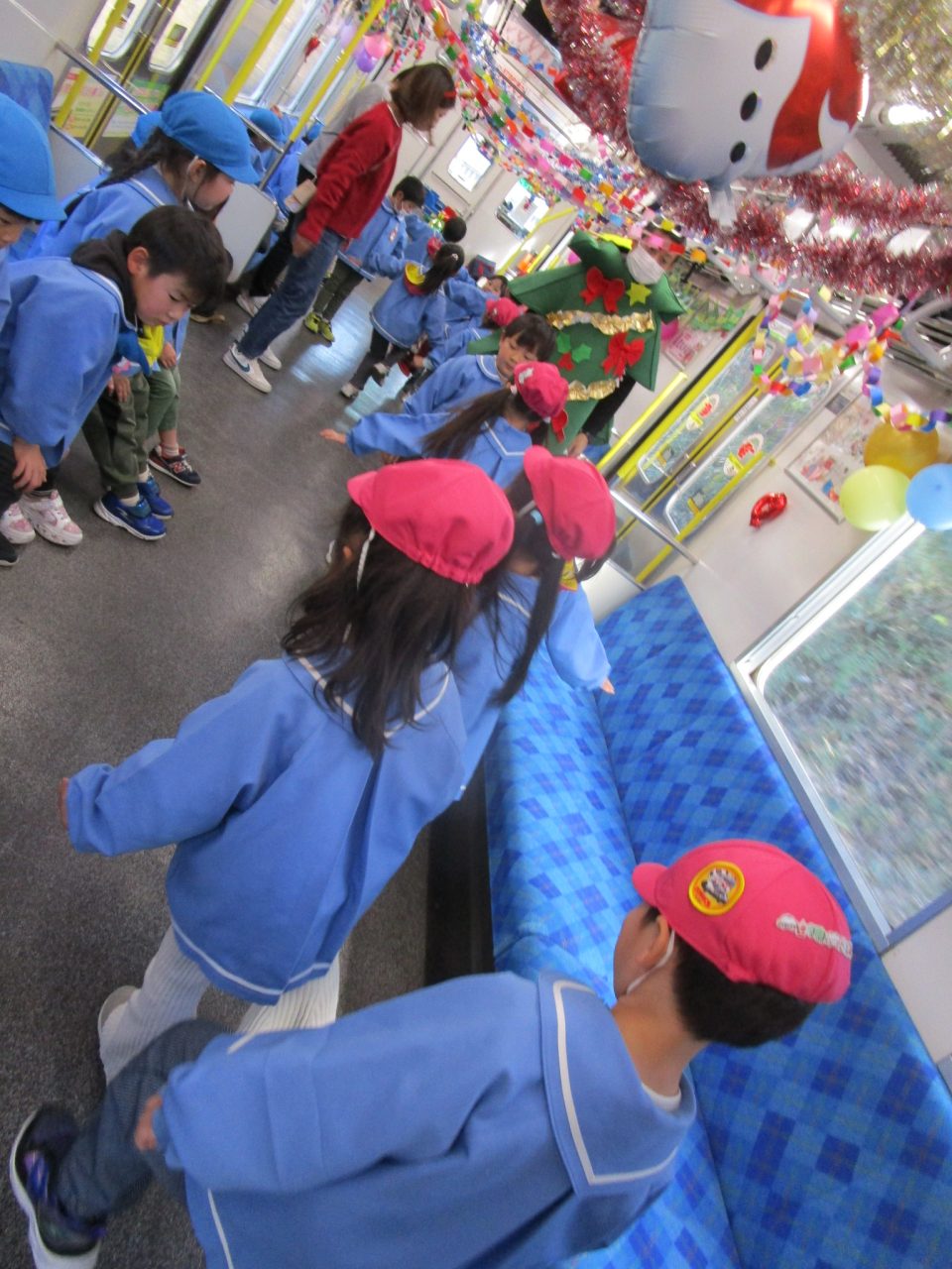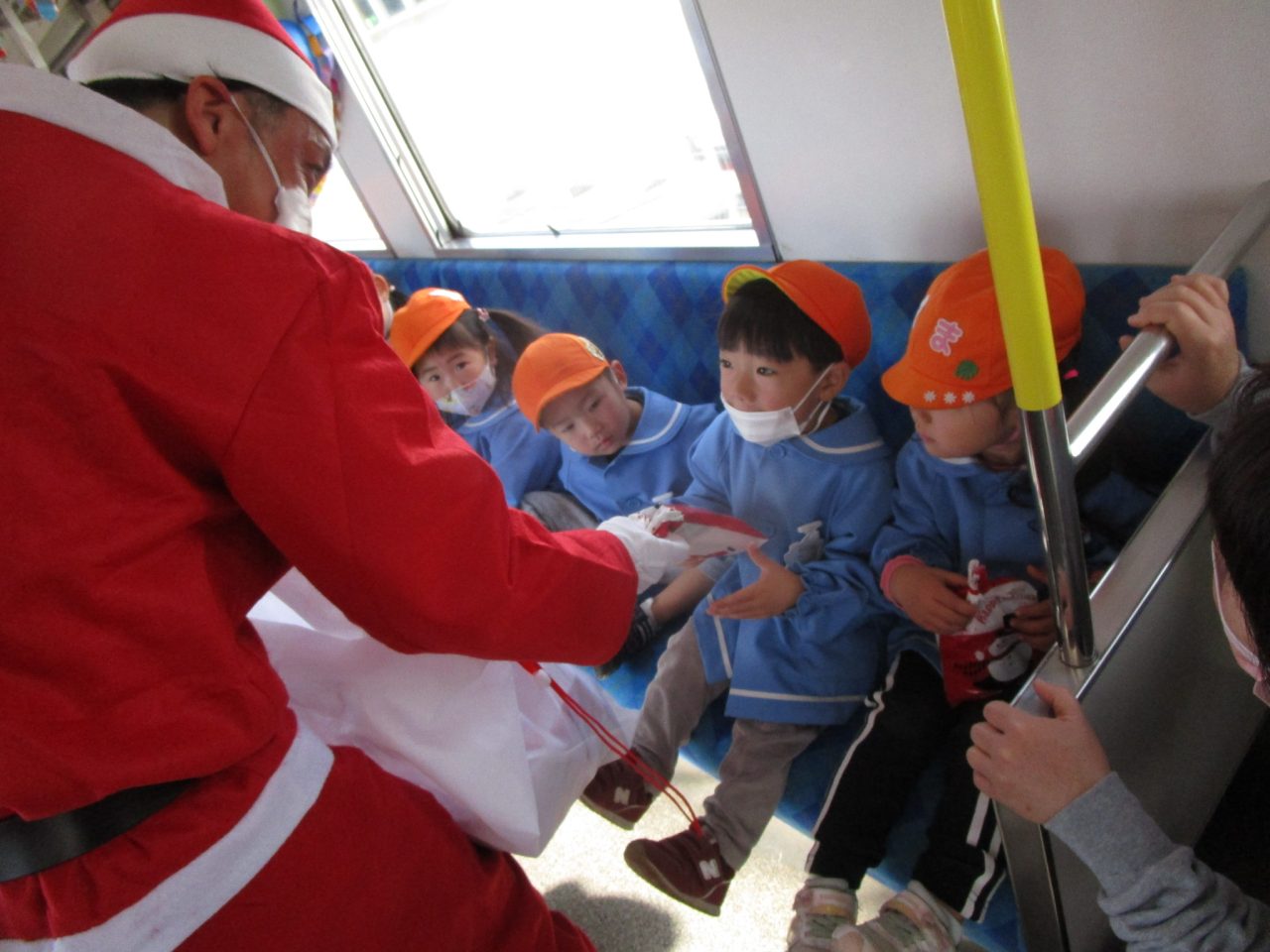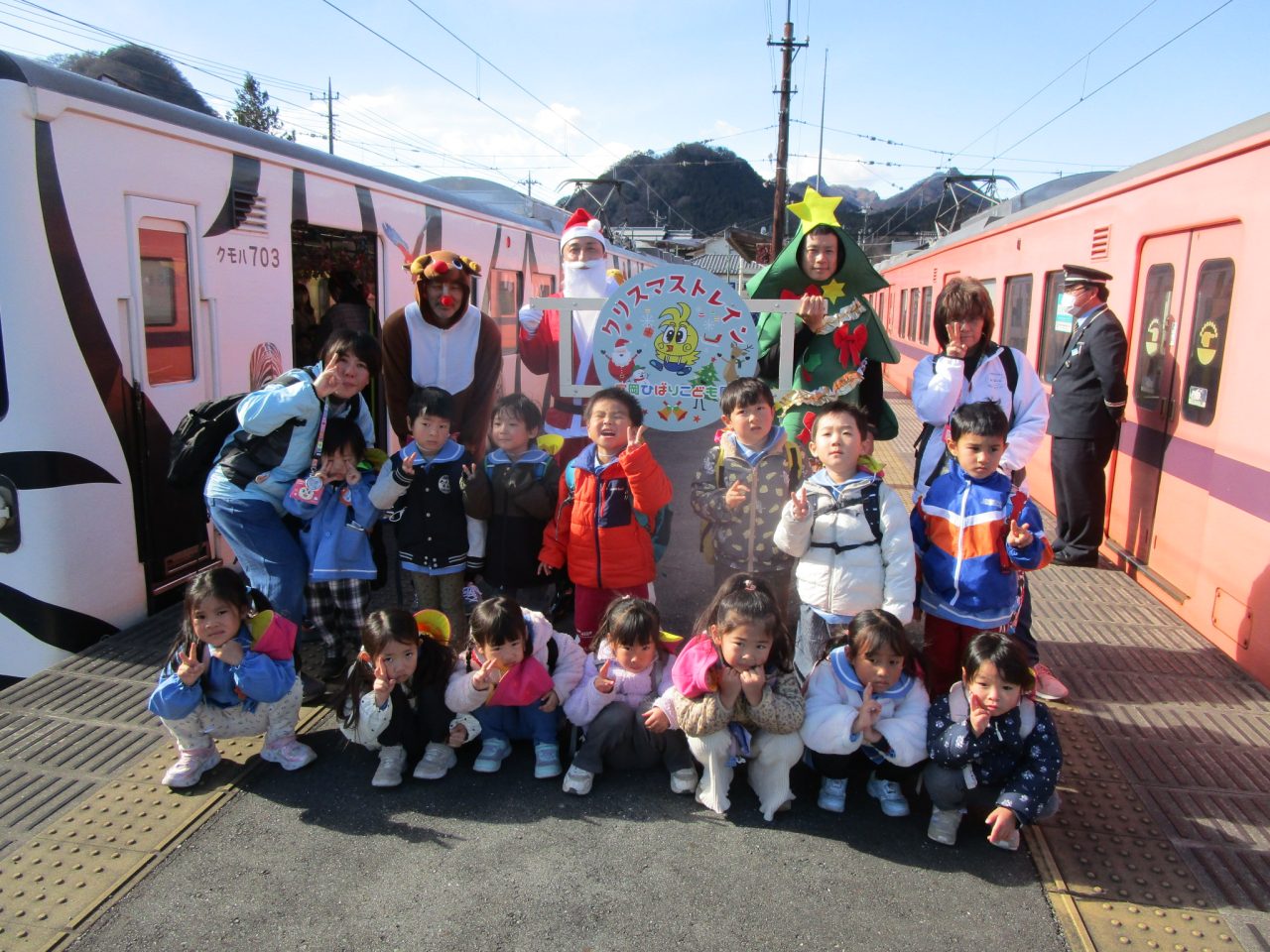 12月5日(金)毎年恒例の『ひばり号クリスマストレイン特別臨時列車』に乗って、下仁田駅まで行ってきました。新しいサファリ電車がひばり号に飾り付けられて富岡駅のホームに入ってくると子どもたちから大歓声が沸き上がりました‼電車の中は、たんぽぽ組さんからクラスごとに作った飾りや輪つなぎで🎄クリスマスムード一面。ちゅうりっぷ組もコスモス組も初めはちょっと緊張していたけれど🎅サンタさんにプレゼント🎁をもらって😊にこにこに・・・荷物の重そうなトナカイさん🦌に「がんばれー!」と応援して、サンタさんに「メリークリスマス、ありがとう」とお話ししたり、歌を歌ったりしながら下仁田駅へ到着🚃