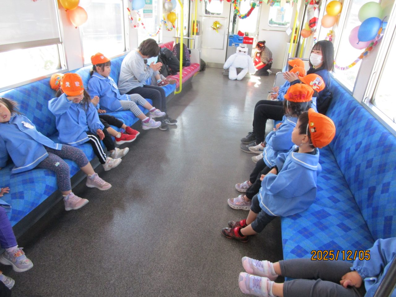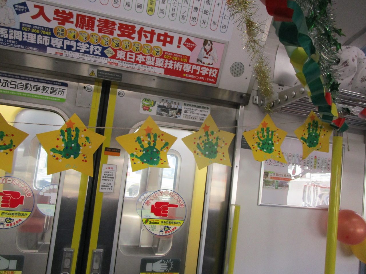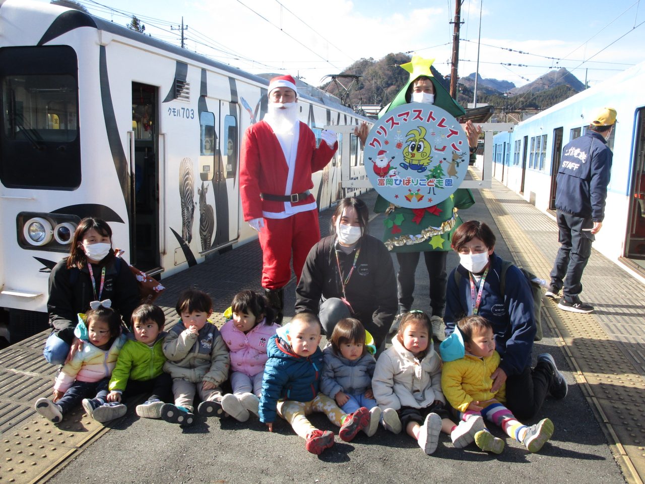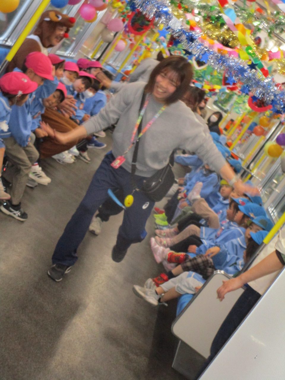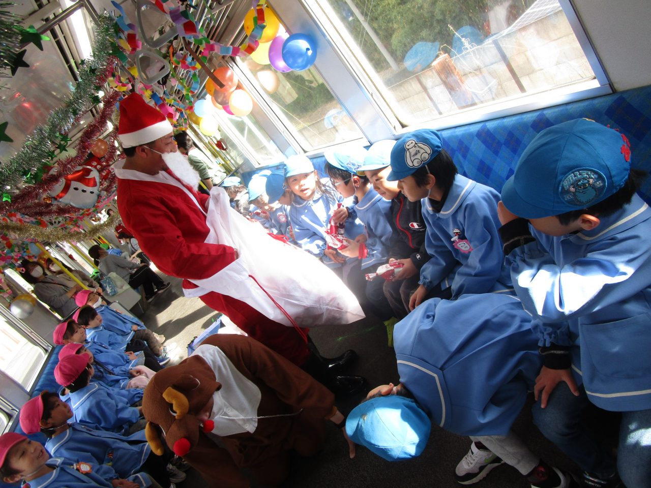 12月5日(金)毎年恒例の『ひばり号クリスマストレイン特別臨時列車』に乗って、下仁田駅まで行ってきました。新しいサファリ電車がひばり号に飾り付けられて富岡駅のホームに入ってくると子どもたちから大歓声が沸き上がりました‼電車の中は、たんぽぽ組さんからクラスごとに作った飾りや輪つなぎで🎄クリスマスムード一面。ちゅうりっぷ組もコスモス組も初めはちょっと緊張していたけれど🎅サンタさんにプレゼント🎁をもらって😊にこにこに・・・荷物の重そうなトナカイさん🦌に「がんばれー!」と応援して、サンタさんに「メリークリスマス、ありがとう」とお話ししたり、歌を歌ったりしながら下仁田駅へ到着🚃