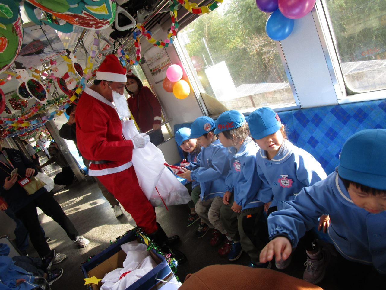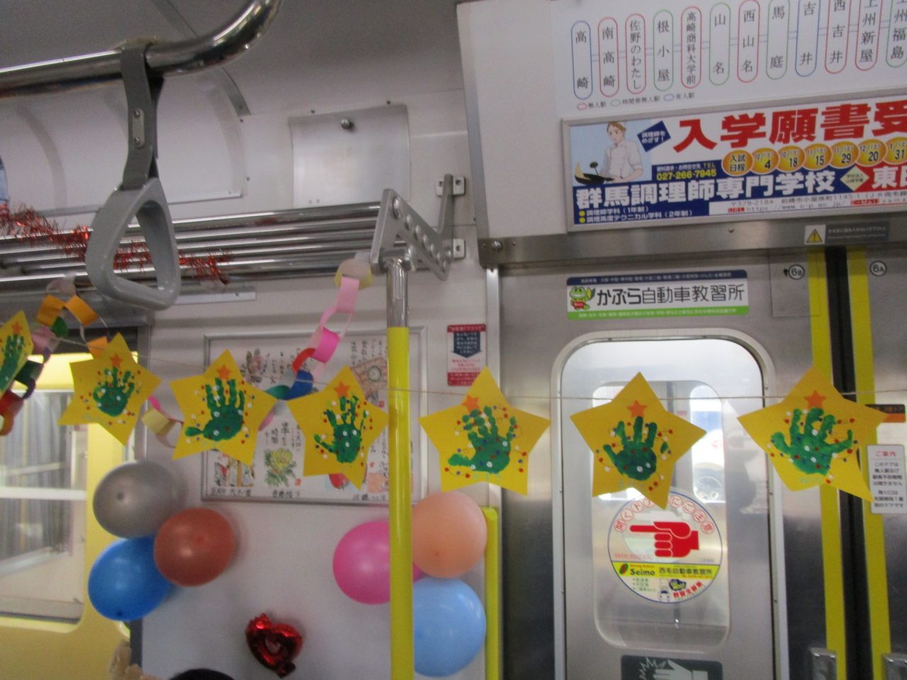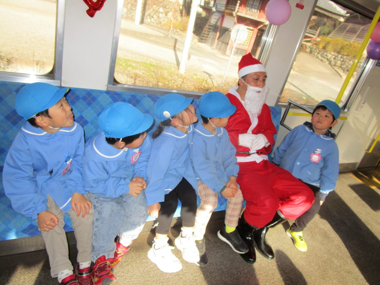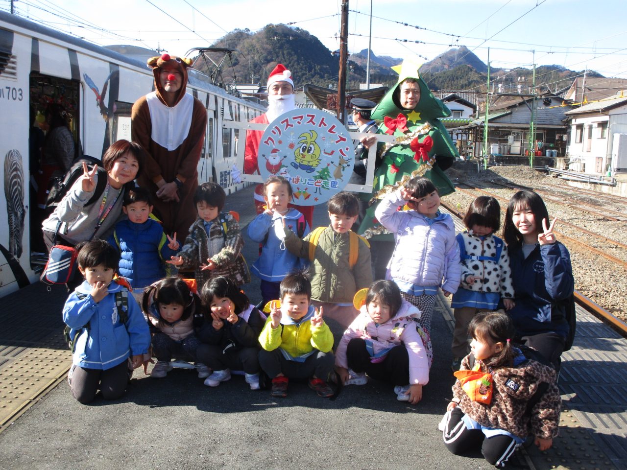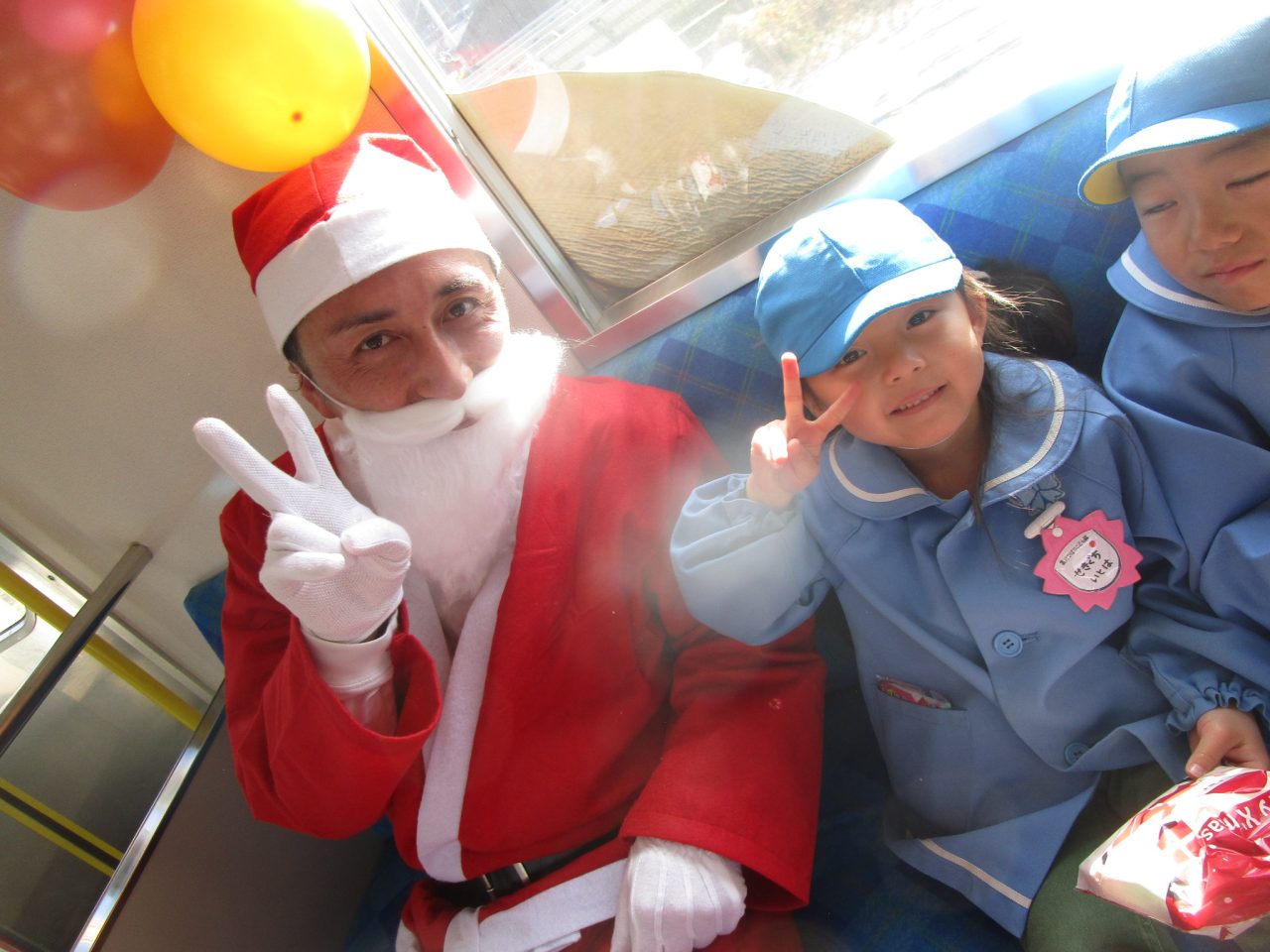12月5日(金)毎年恒例の『ひばり号クリスマストレイン特別臨時列車』に乗って、下仁田駅まで行ってきました。新しいサファリ電車がひばり号に飾り付けられて富岡駅のホームに入ってくると子どもたちから大歓声が沸き上がりました‼電車の中は、たんぽぽ組さんからクラスごとに作った飾りや輪つなぎで🎄クリスマスムード一面。ちゅうりっぷ組もコスモス組も初めはちょっと緊張していたけれど🎅サンタさんにプレゼント🎁をもらって😊にこにこに・・・荷物の重そうなトナカイさん🦌に「がんばれー!」と応援して、サンタさんに「メリークリスマス、ありがとう」とお話ししたり、歌を歌ったりしながら下仁田駅へ到着🚃