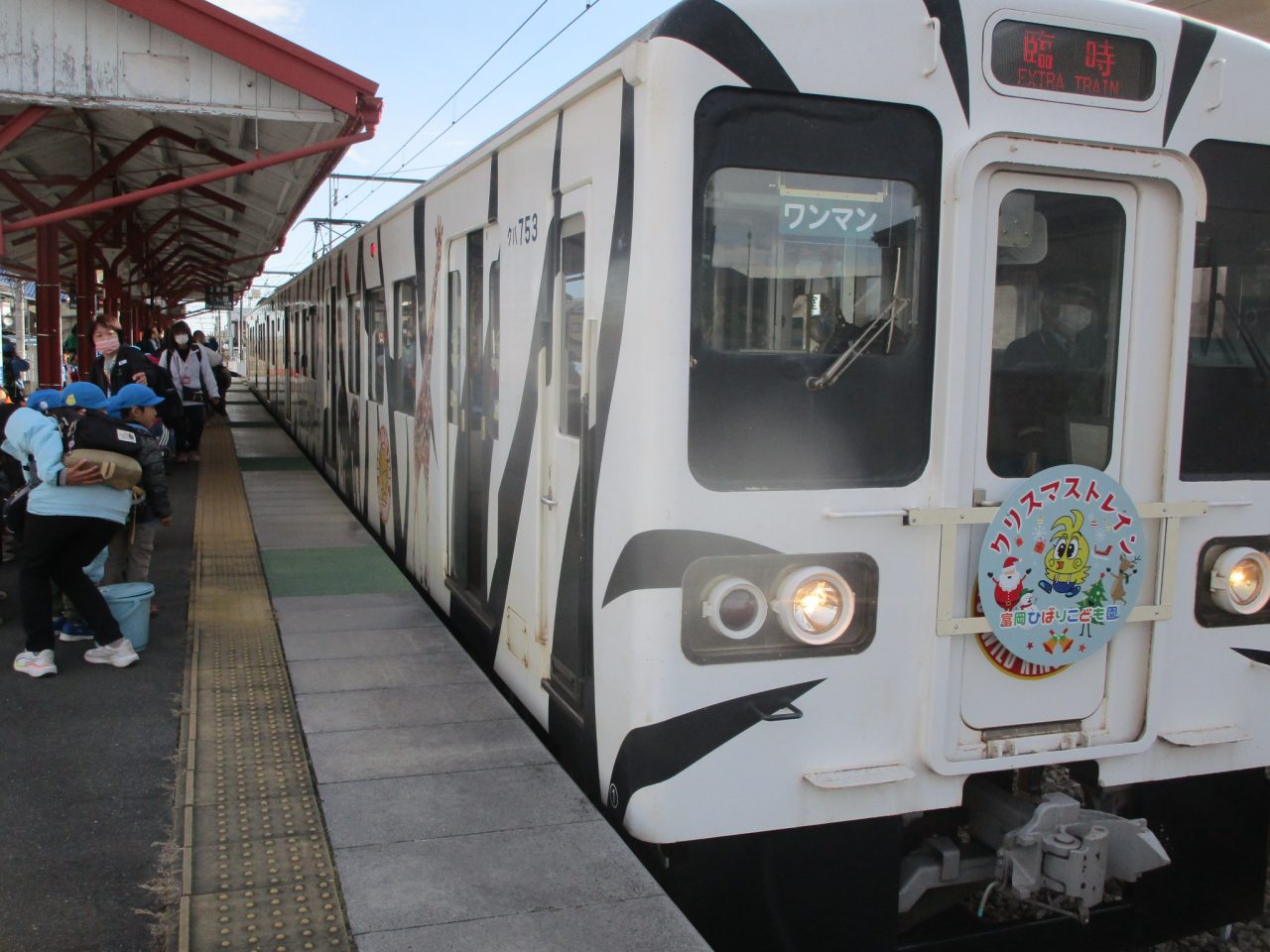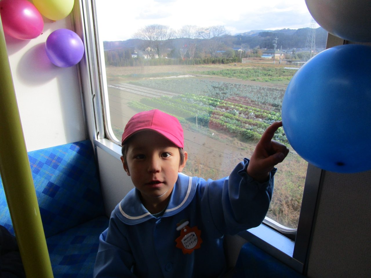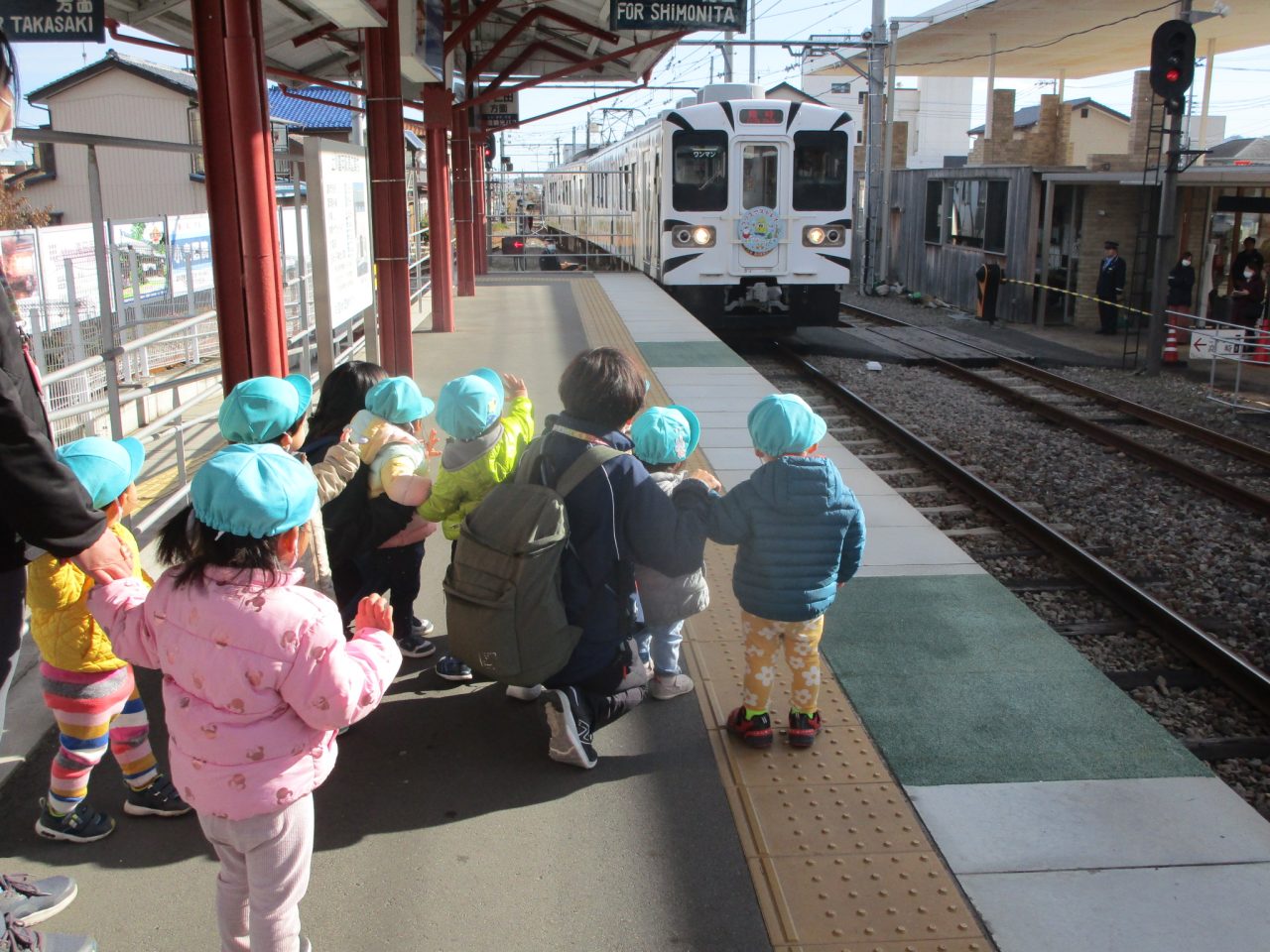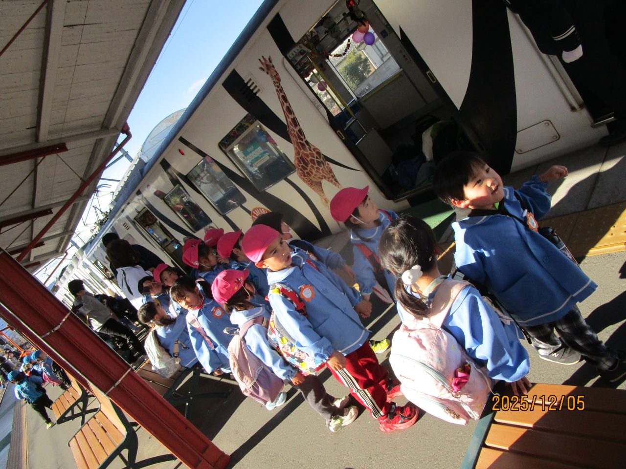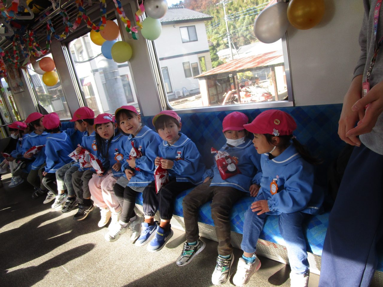 12月5日(金)毎年恒例の『ひばり号クリスマストレイン特別臨時列車』に乗って、下仁田駅まで行ってきました。新しいサファリ電車がひばり号に飾り付けられて富岡駅のホームに入ってくると子どもたちから大歓声が沸き上がりました‼電車の中は、たんぽぽ組さんからクラスごとに作った飾りや輪つなぎで🎄クリスマスムード一面。ちゅうりっぷ組もコスモス組も初めはちょっと緊張していたけれど🎅サンタさんにプレゼント🎁をもらって😊にこにこに・・・荷物の重そうなトナカイさん🦌に「がんばれー!」と応援して、サンタさんに「メリークリスマス、ありがとう」とお話ししたり、歌を歌ったりしながら下仁田駅へ到着🚃