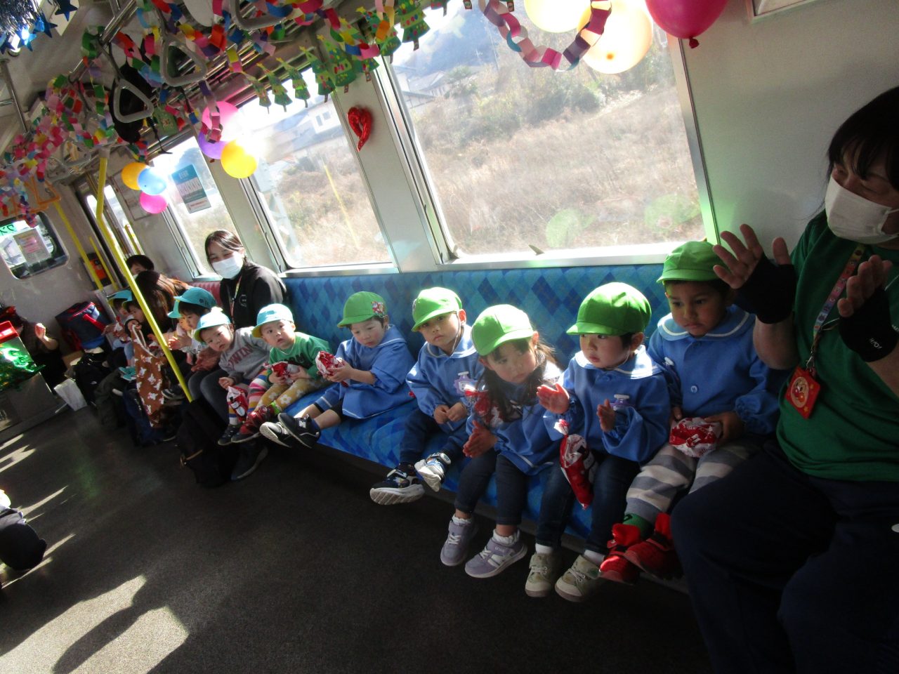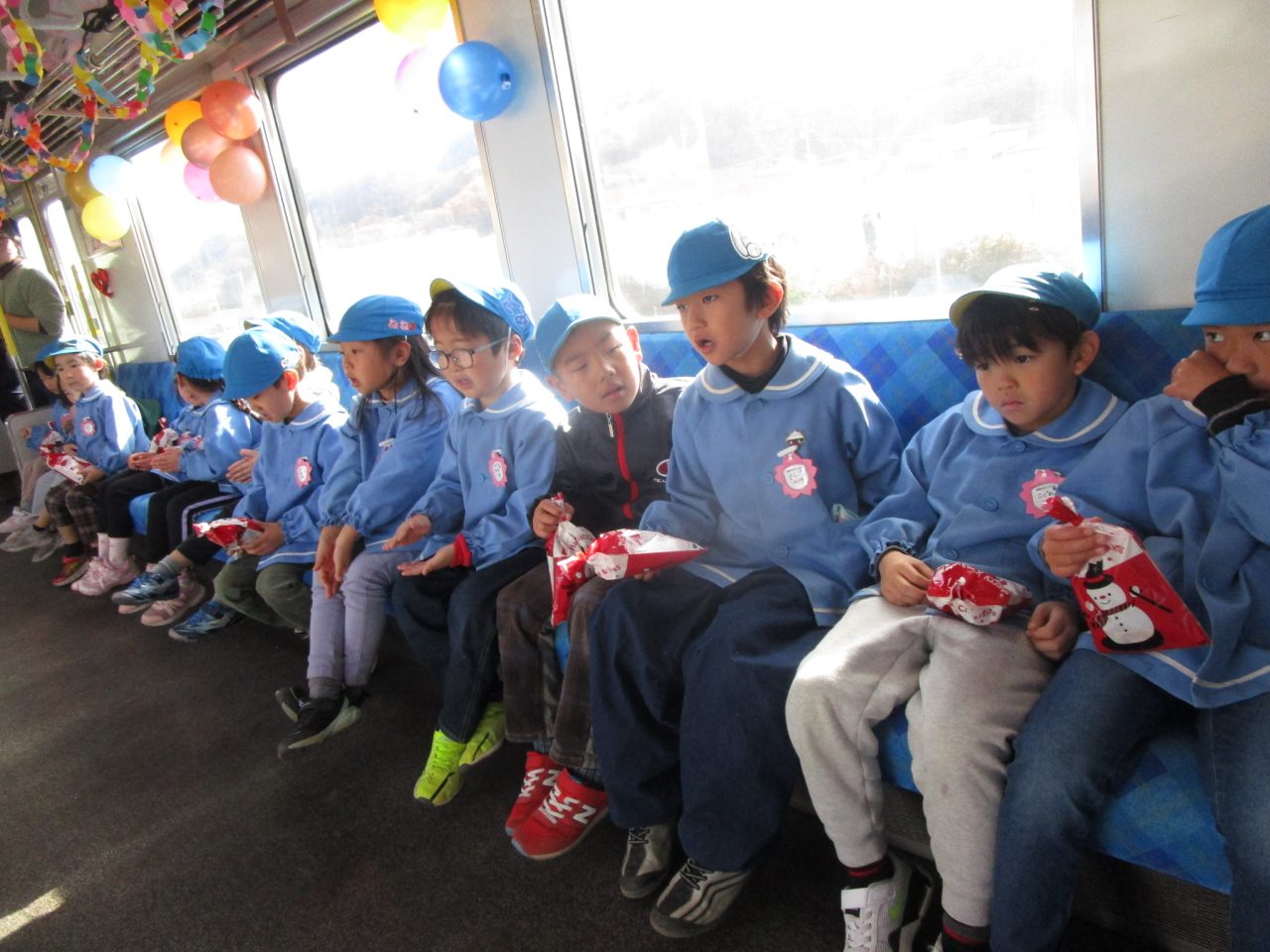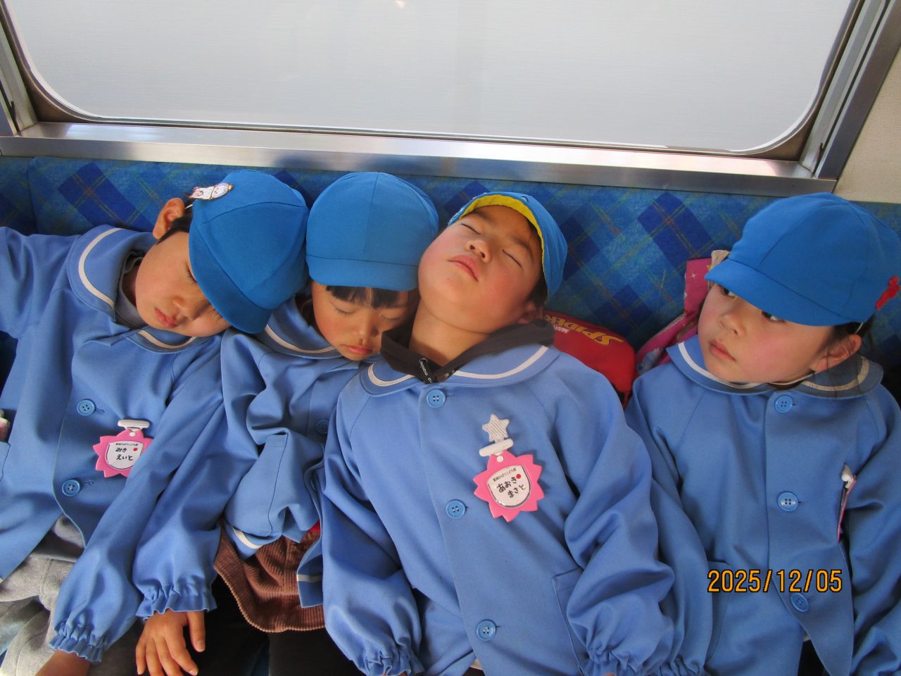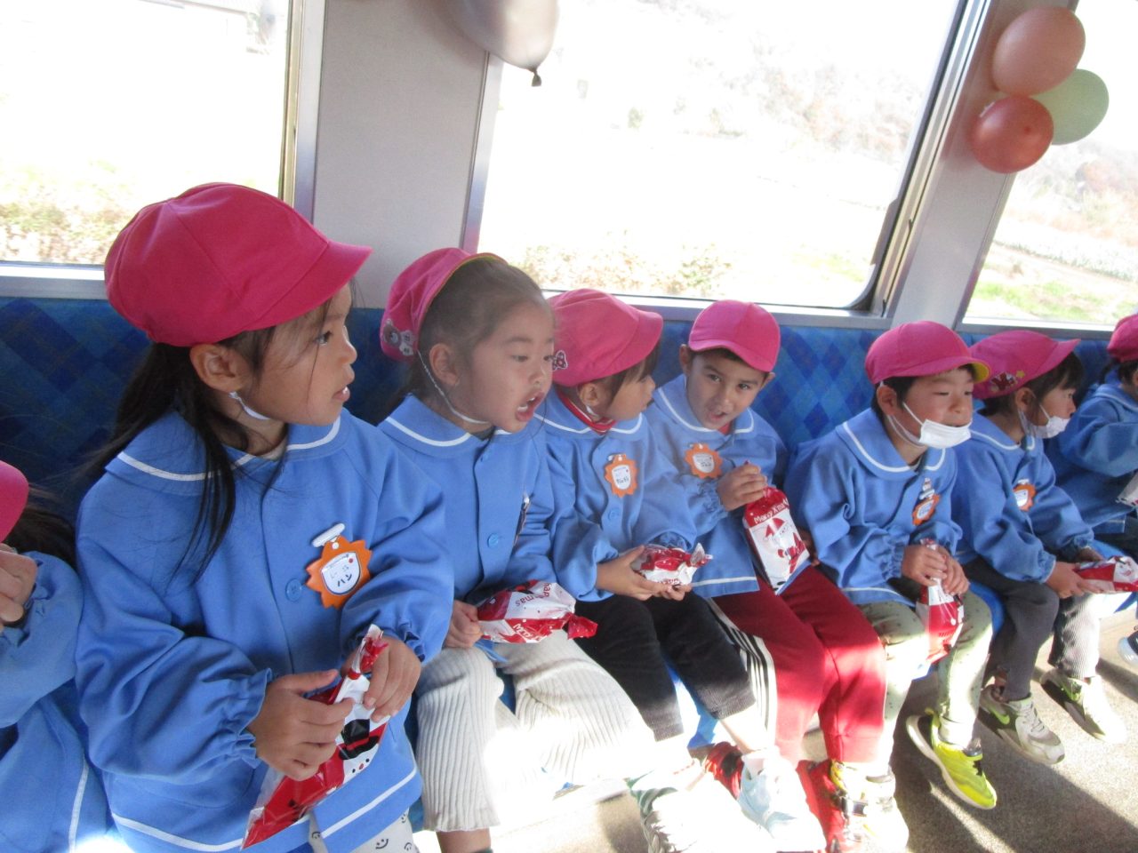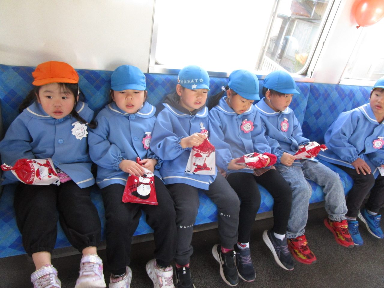 駅の中や外でそれぞれお昼(おにぎりとから揚げ)とサンタさんからのプレゼントのお菓子を食べて帰りの電車とバスに乗って帰ってきました。電車内では【たっていられるかな?}ゲームをすると力尽きたようにお休みモードへ💤一番最後に『虹』を大合唱して富岡駅に到着しました!!