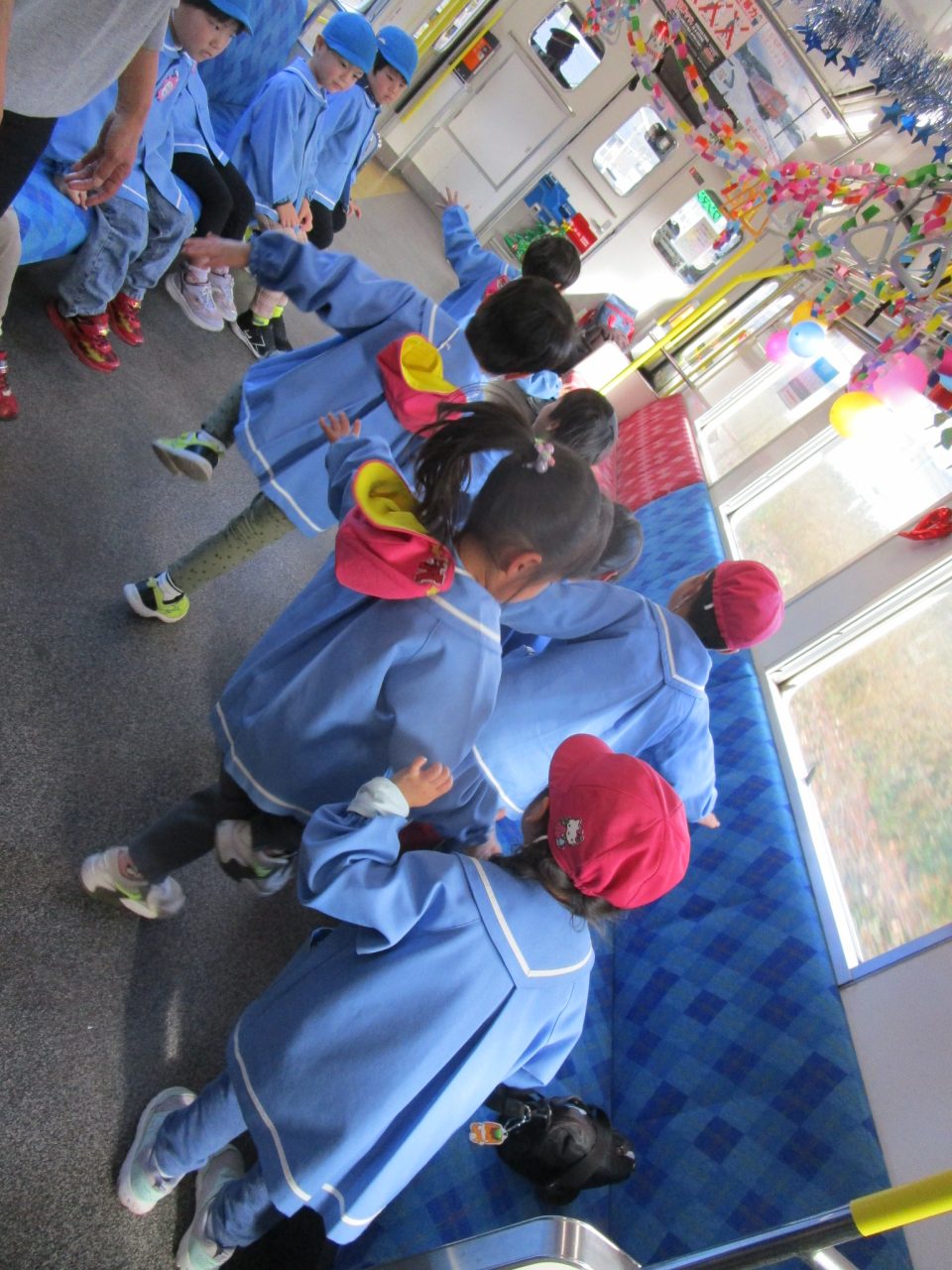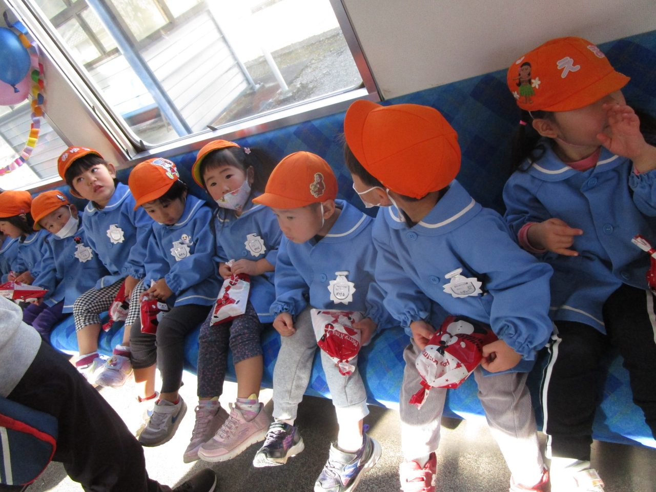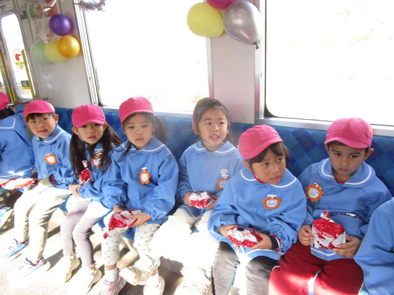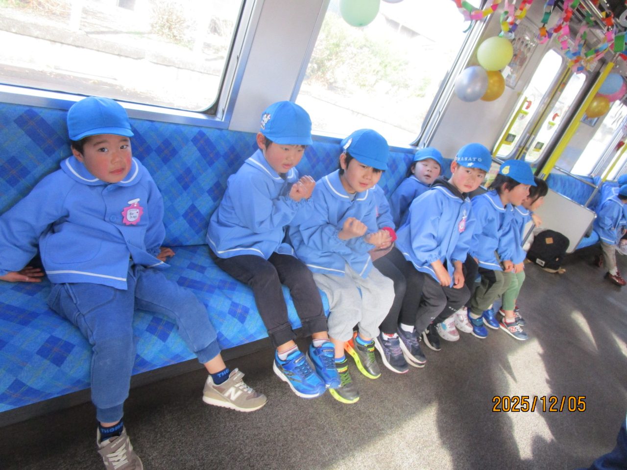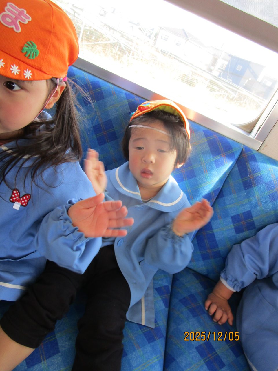 駅の中や外でそれぞれお昼(おにぎりとから揚げ)とサンタさんからのプレゼントのお菓子を食べて帰りの電車とバスに乗って帰ってきました。電車内では【たっていられるかな?}ゲームをすると力尽きたようにお休みモードへ💤一番最後に『虹』を大合唱して富岡駅に到着しました!!