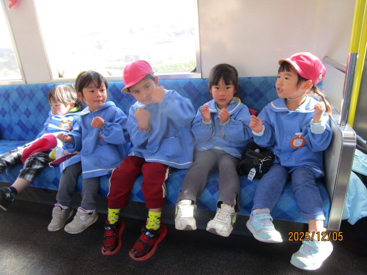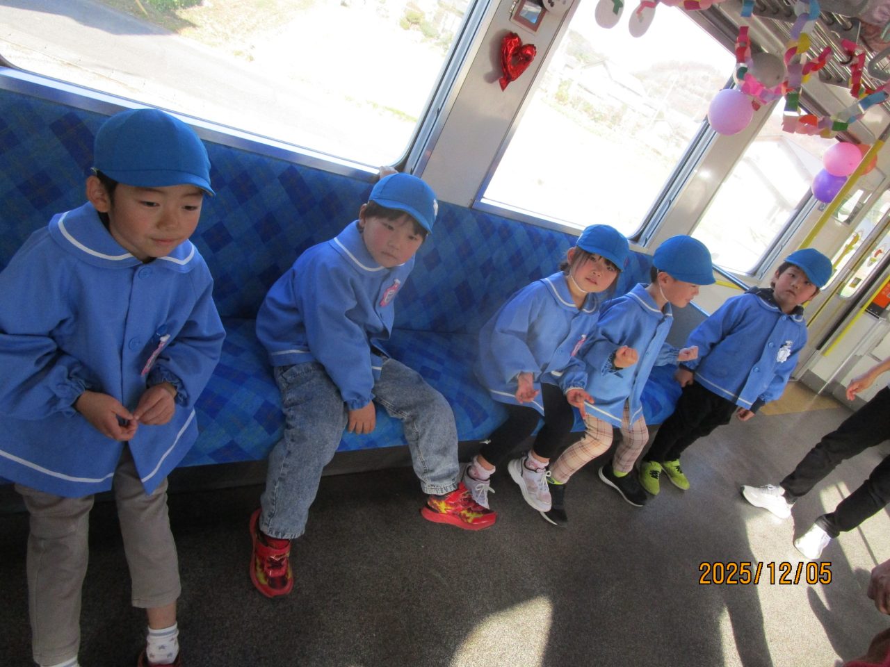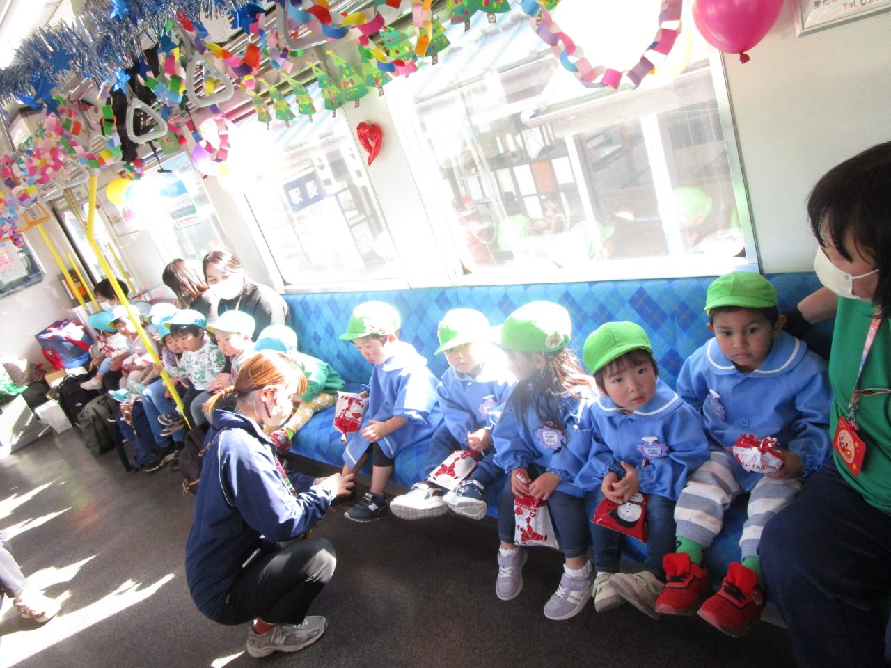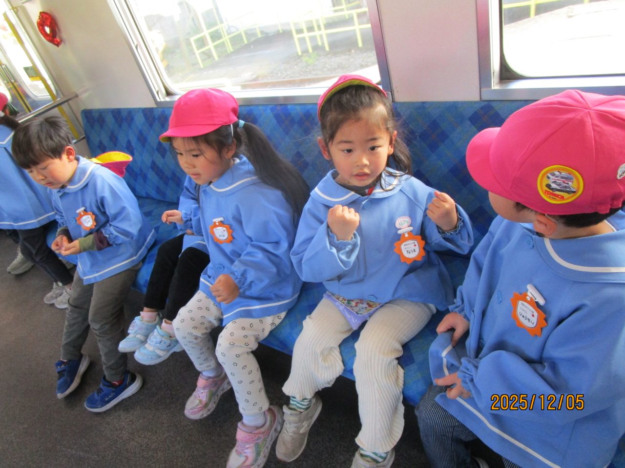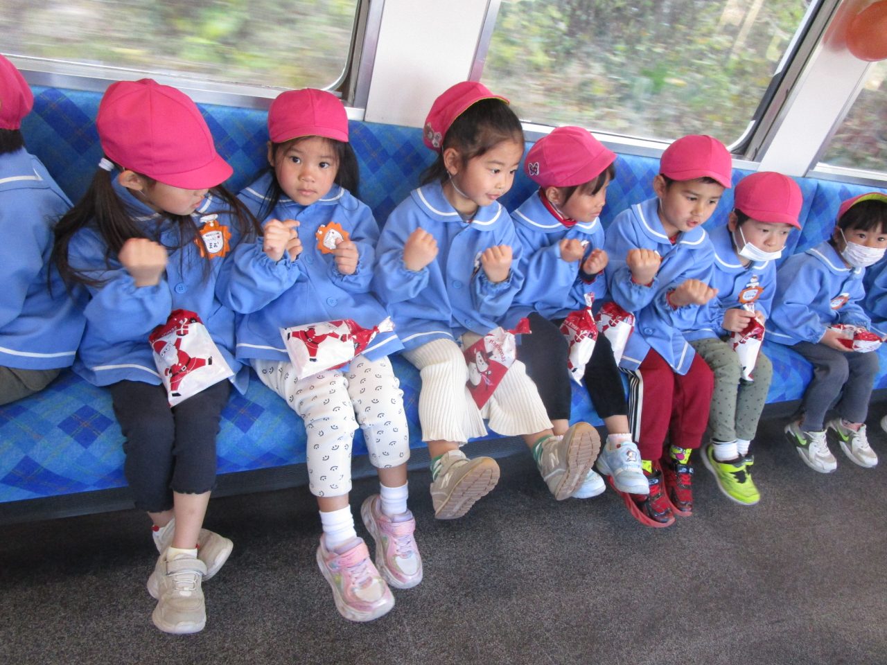 駅の中や外でそれぞれお昼(おにぎりとから揚げ)とサンタさんからのプレゼントのお菓子を食べて帰りの電車とバスに乗って帰ってきました。電車内では【たっていられるかな?}ゲームをすると力尽きたようにお休みモードへ💤一番最後に『虹』を大合唱して富岡駅に到着しました!!