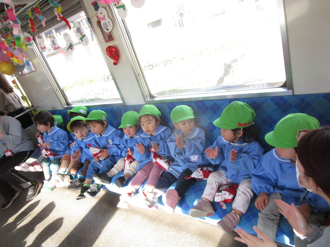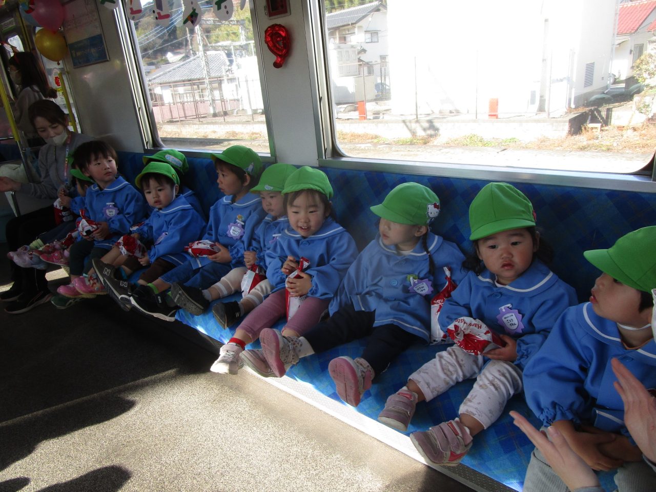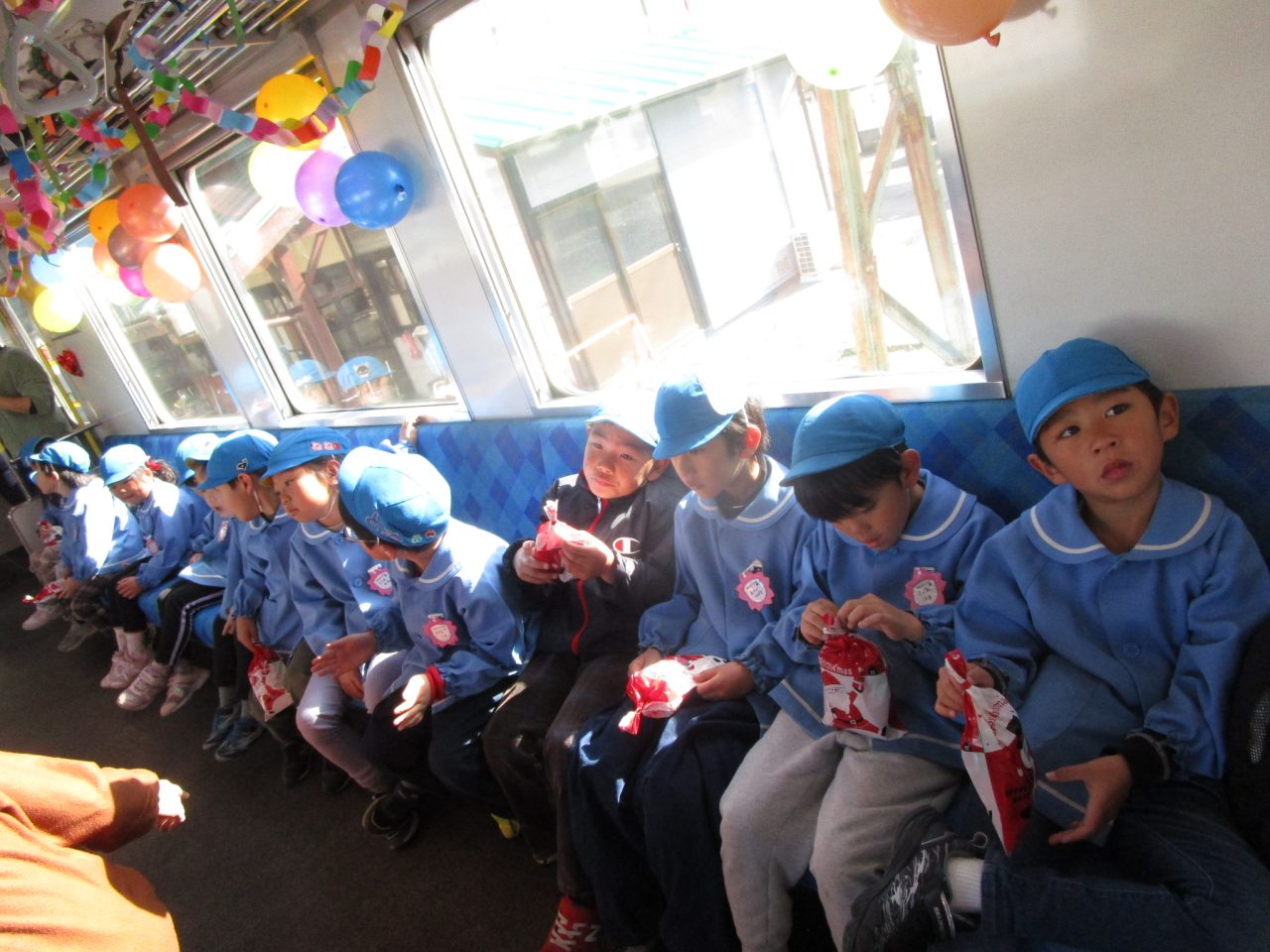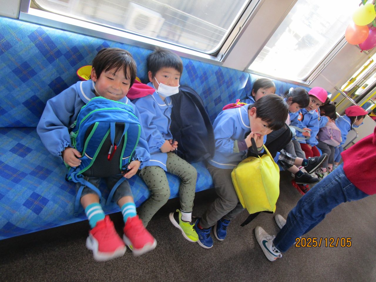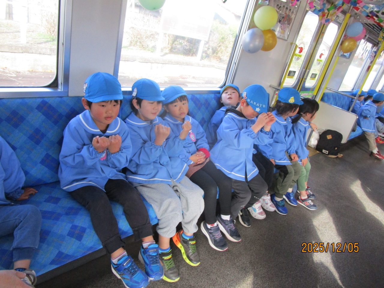 駅の中や外でそれぞれお昼(おにぎりとから揚げ)とサンタさんからのプレゼントのお菓子を食べて帰りの電車とバスに乗って帰ってきました。電車内では【たっていられるかな?}ゲームをすると力尽きたようにお休みモードへ💤一番最後に『虹』を大合唱して富岡駅に到着しました!!