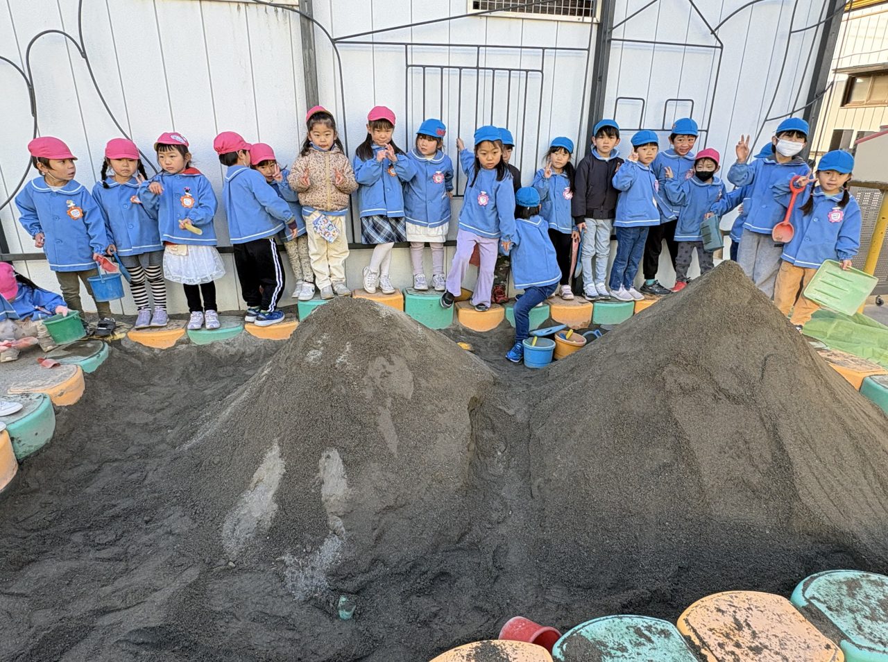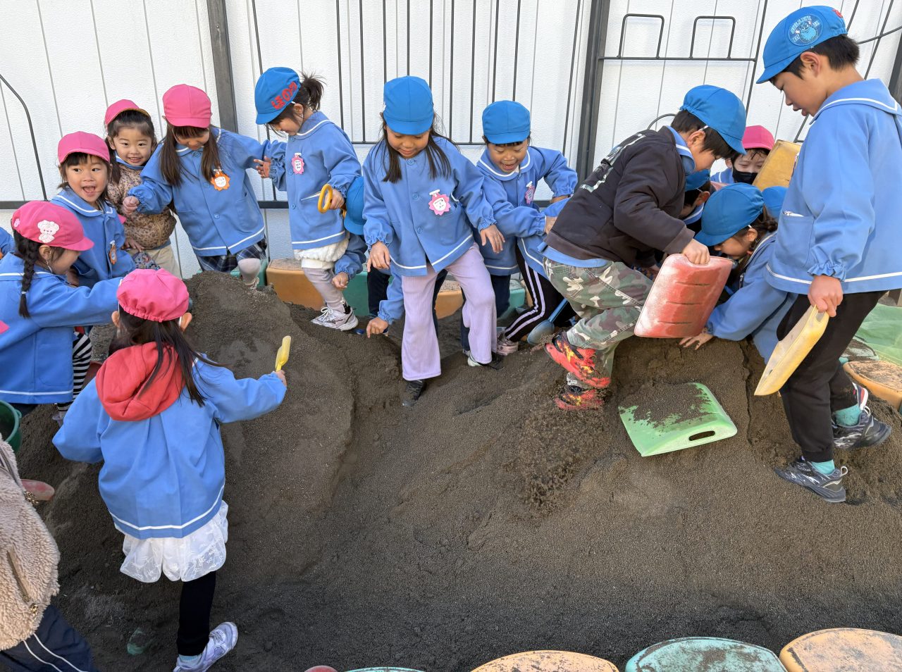 ここ数日でさくら組さん VS ひまわり組さんでどちらが高い山を作れるか競争をしていました💪少しづつお友達も集まってきて、ゆり組さんもお手伝いしてくれました。どんどん深く掘って土を乗せた山は、みんなの肩くらいの高さになりみんなが隠れてしまうほど大きくなりました!