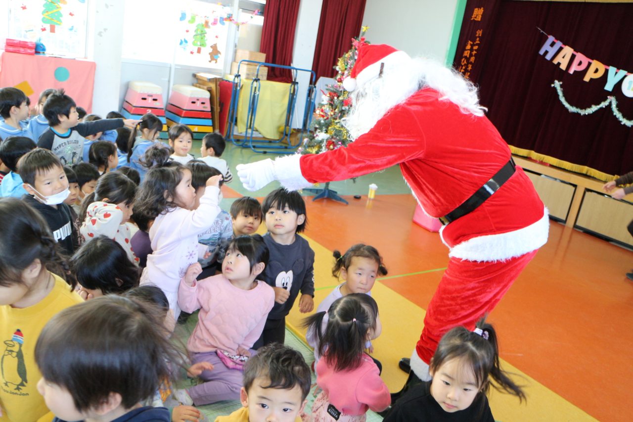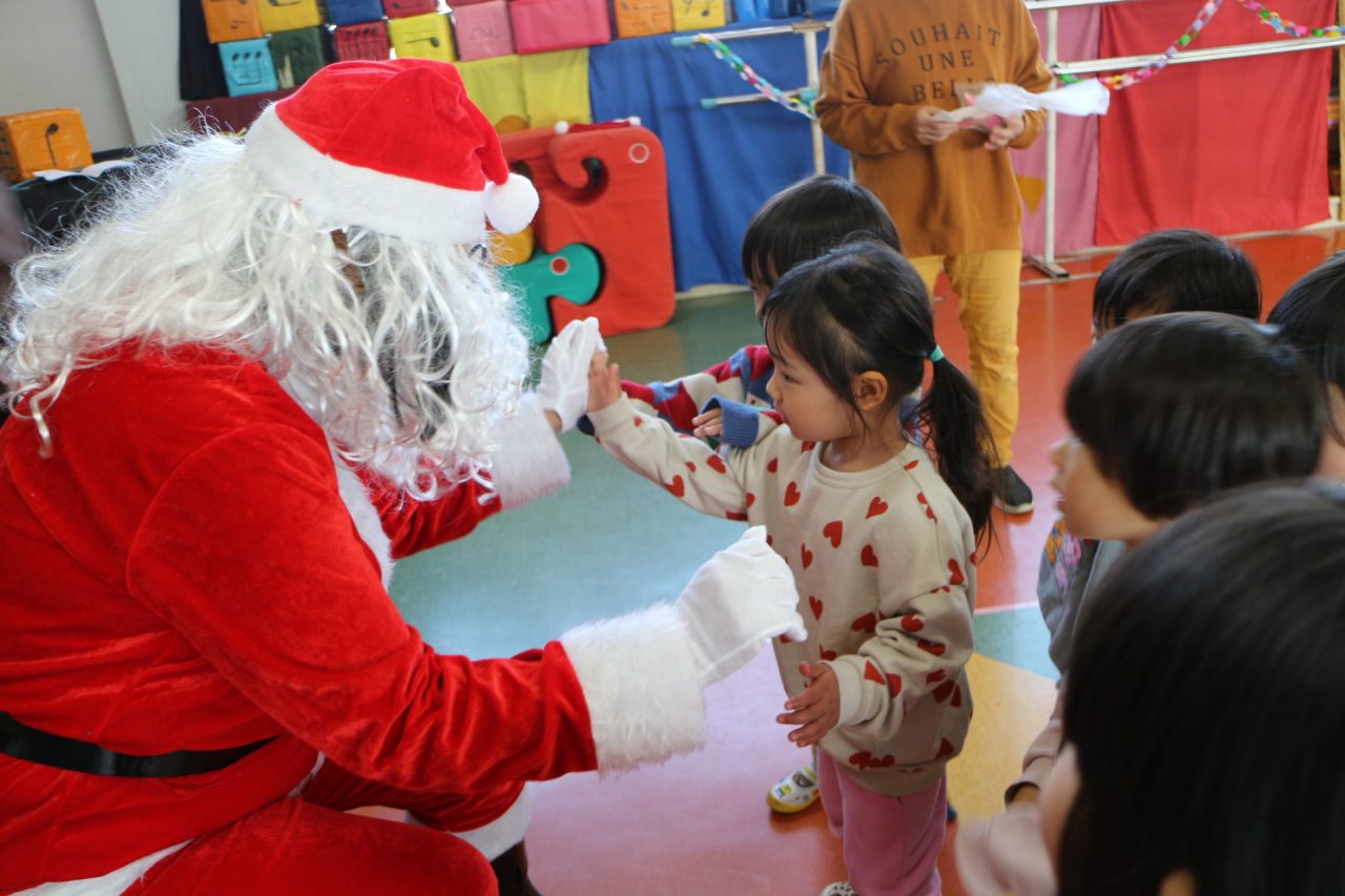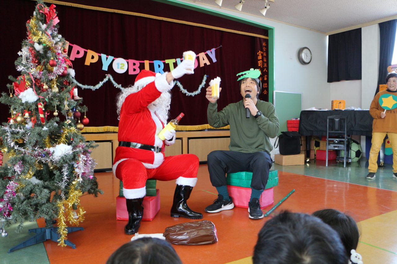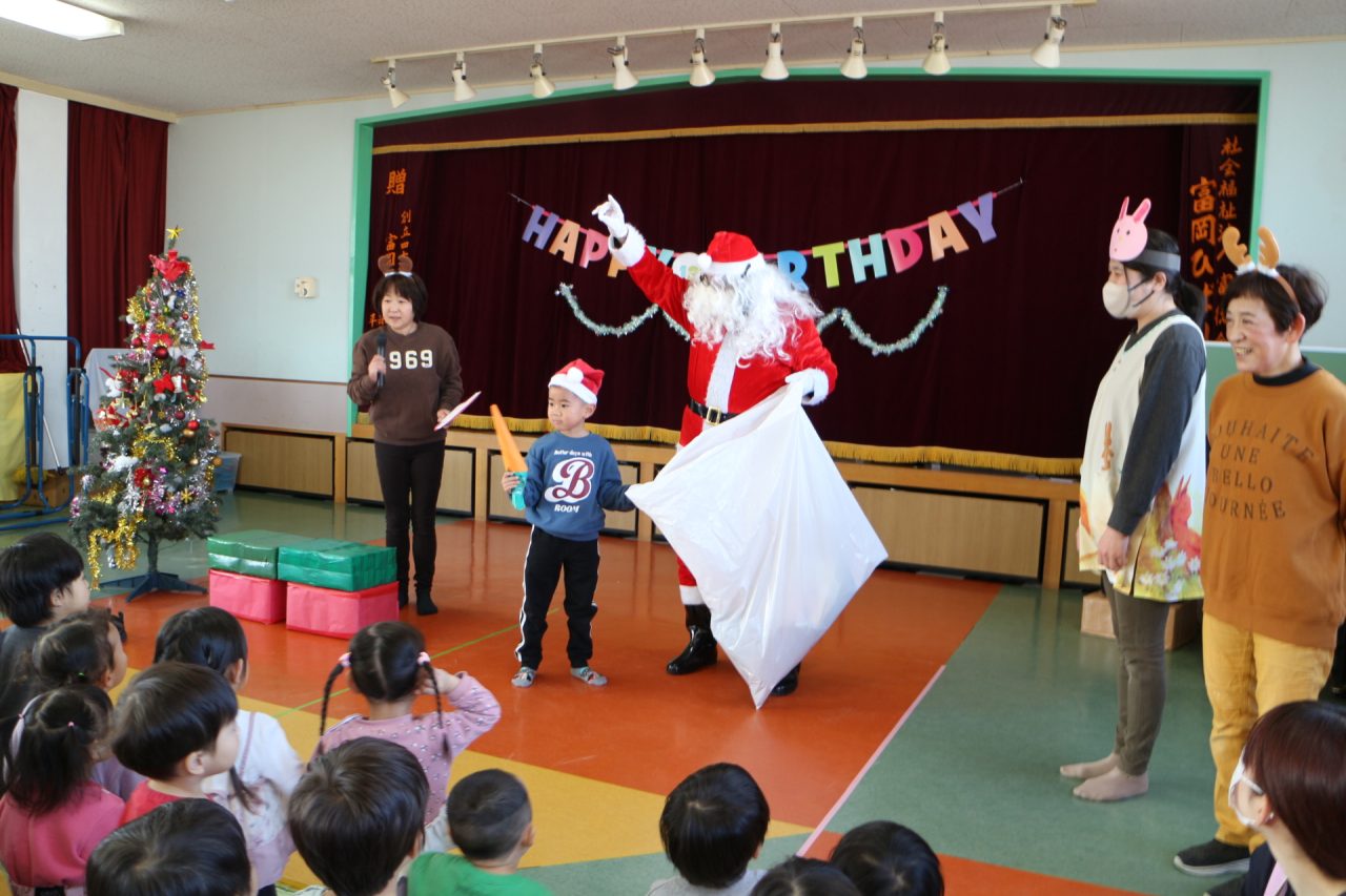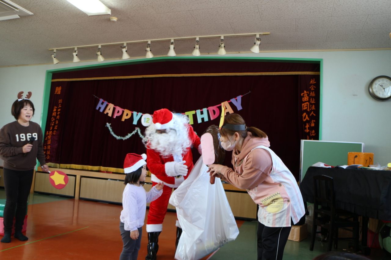 12月19日 (金)今日は少し早めのクリスマス会&12月お誕生日会!!富岡ひばりこども園に子どもたちの人気者サンタさんとトナカイさんが来てくれました✨トナカイさんと楽しいクリスマスダンスを踊った後に遅れてサンタさん登場😲!プレゼントを持ったサンタさんにみんな唖然とし興味津々で目が離せない子どもたち😆💕物語「森のクリスマス」色んな動物が訪れ子どもたちもミニサンタさんを体験しとっても可愛いサンタさんに変身しプレゼントしてもらいました🎁✨最後にワニさんとサンタさんのお疲れ様会の盃を交わしてお別れをしました。またどこかでトナカイさんとサンタさんに会えるといいね!!12月お誕生日の子以上児はプレゼント探しをし未満児は別でお祝いをしました🎉今日1日盛りだくさんの日でいい思い出になったね✌