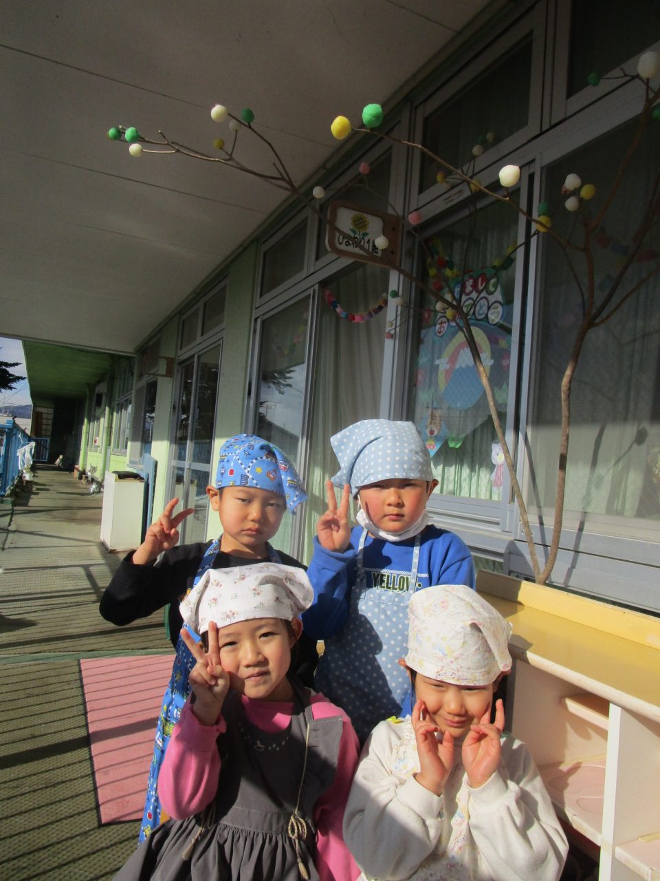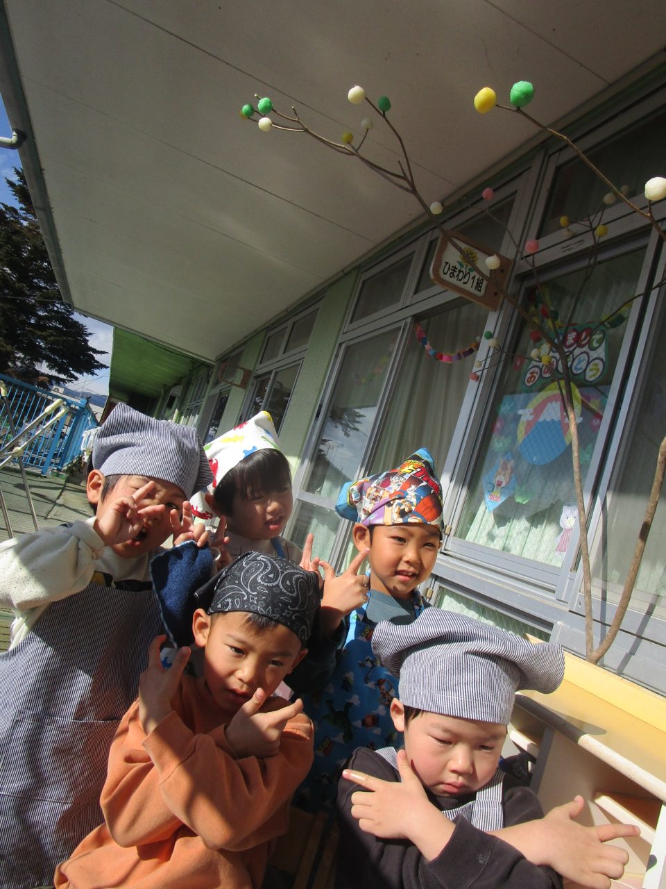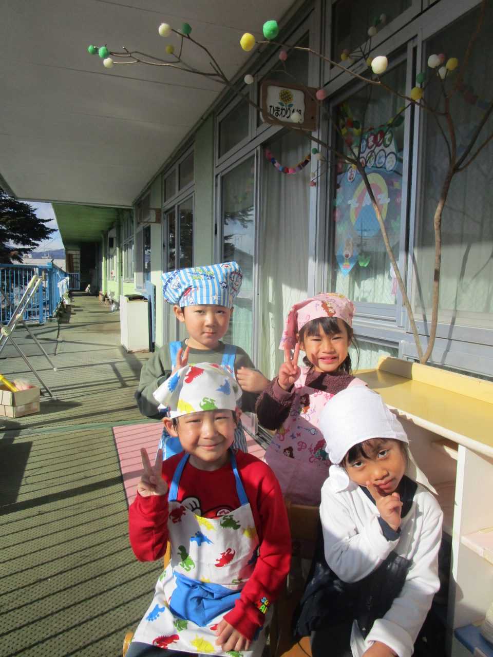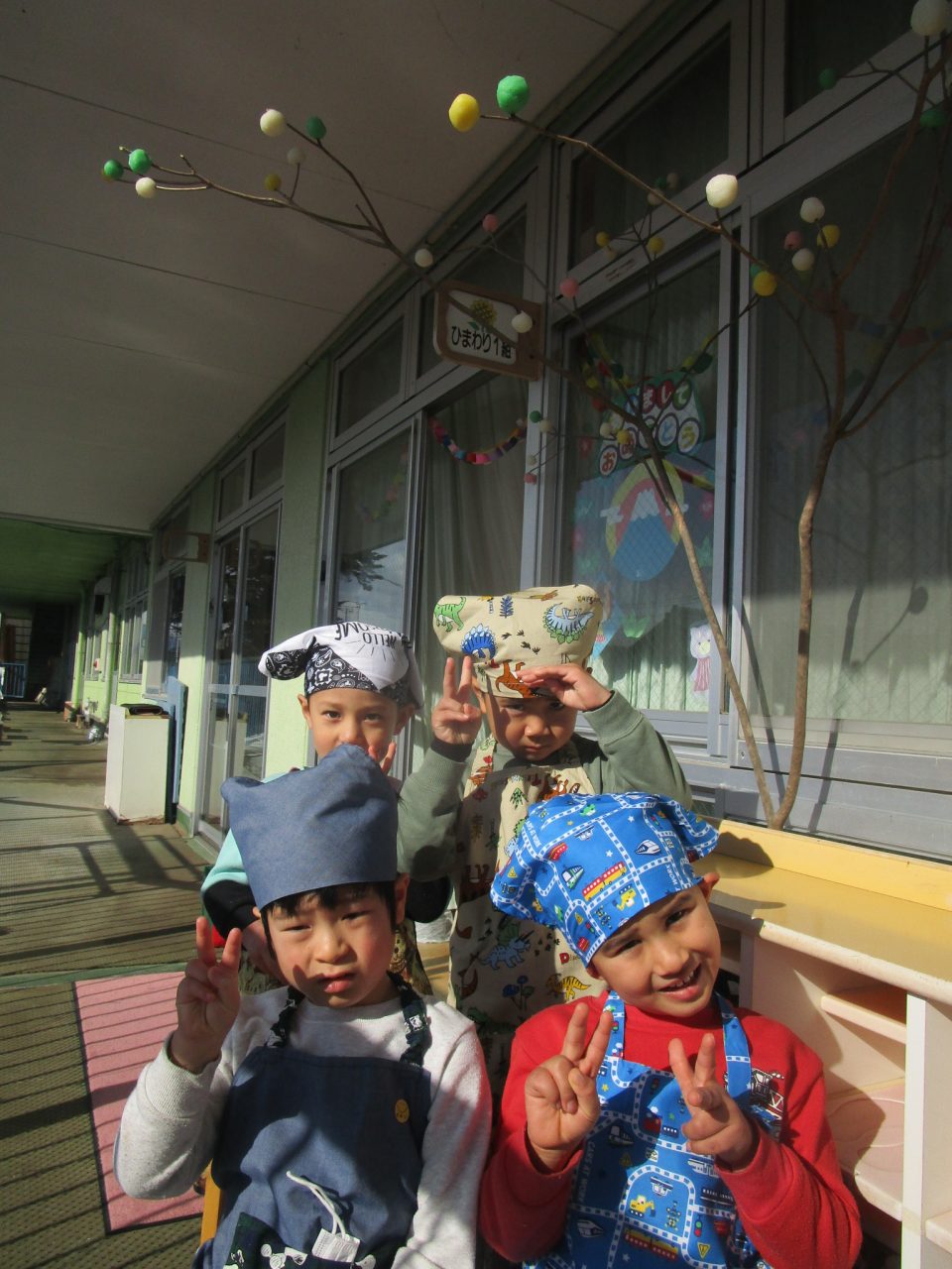 今はなかなか見ることがありませんが、以前は部屋でさしたまゆ玉を川に持っていき、どんど焼きに参加させていただしていました。どんど焼きは〈無業息災や五穀豊穣を願う行事〉です。ゆでてもらったまゆ玉を食べたりして、作るだけでなくおいしく食べることができた子どもたちでした✨