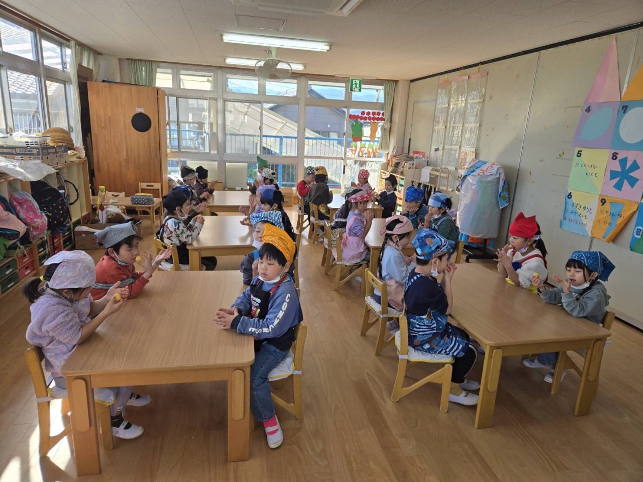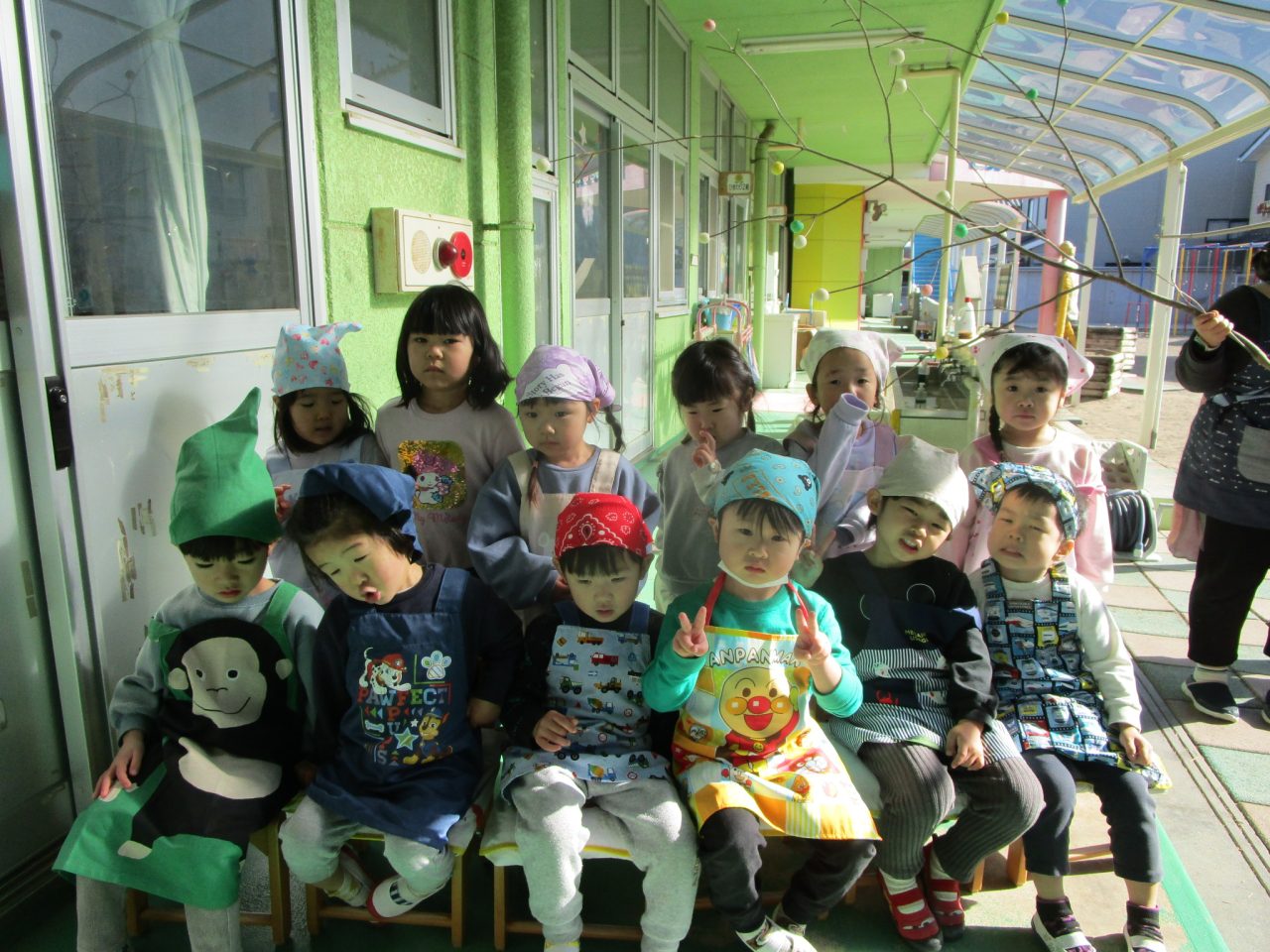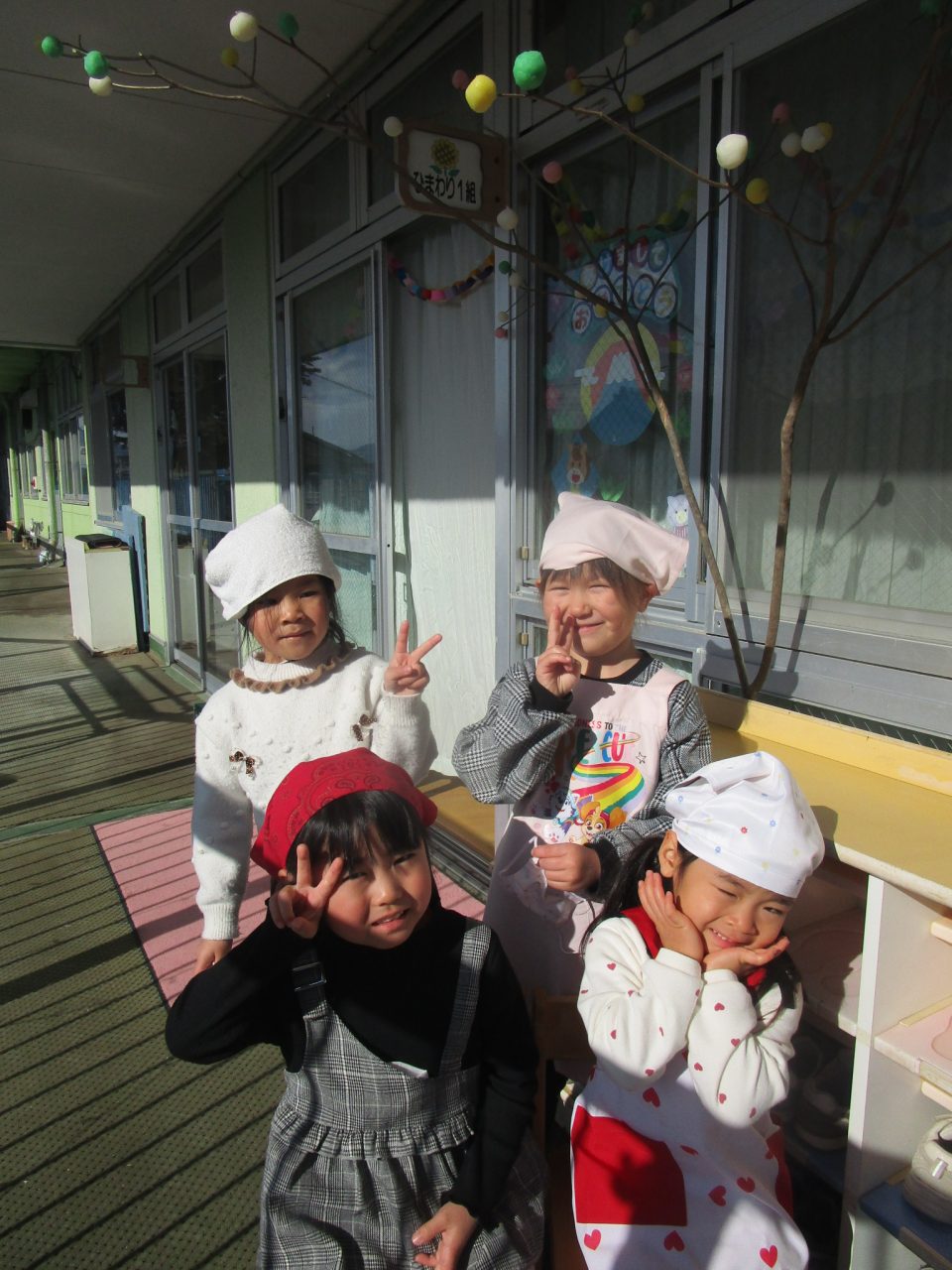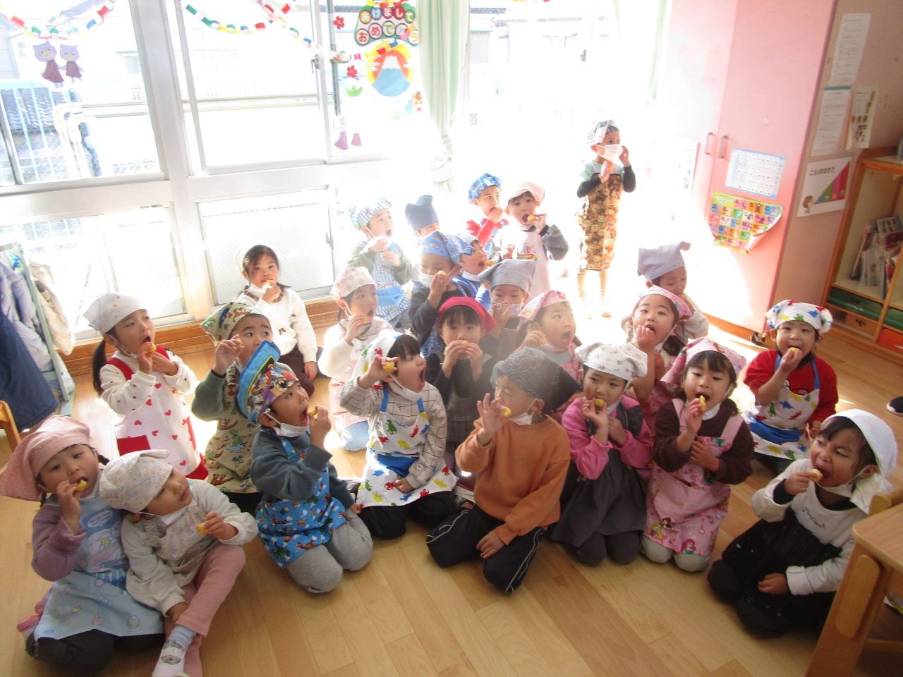 今はなかなか見ることがありませんが、以前は部屋でさしたまゆ玉を川に持っていき、どんど焼きに参加させていただしていました。どんど焼きは〈無業息災や五穀豊穣を願う行事〉です。ゆでてもらったまゆ玉を食べたりして、作るだけでなくおいしく食べることができた子どもたちでした✨
