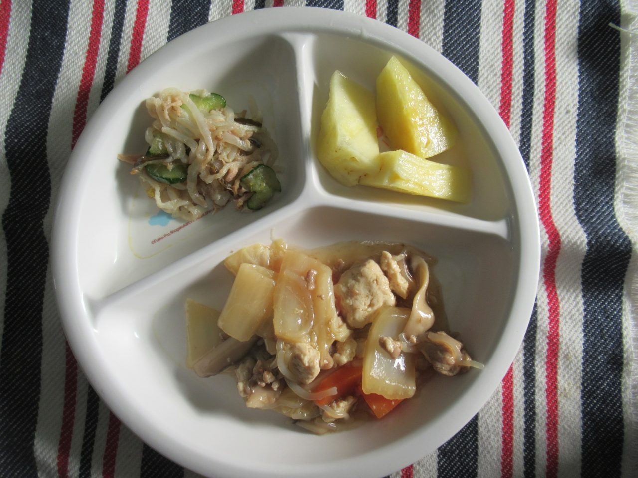 お昼・・・すき焼き風煮/もやしの塩昆布サラダ/パイン