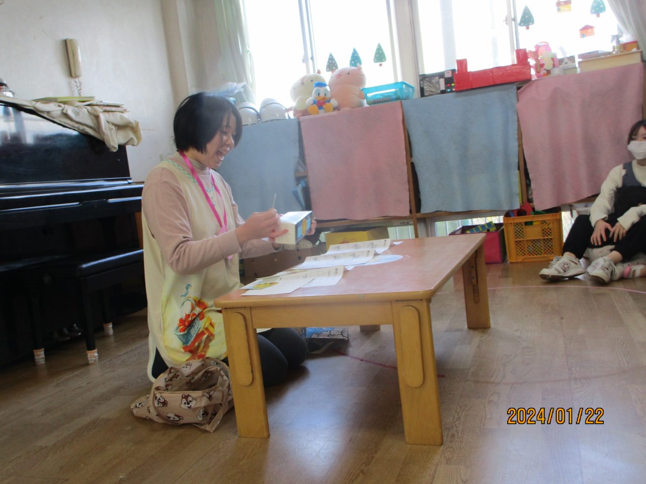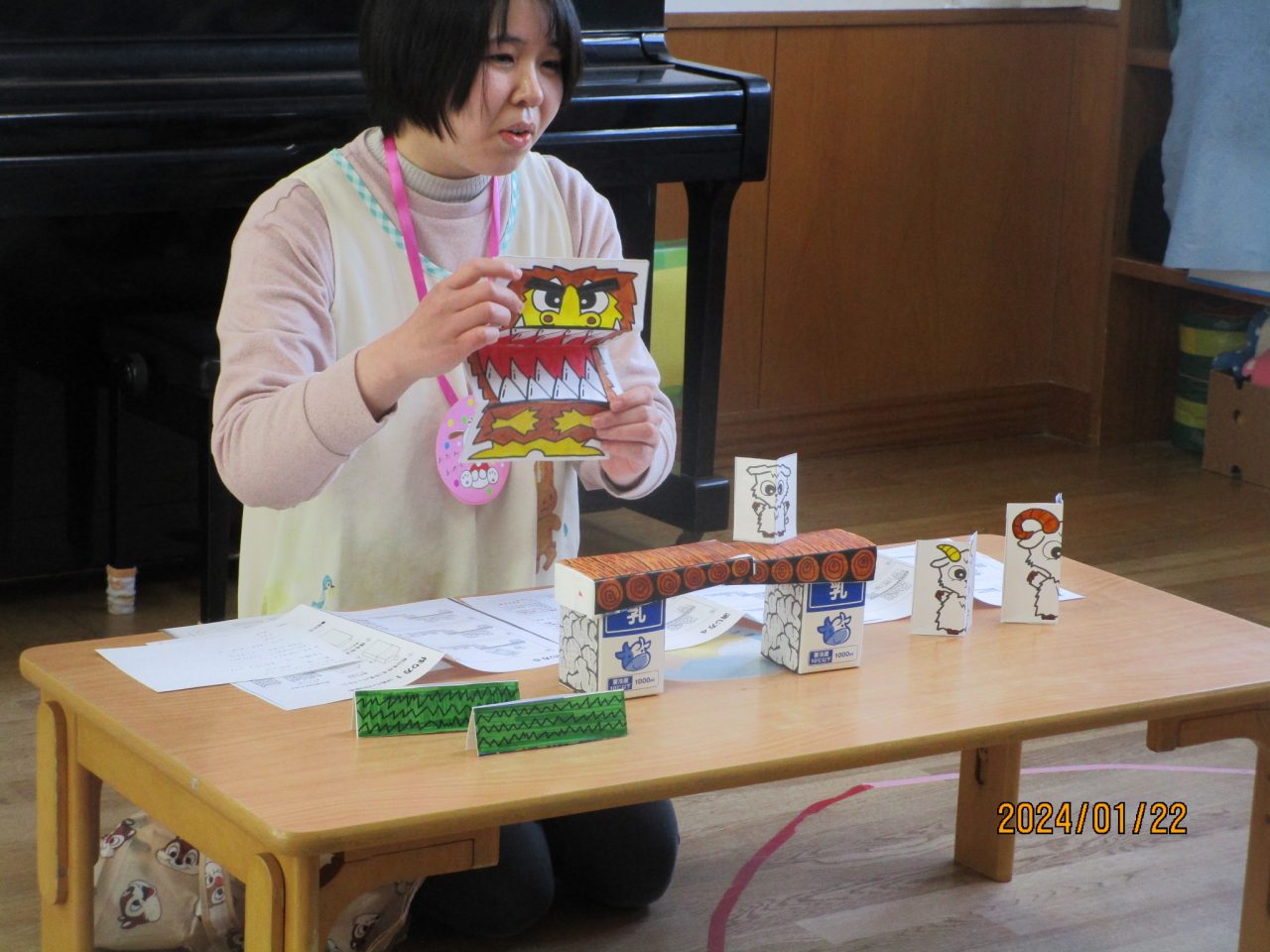 「3匹のヤギのがらがらどん」のお話と牛乳パックカメラから出てくる写真をみて楽しみました🎵