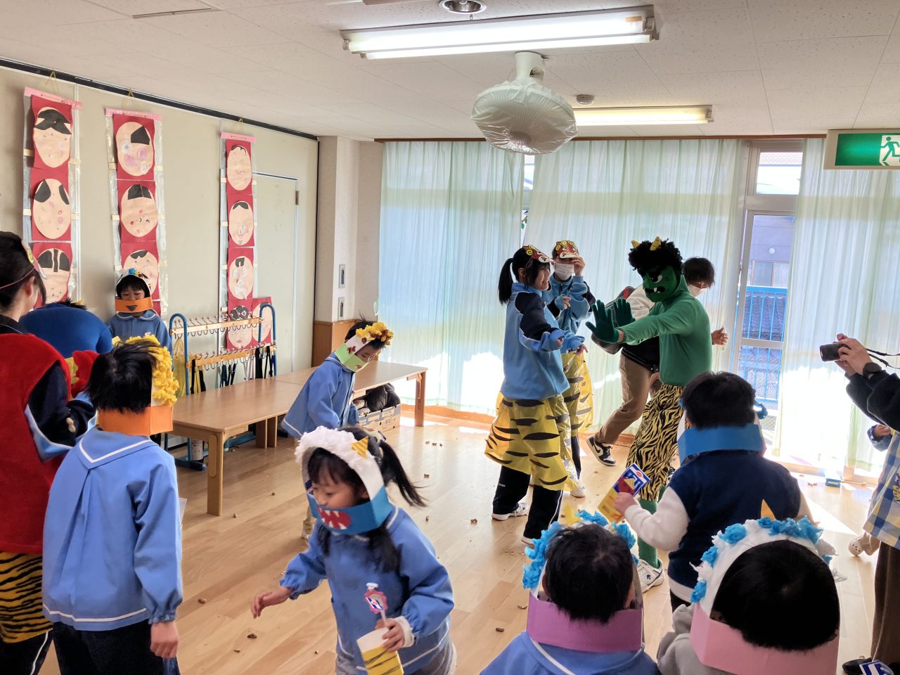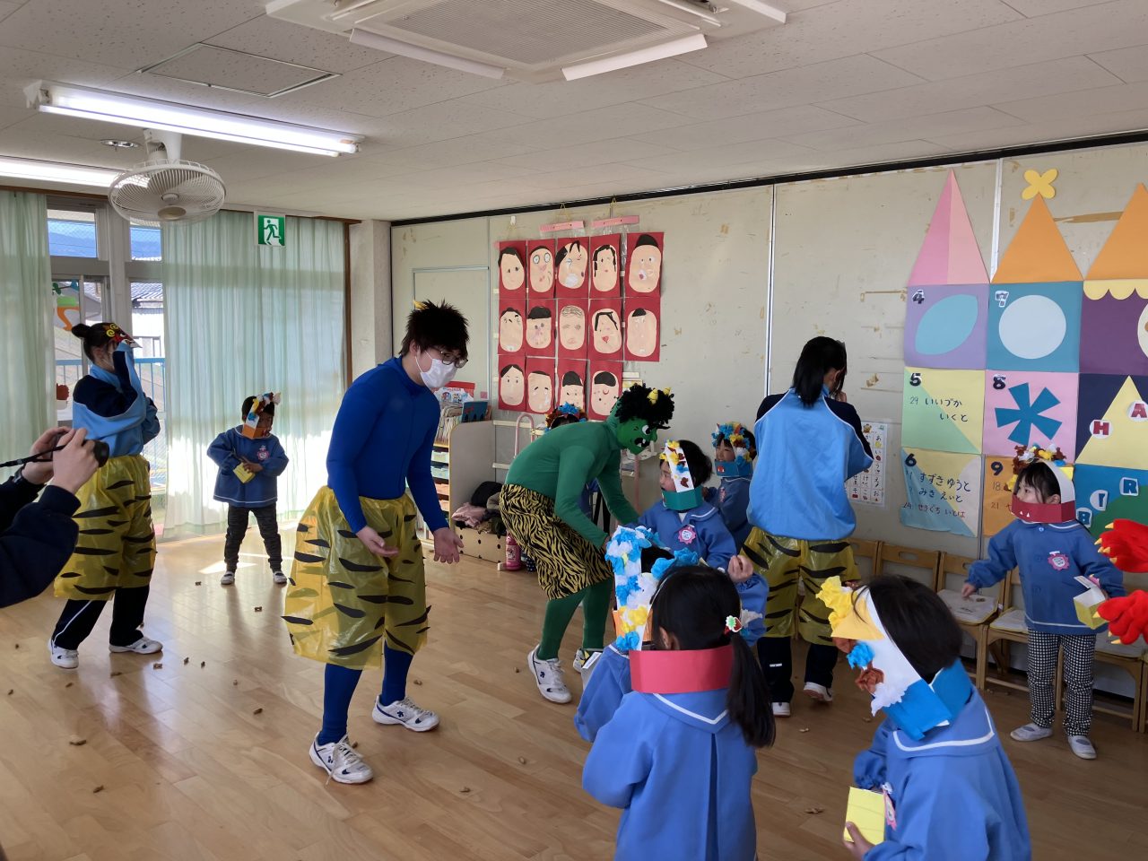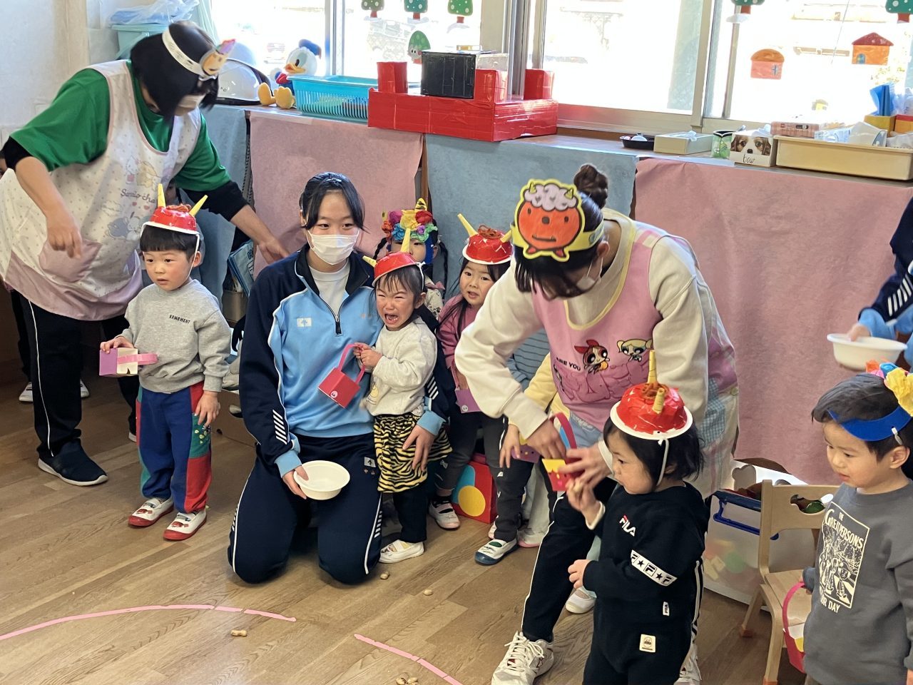 今日は節分。こども園では子どもたちが手作りした鬼のお面をかぶって、豆まきを行いました。