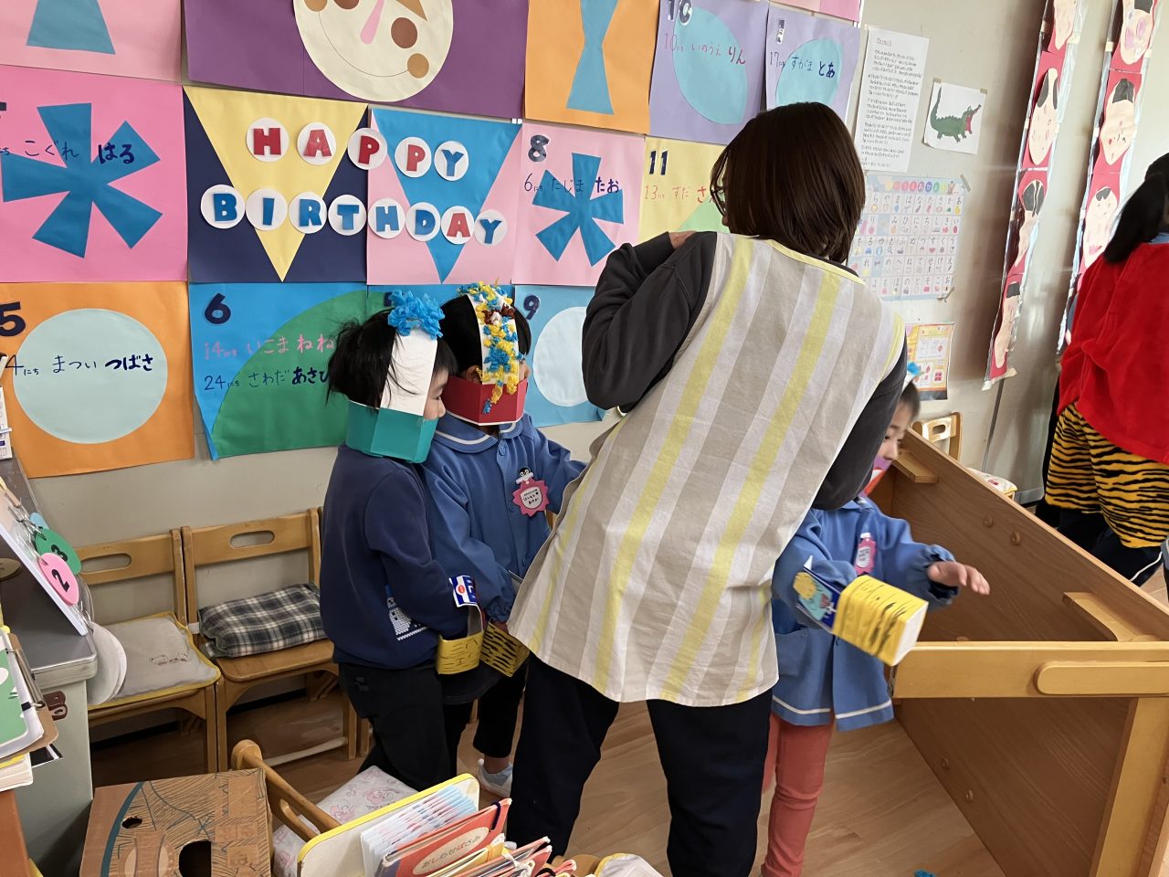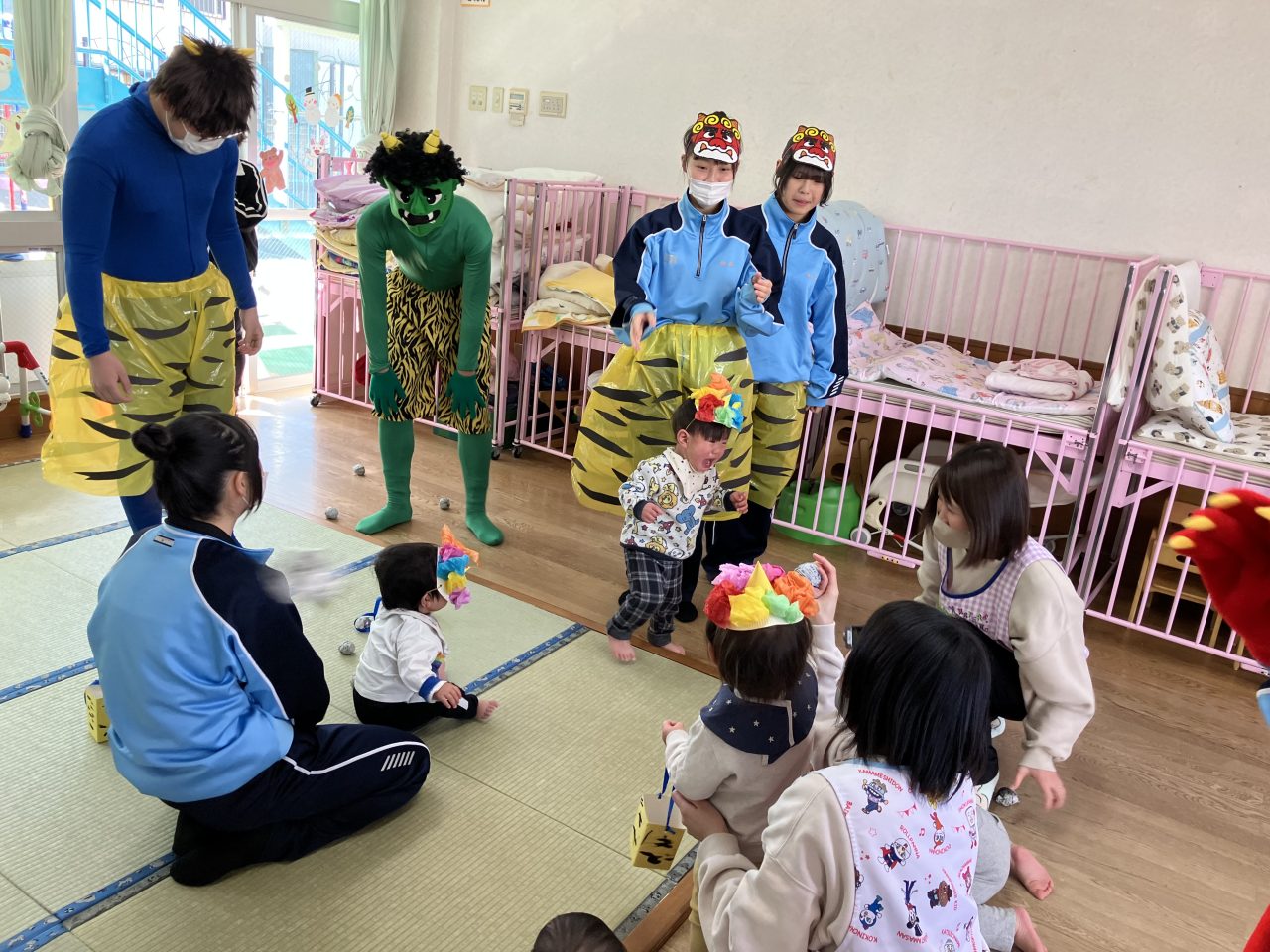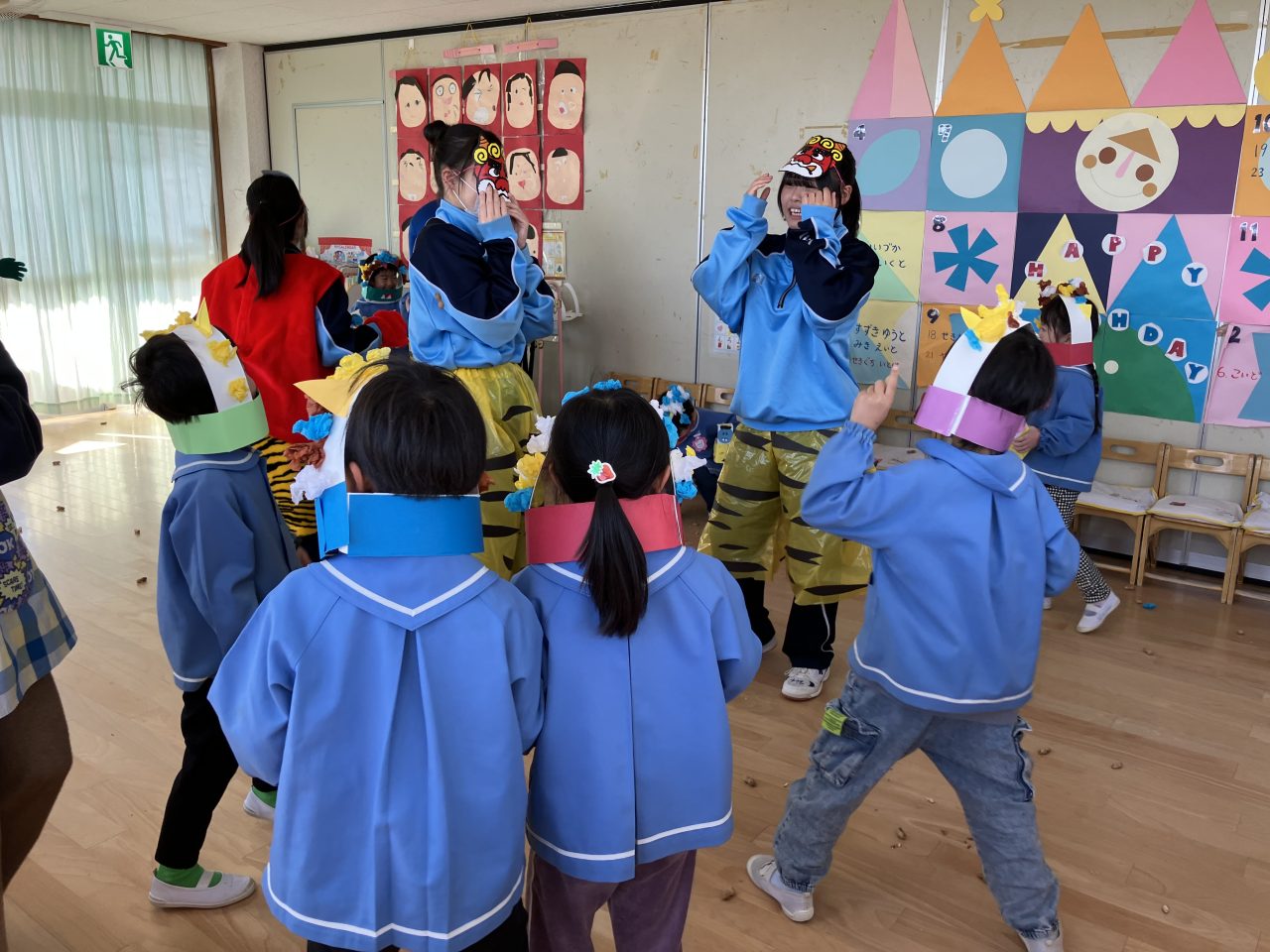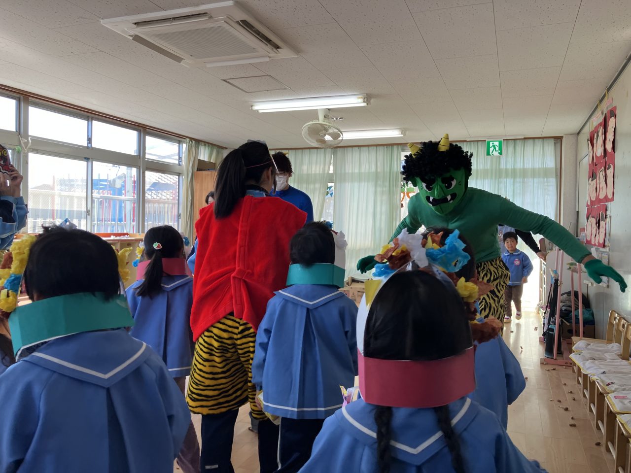 今日は節分。こども園では子どもたちが手作りした鬼のお面をかぶって、豆まきを行いました。