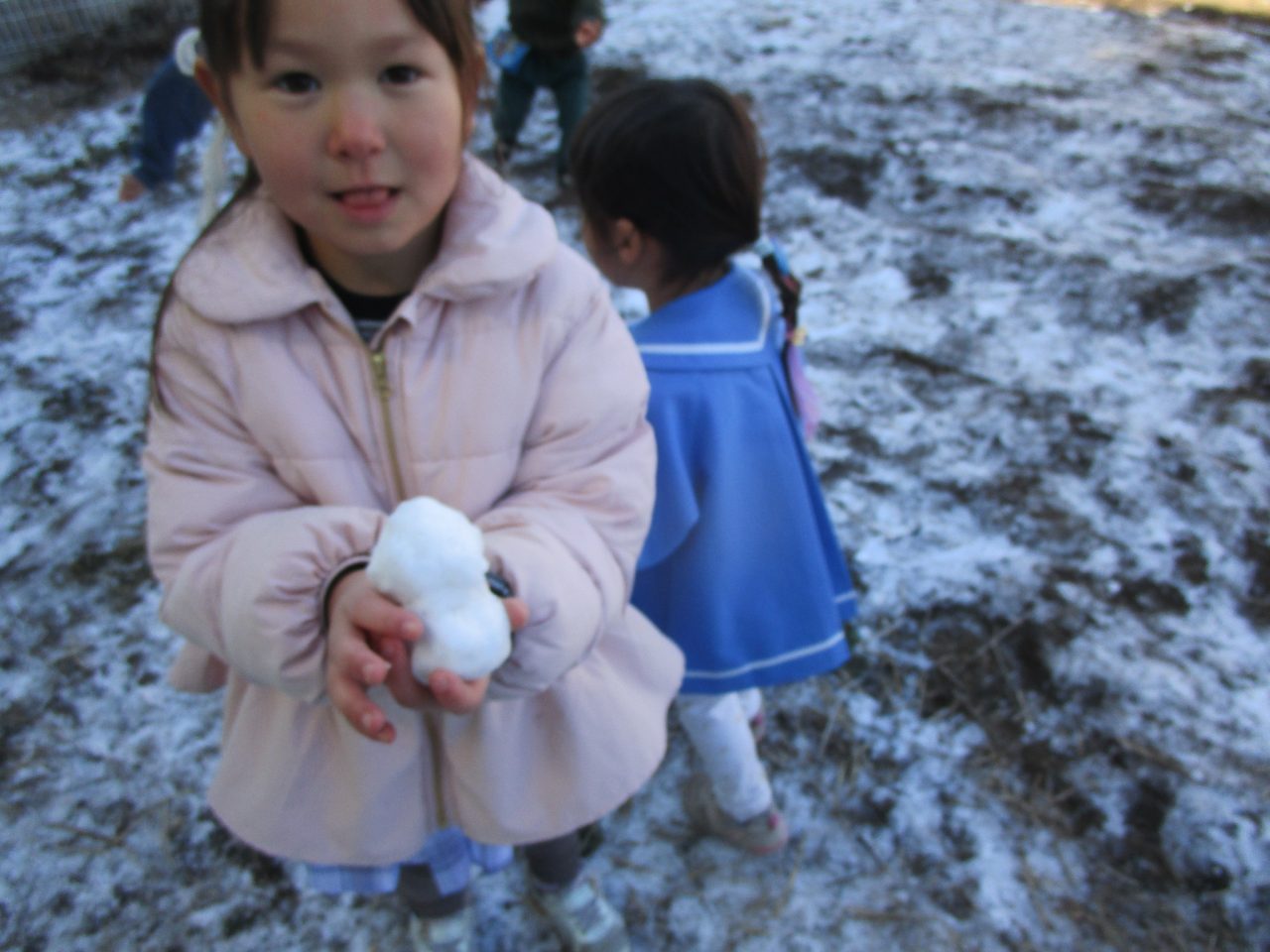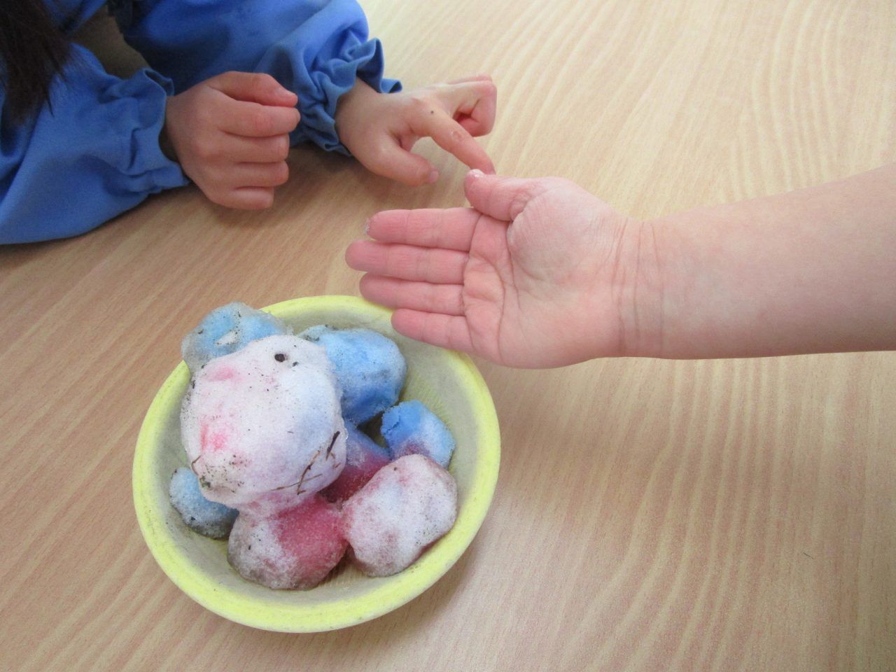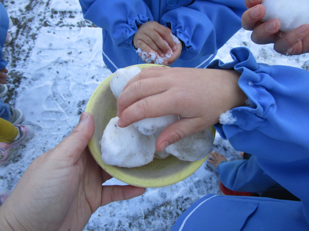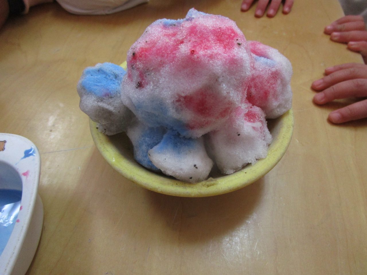 2月9日(月)昨日の雪がちょっとだけ残っていたので雪遊び❄「ゆきだるまつくりた~い!」「雪合戦した~い」と意気込んで外に出ましたが❄❄❄それぞれの手に小さな雪玉が一つずつできました☃なので、みんなの雪玉を集めて、イチゴ味とブルーハワイ味のかき氷を作りました🍧