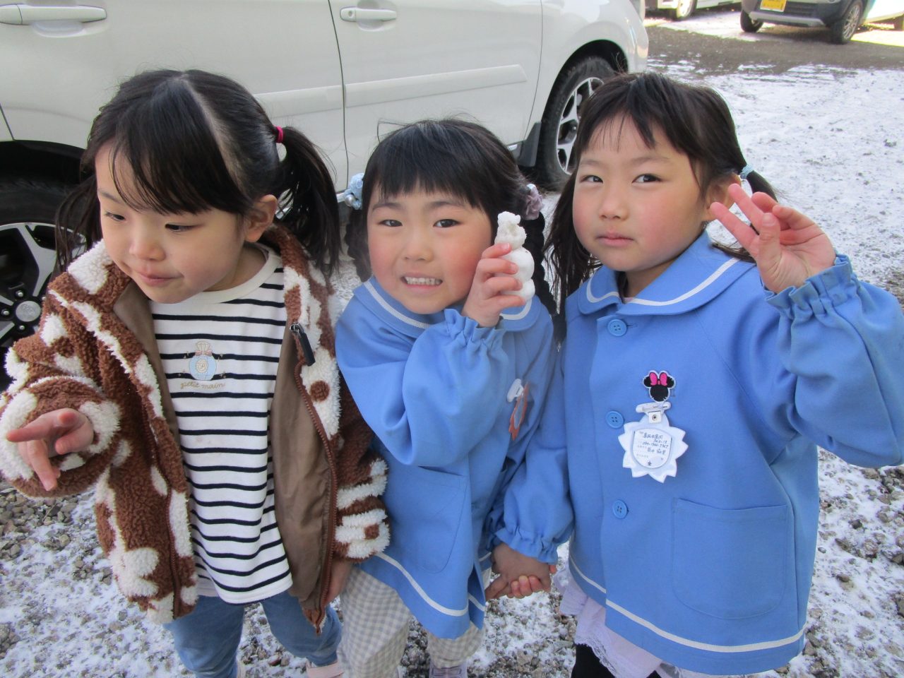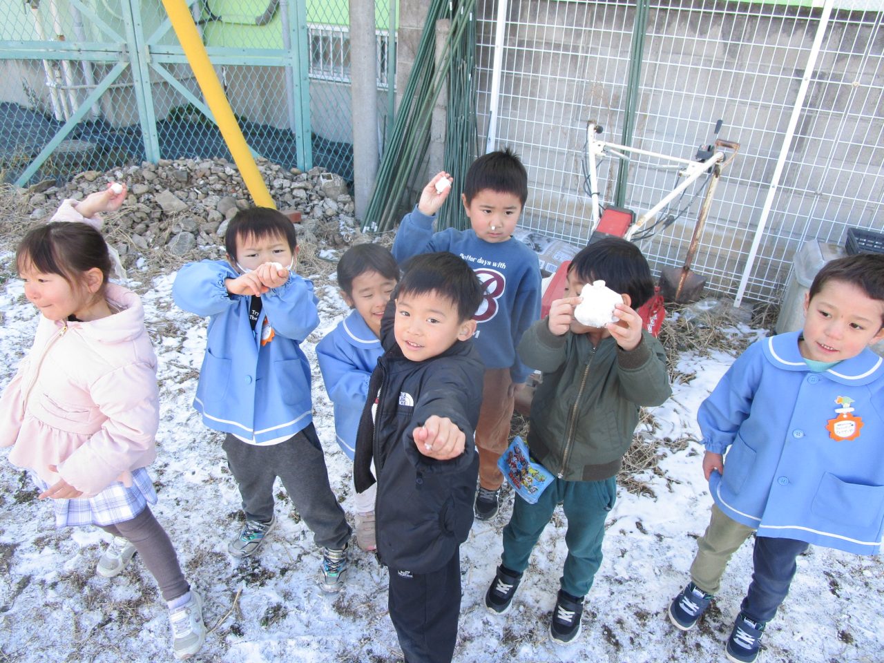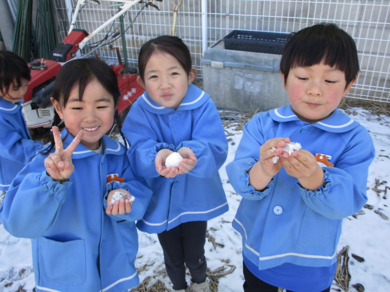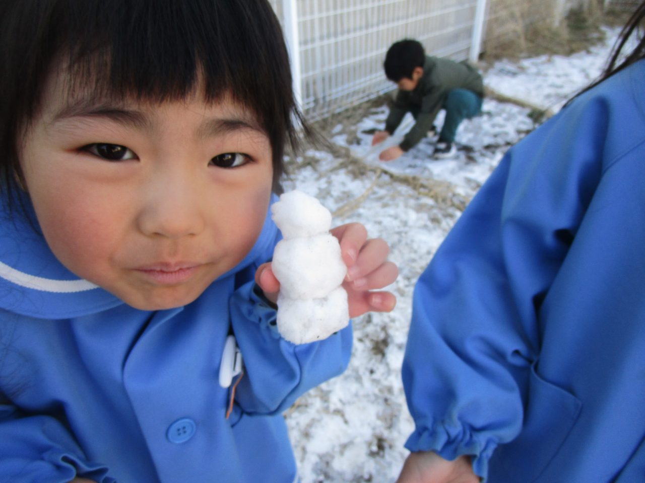 2月9日(月)昨日の雪がちょっとだけ残っていたので雪遊び❄「ゆきだるまつくりた~い!」「雪合戦した~い」と意気込んで外に出ましたが❄❄❄それぞれの手に小さな雪玉が一つずつできました☃なので、みんなの雪玉を集めて、イチゴ味とブルーハワイ味のかき氷を作りました🍧