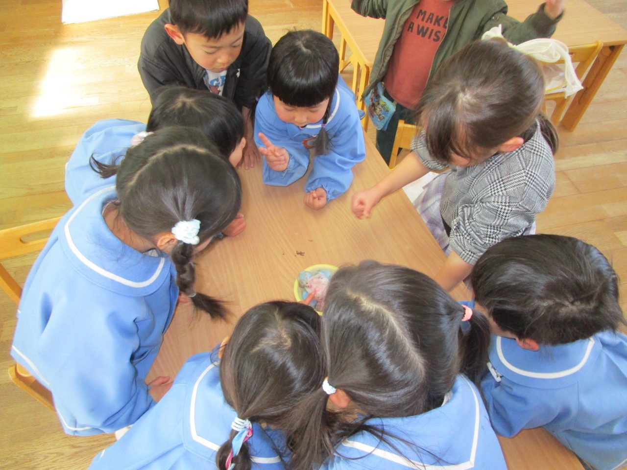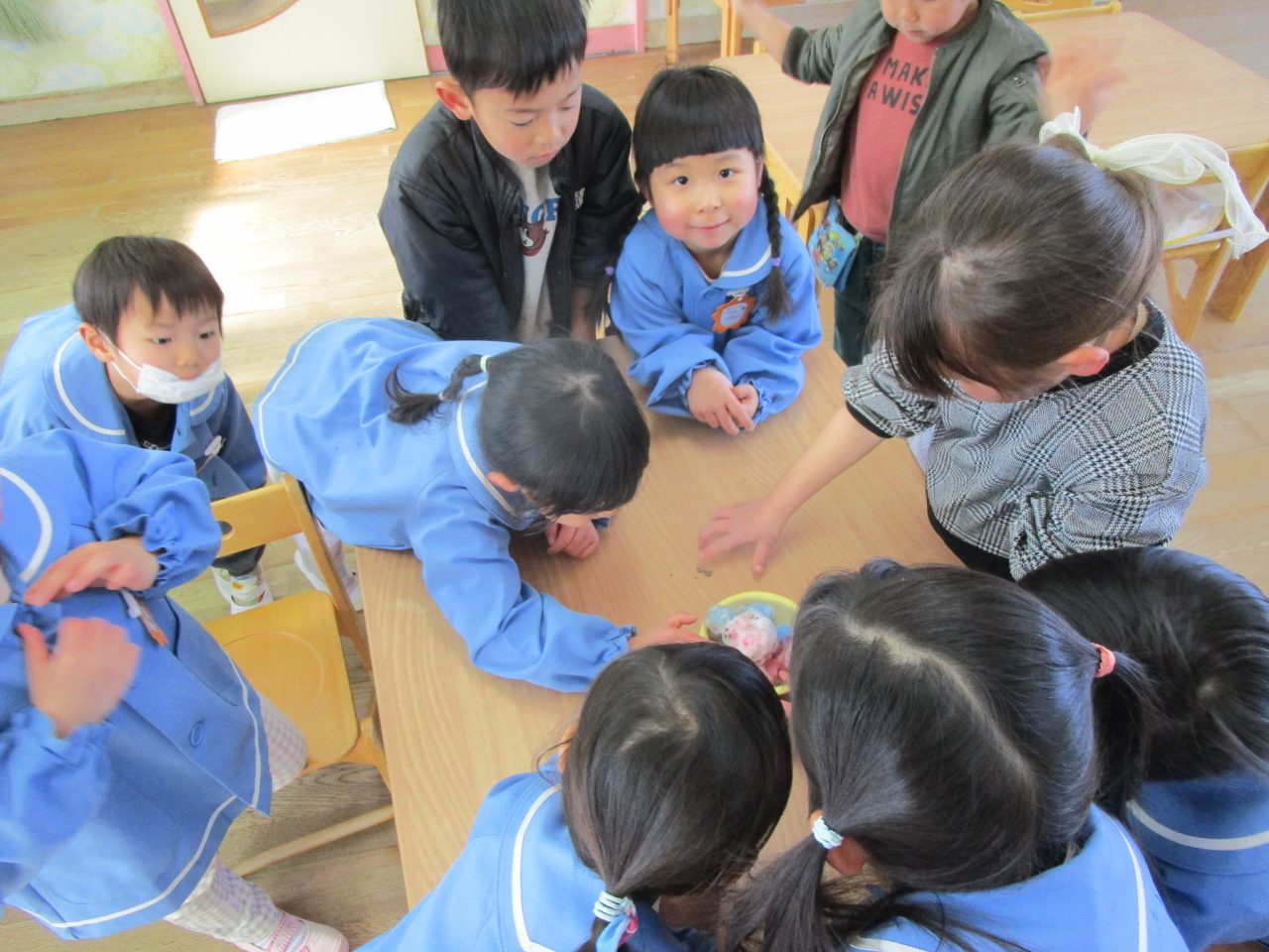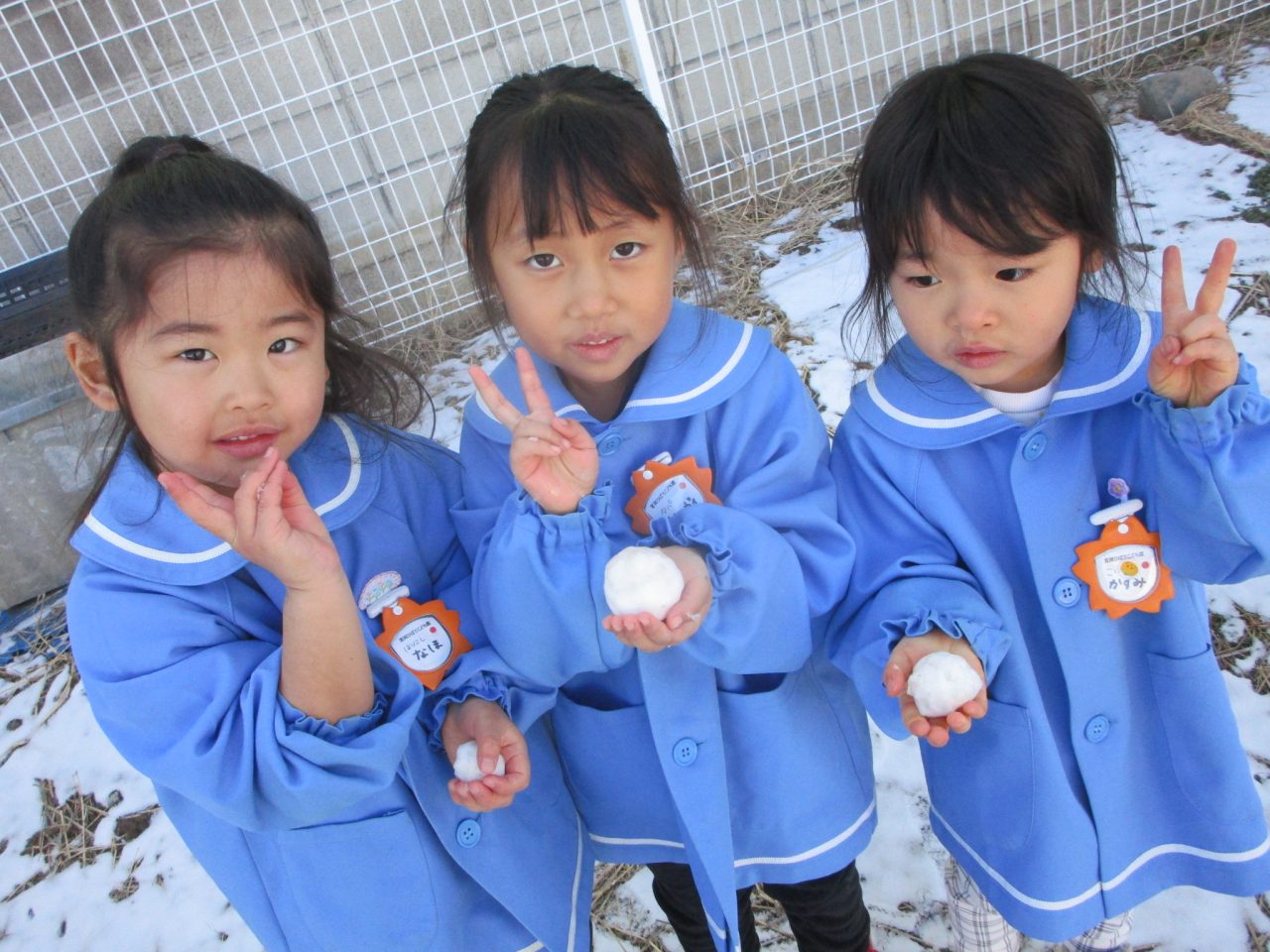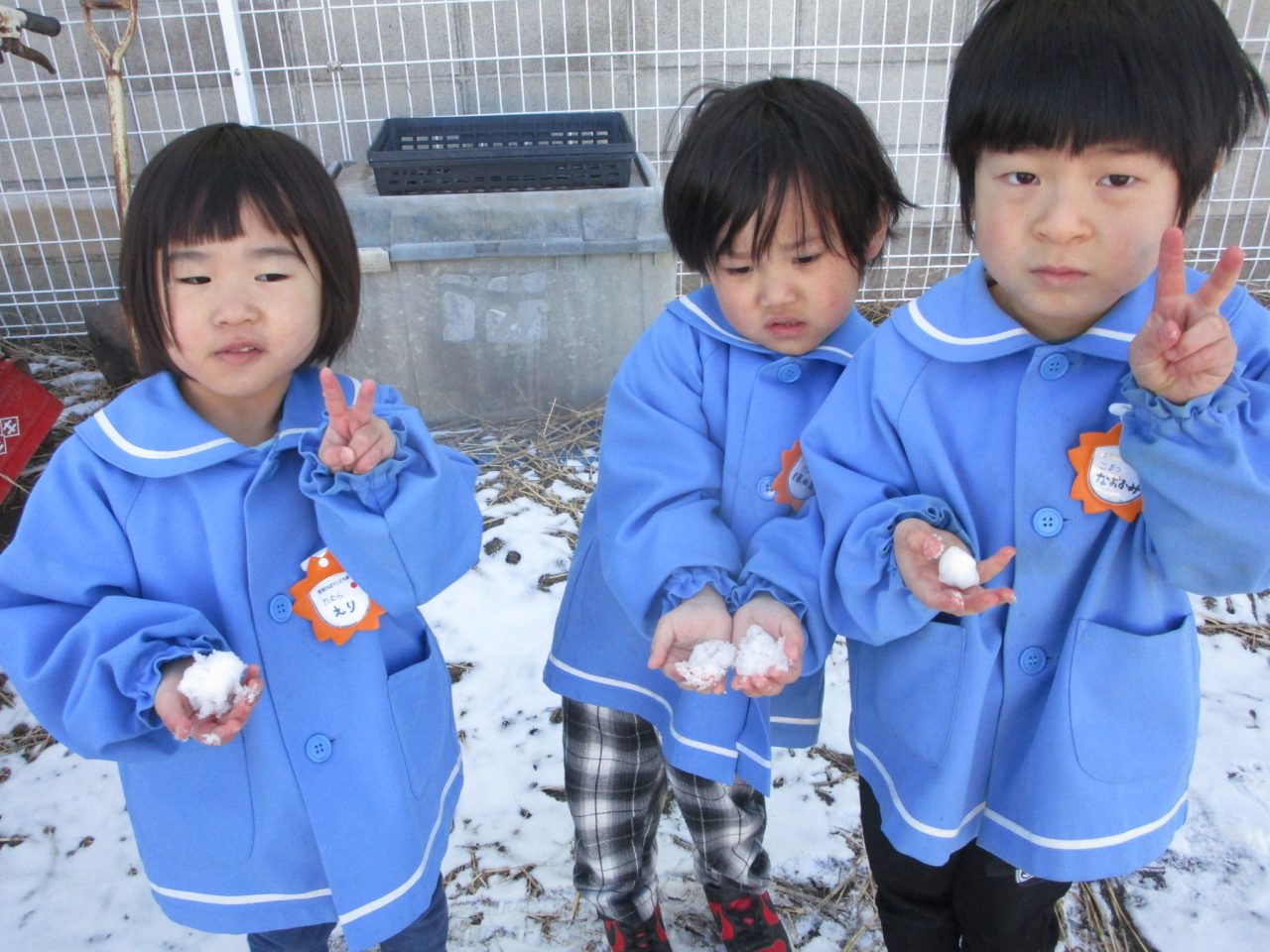 2月9日(月)昨日の雪がちょっとだけ残っていたので雪遊び❄「ゆきだるまつくりた~い!」「雪合戦した~い」と意気込んで外に出ましたが❄❄❄それぞれの手に小さな雪玉が一つずつできました☃なので、みんなの雪玉を集めて、イチゴ味とブルーハワイ味のかき氷を作りました🍧