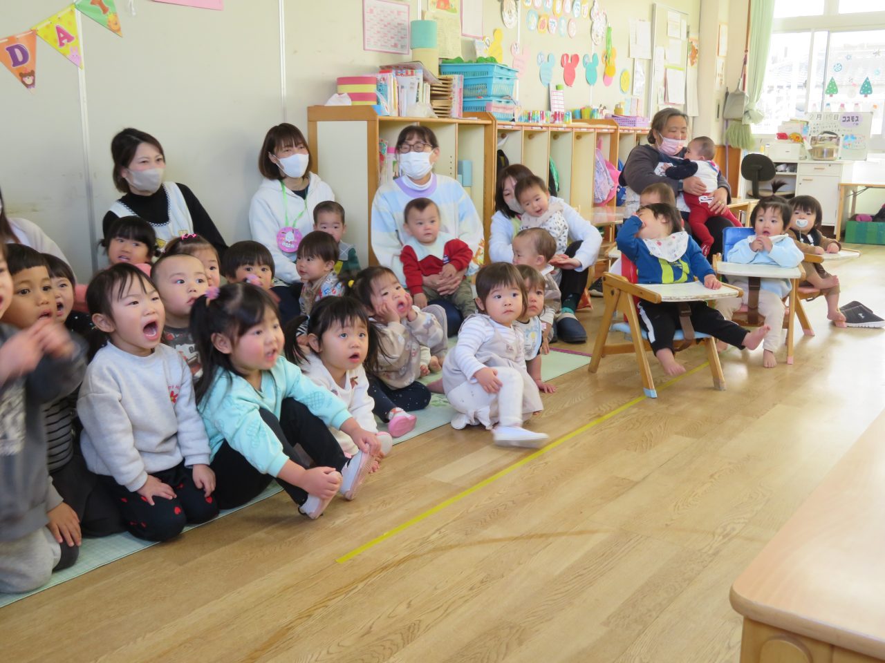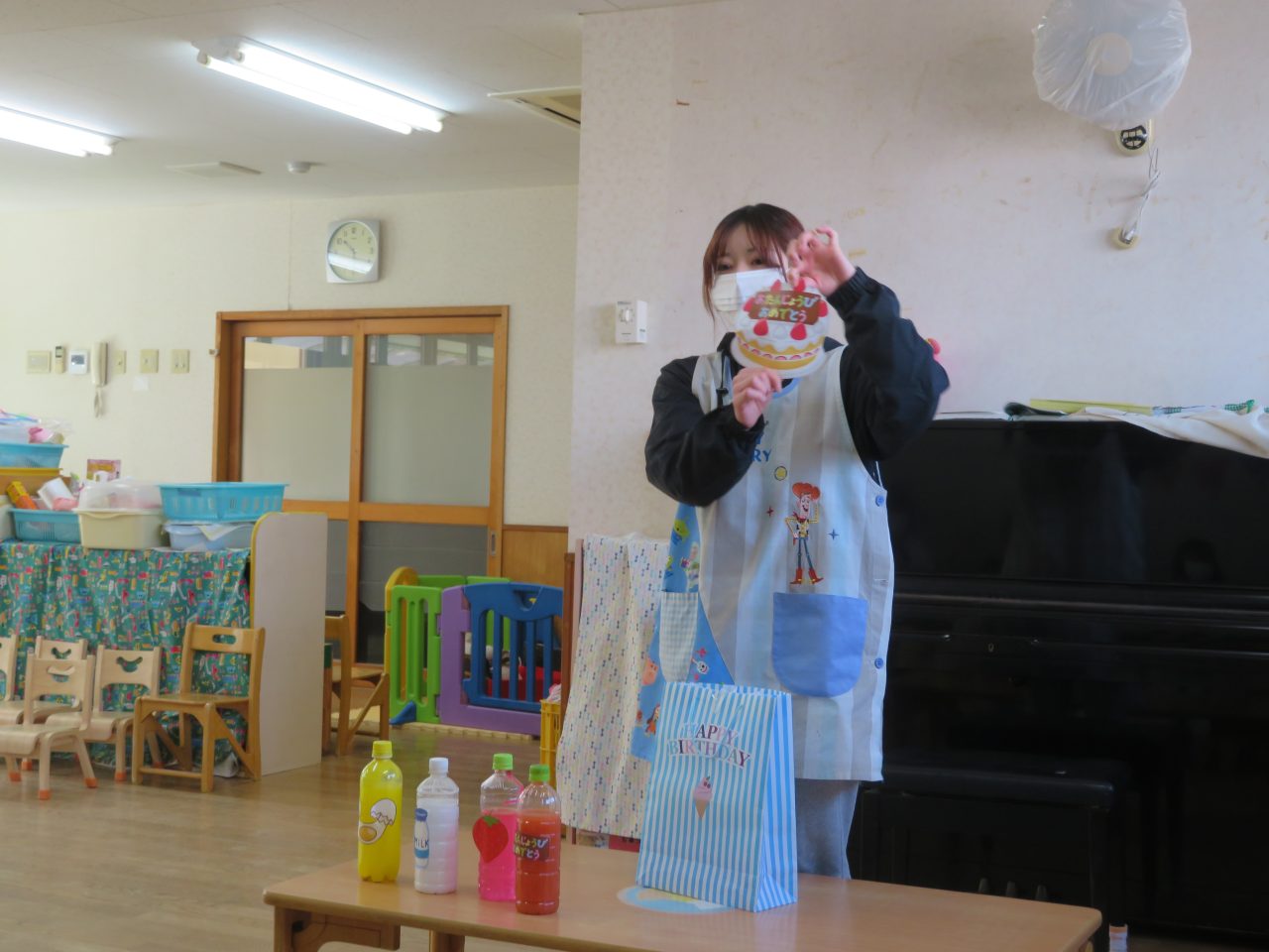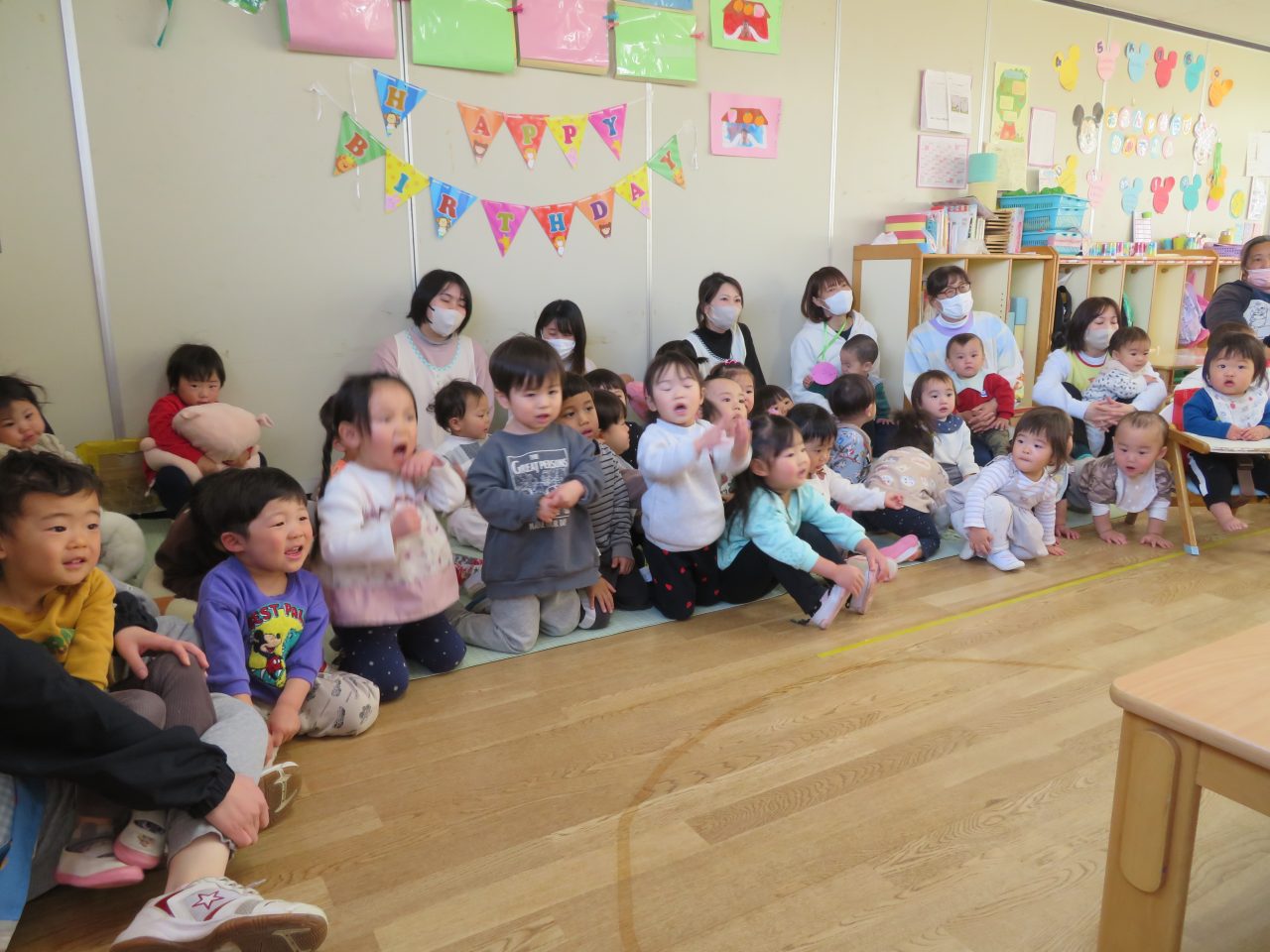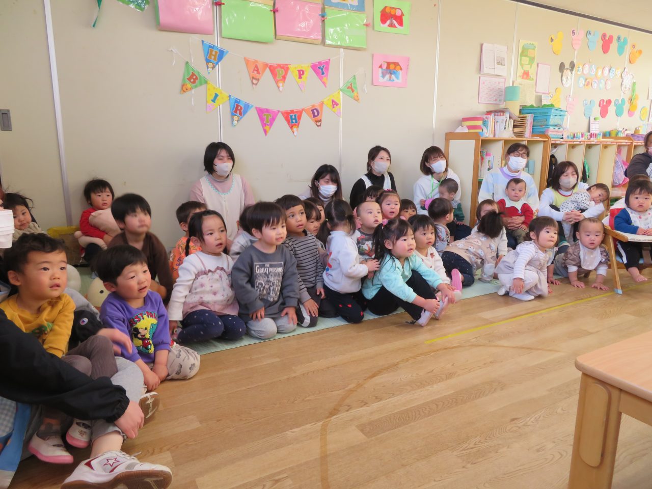 2月20日(金) 今日は2月のお誕生日会でした。各クラス3名の子をみんなでお祝いしました💕最初にインタビューをしましたがみんなの前で緊張気味の子どもたちがとっても可愛かったです😊最初に魔法の水で誕生日ケーキを作りました🎂振ると色が変わりケーキの材料に変身!子どもたちはびっくりで思わず声をあげ喜んでくれました✨作ったケーキはおやつに出るからお、た、の、し、み、に💛ペープサート「おおきなにんじん」みんなの声援の元おおきなにんじんが収穫できました🥕これを機に人参が苦手な子も食べれるといいですね!!改めて2月生まれの子お誕生日おめでとう🎉残り少ない1か月楽しく過ごしましょう✌
