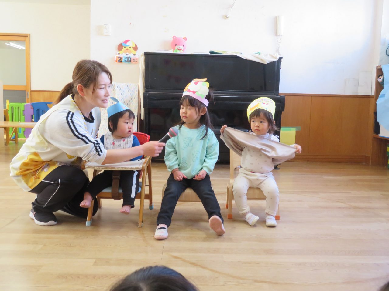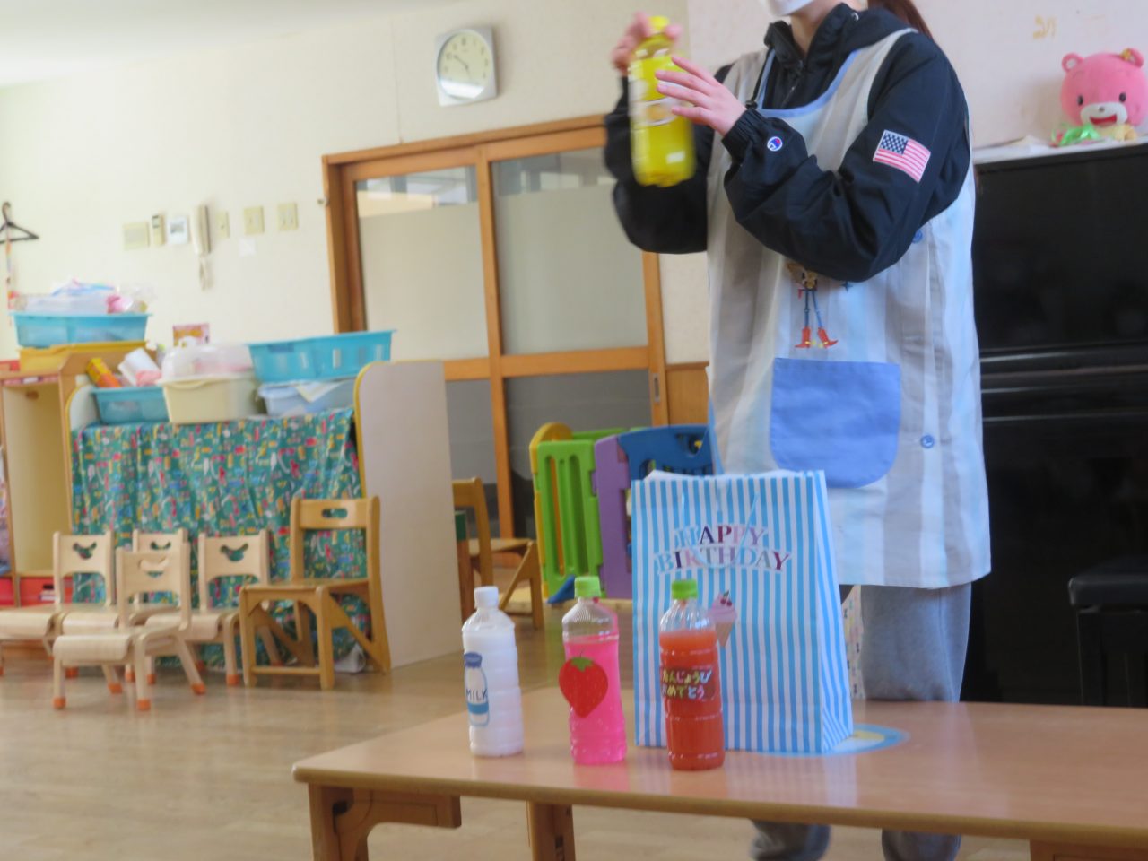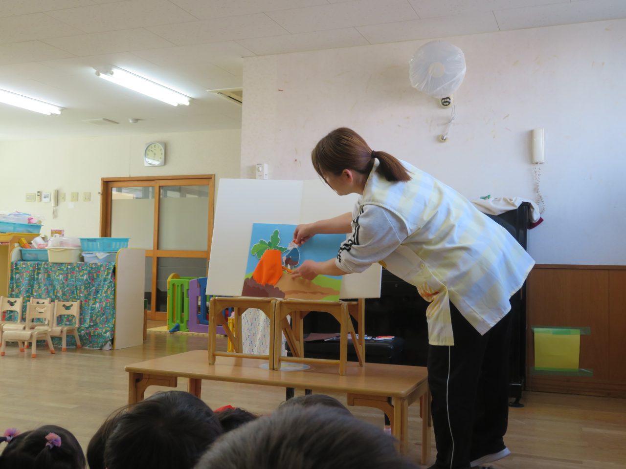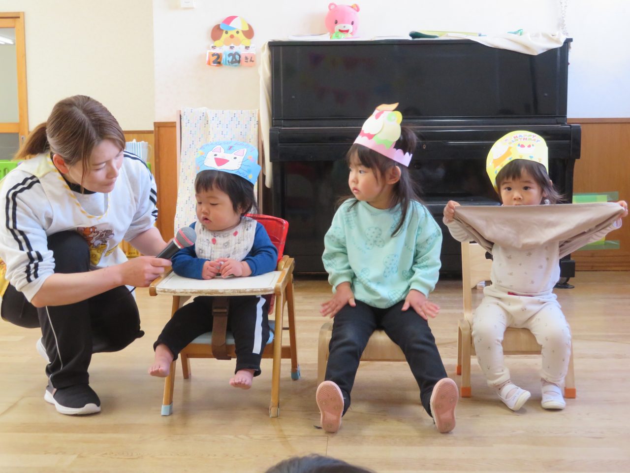 2月20日(金) 今日は2月のお誕生日会でした。各クラス3名の子をみんなでお祝いしました💕最初にインタビューをしましたがみんなの前で緊張気味の子どもたちがとっても可愛かったです😊最初に魔法の水で誕生日ケーキを作りました🎂振ると色が変わりケーキの材料に変身!子どもたちはびっくりで思わず声をあげ喜んでくれました✨作ったケーキはおやつに出るからお、た、の、し、み、に💛ペープサート「おおきなにんじん」みんなの声援の元おおきなにんじんが収穫できました🥕これを機に人参が苦手な子も食べれるといいですね!!改めて2月生まれの子お誕生日おめでとう🎉残り少ない1か月楽しく過ごしましょう✌