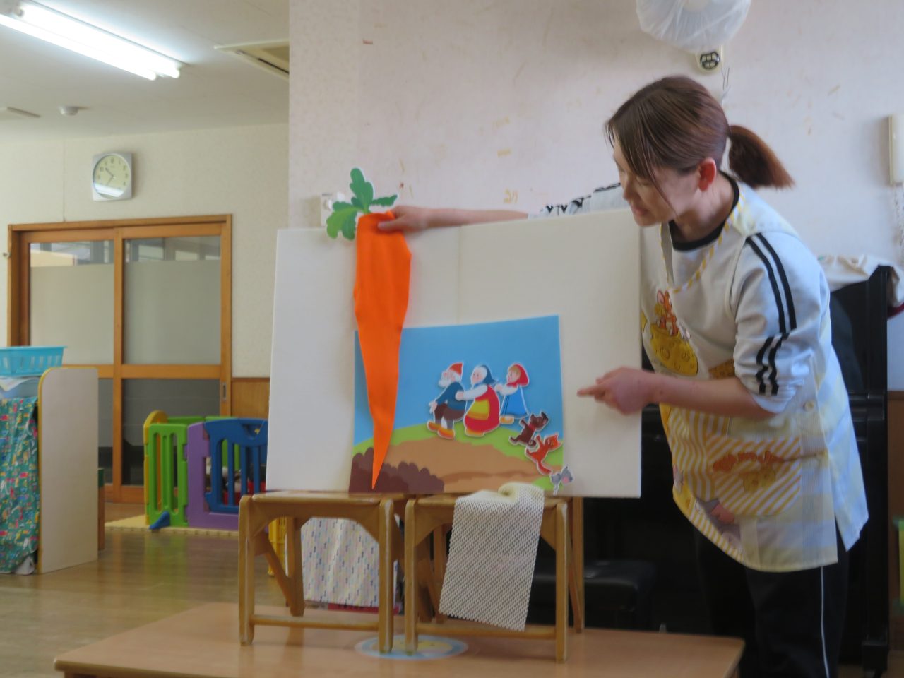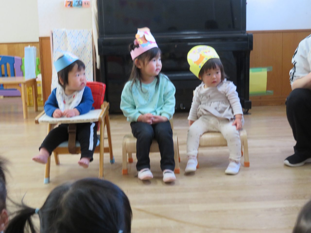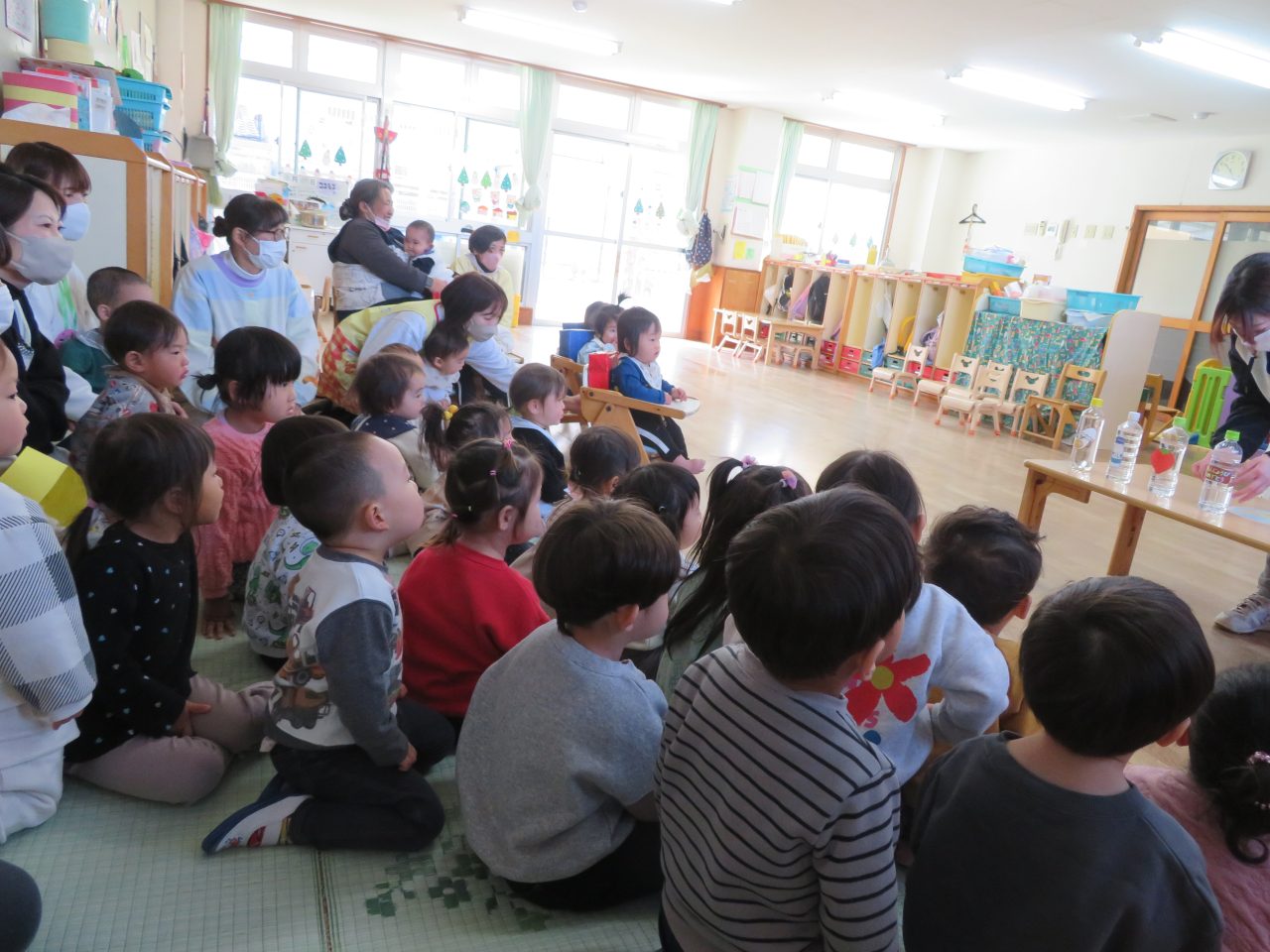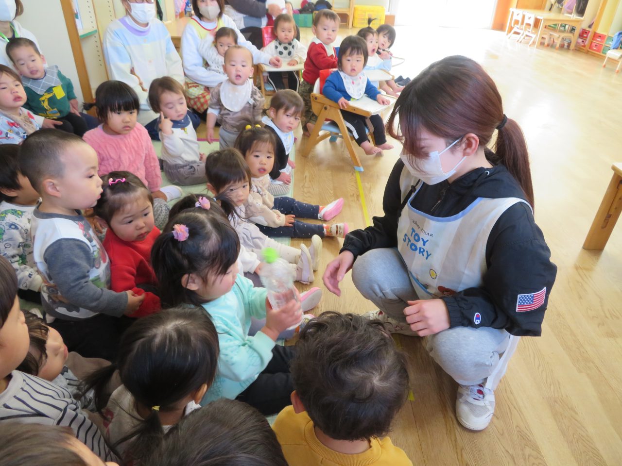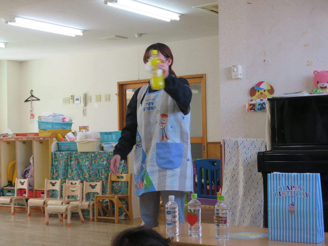 2月20日(金) 今日は2月のお誕生日会でした。各クラス3名の子をみんなでお祝いしました💕最初にインタビューをしましたがみんなの前で緊張気味の子どもたちがとっても可愛かったです😊最初に魔法の水で誕生日ケーキを作りました🎂振ると色が変わりケーキの材料に変身!子どもたちはびっくりで思わず声をあげ喜んでくれました✨作ったケーキはおやつに出るからお、た、の、し、み、に💛ペープサート「おおきなにんじん」みんなの声援の元おおきなにんじんが収穫できました🥕これを機に人参が苦手な子も食べれるといいですね!!改めて2月生まれの子お誕生日おめでとう🎉残り少ない1か月楽しく過ごしましょう✌