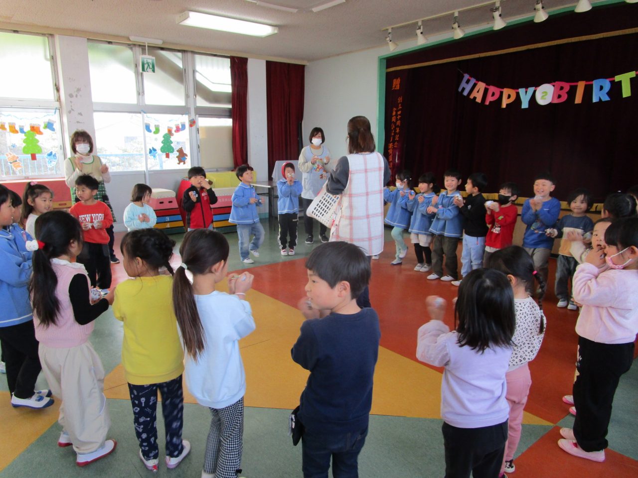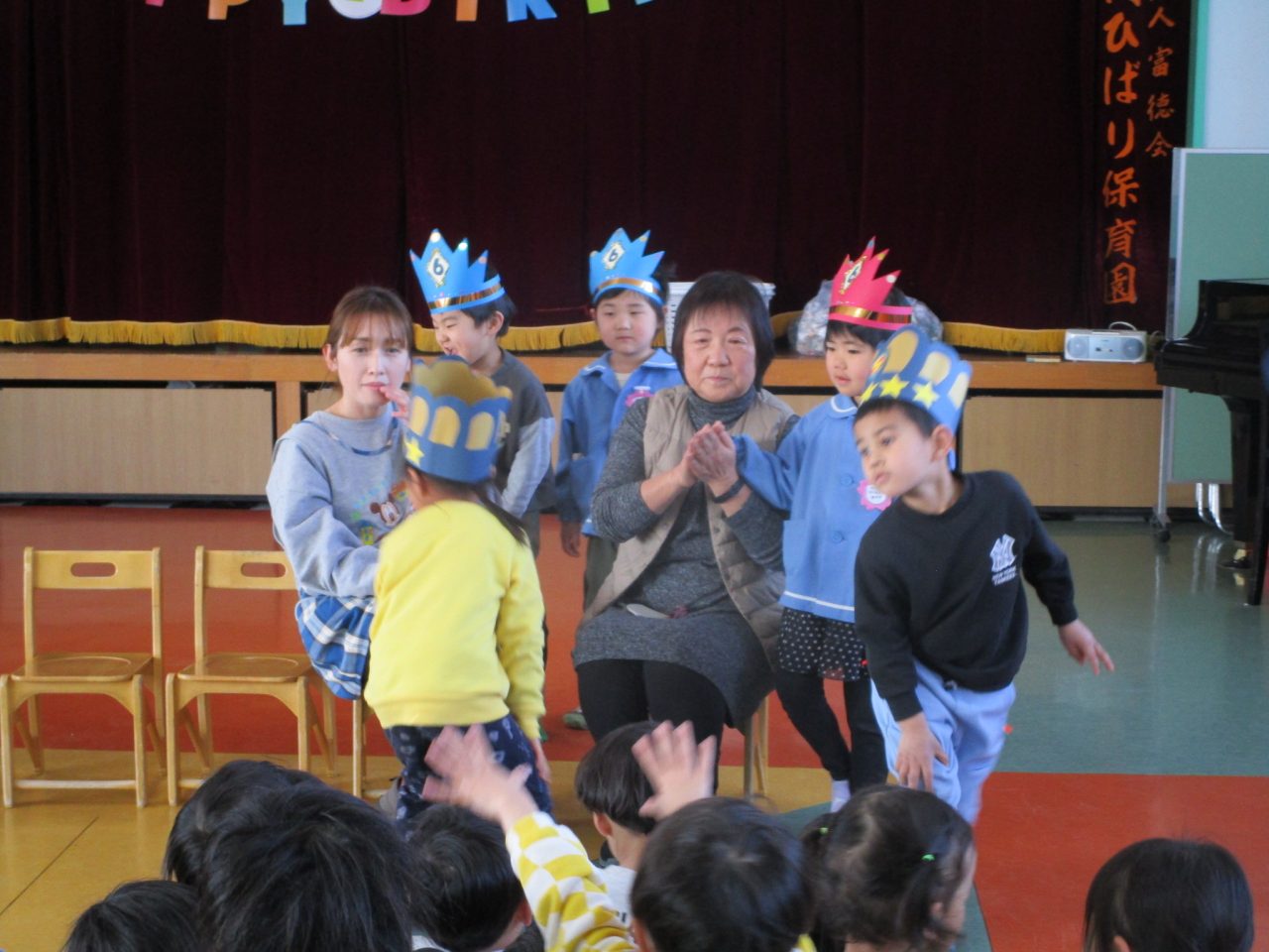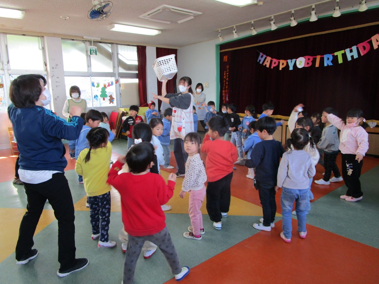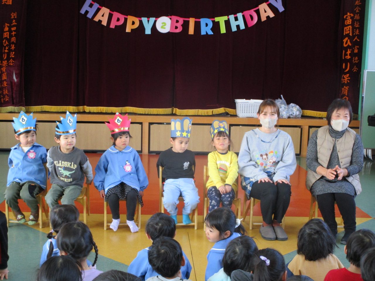誕生会ではさくら組さん3名、ひまわり組さん2名、職員1名そして、なんと!園長先生に前に出てもらいみんなで楽しくお祝いをしました❣