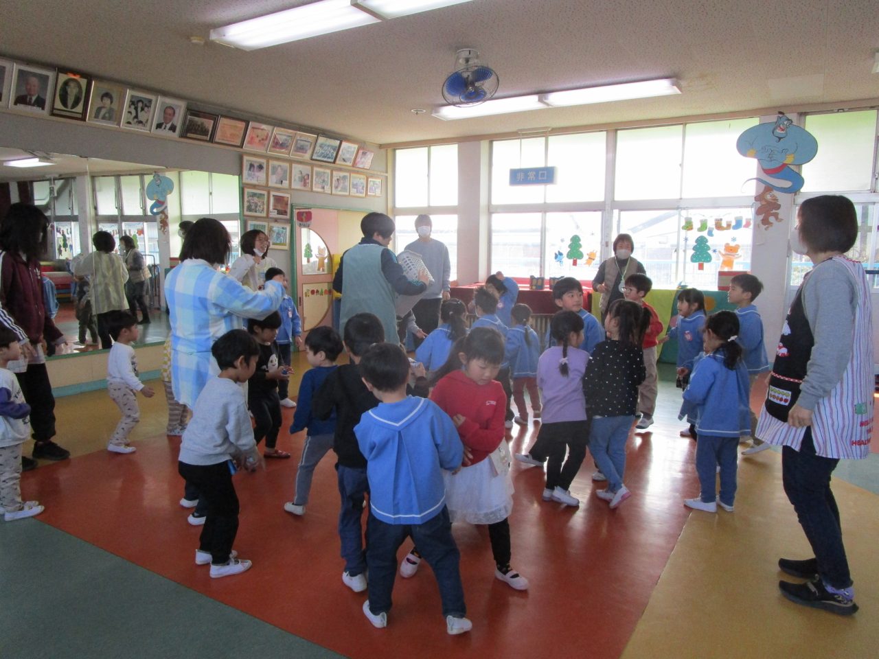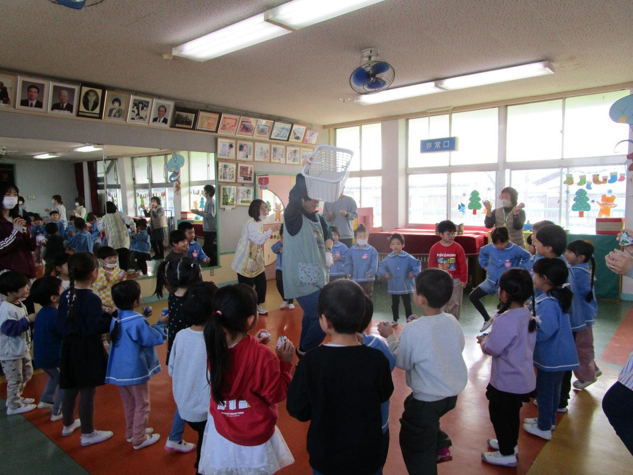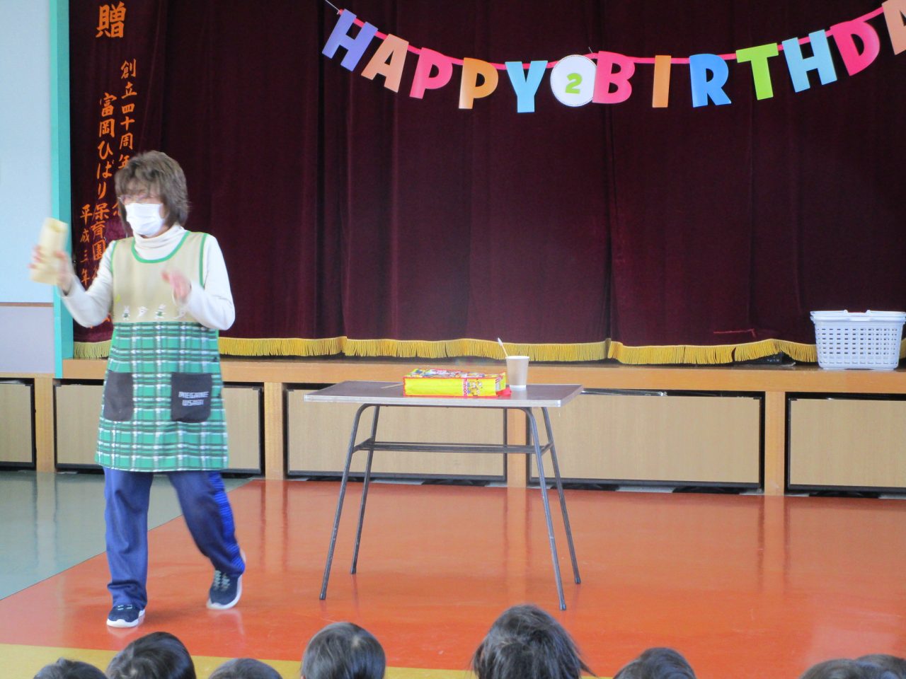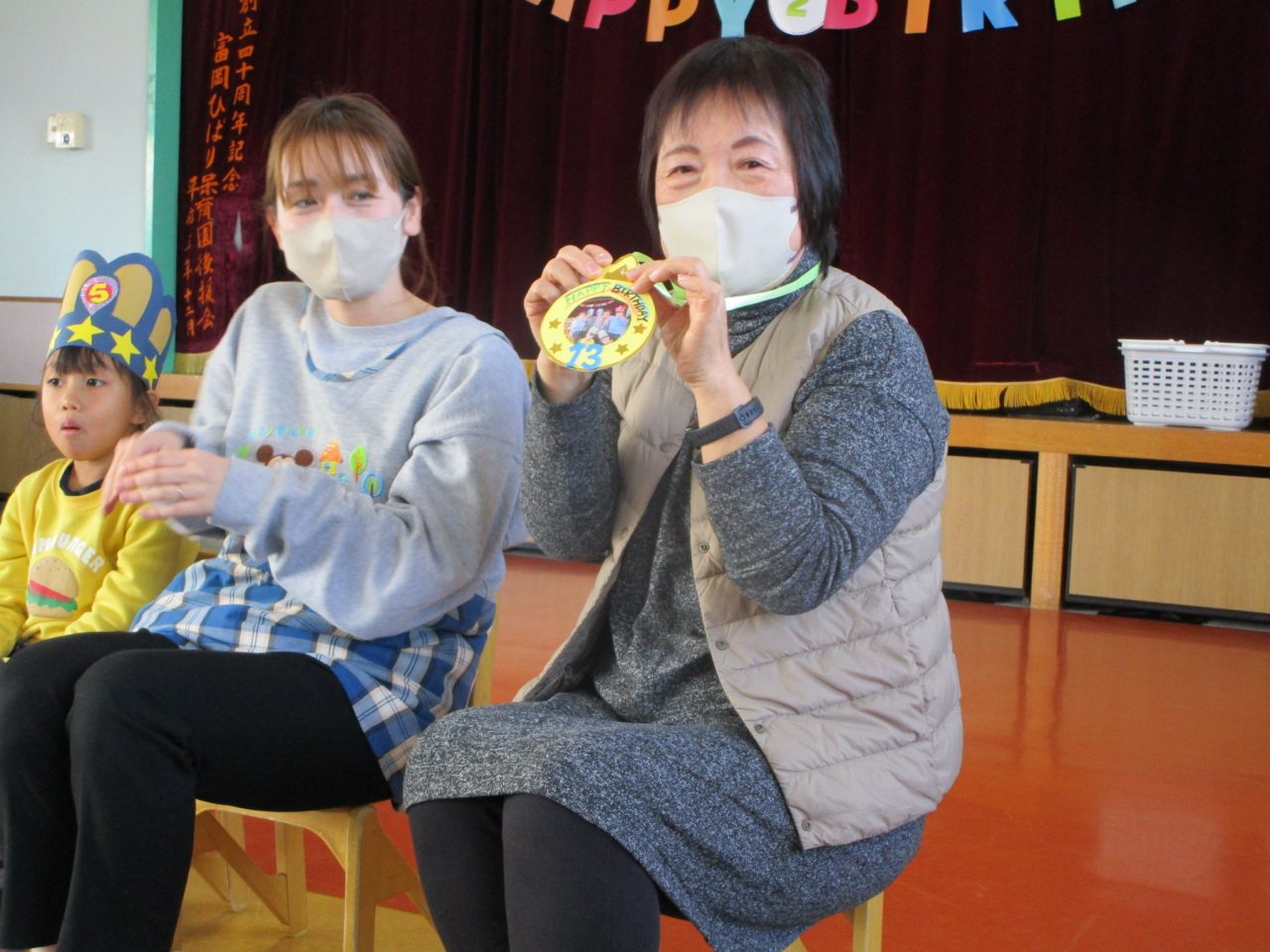 誕生会ではさくら組さん3名、ひまわり組さん2名、職員1名そして、なんと!園長先生に前に出てもらいみんなで楽しくお祝いをしました❣