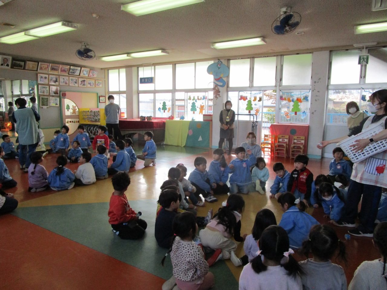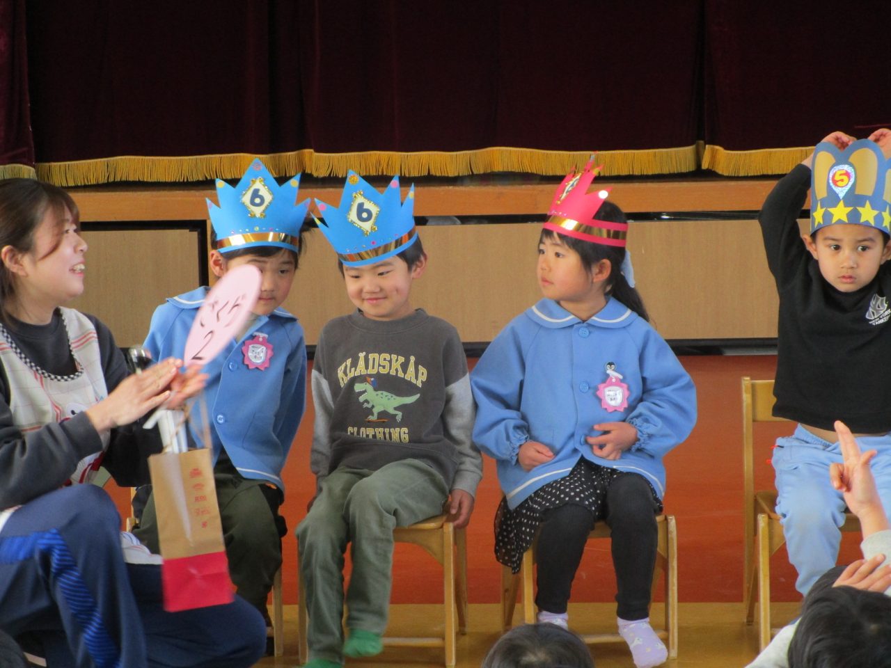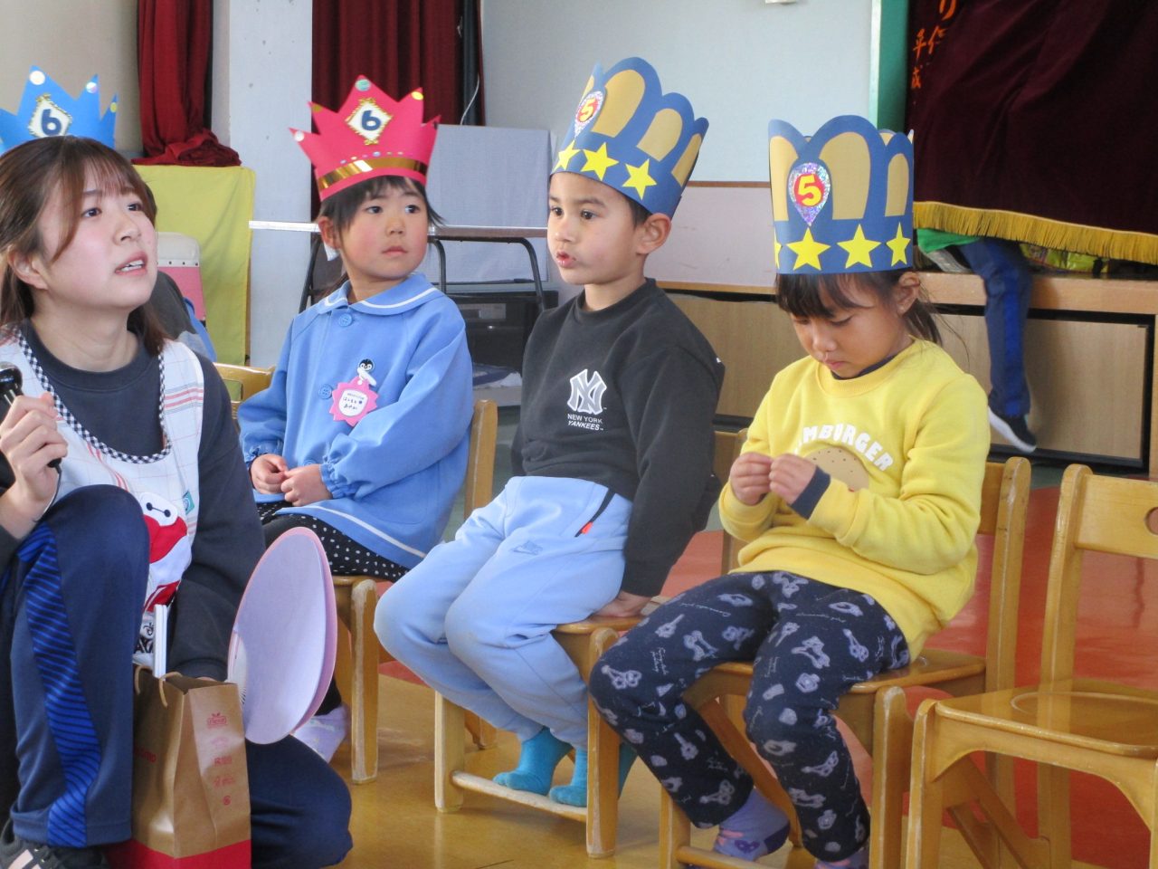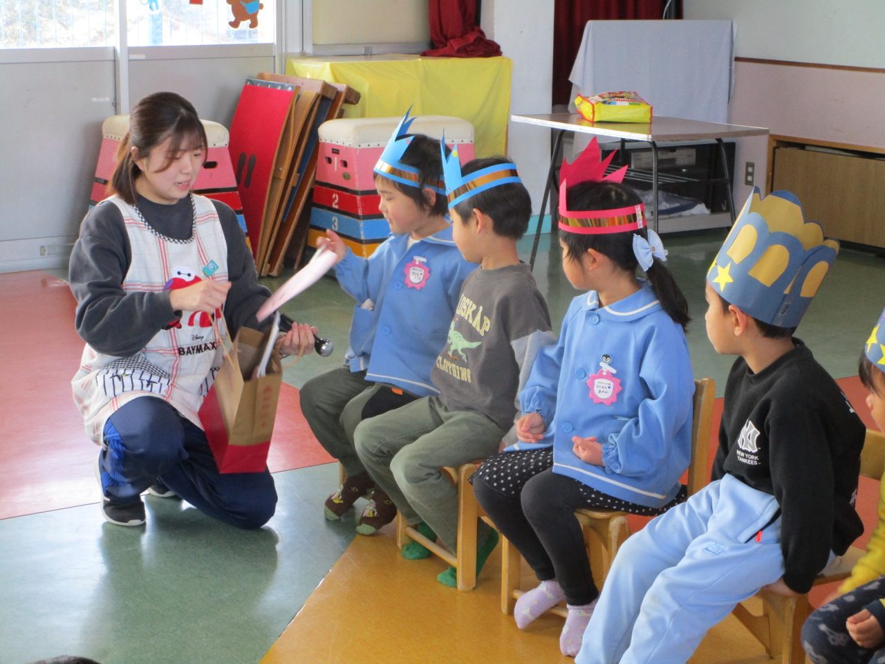 誕生会ではさくら組さん3名、ひまわり組さん2名、職員1名そして、なんと!園長先生に前に出てもらいみんなで楽しくお祝いをしました❣