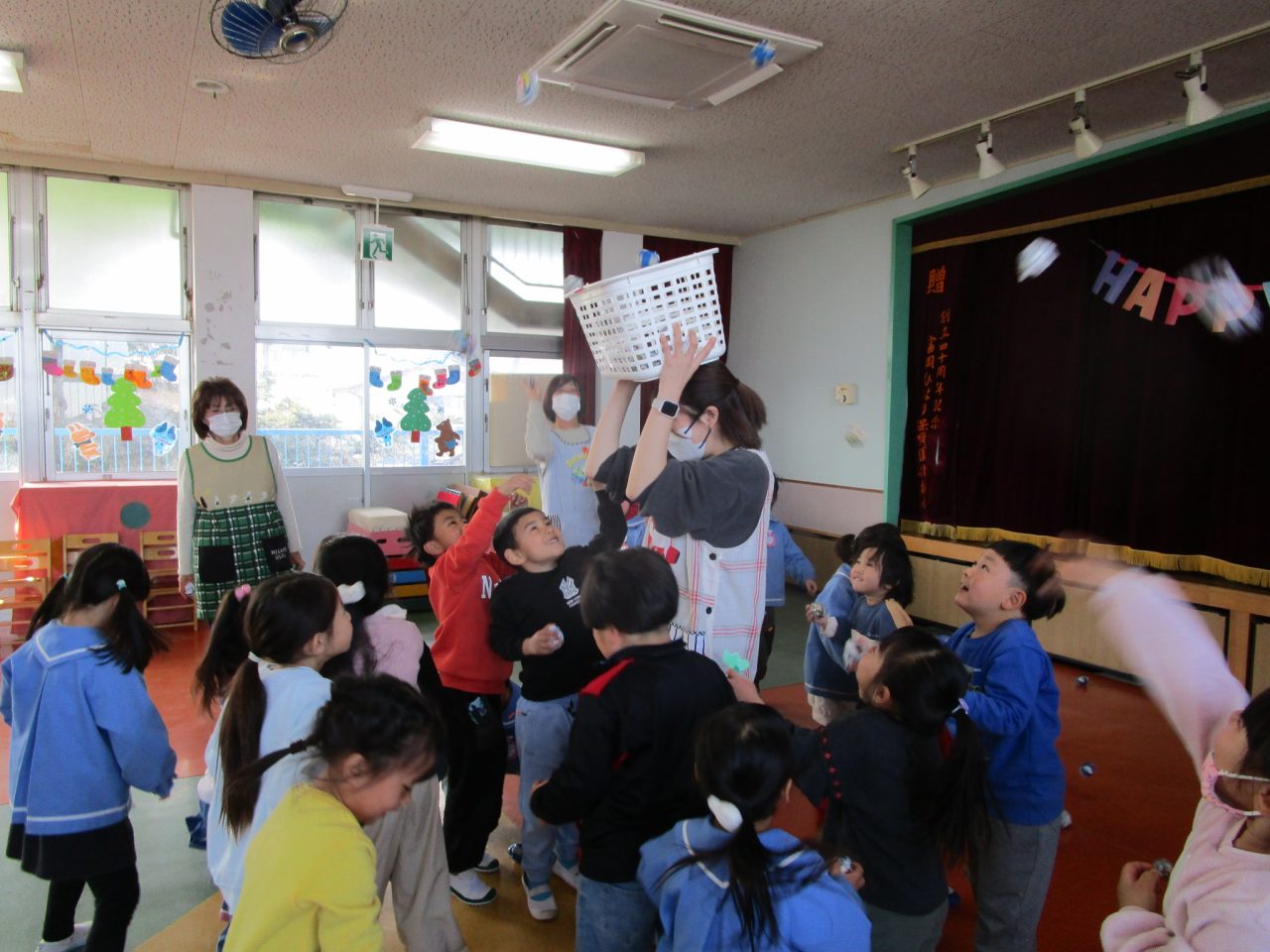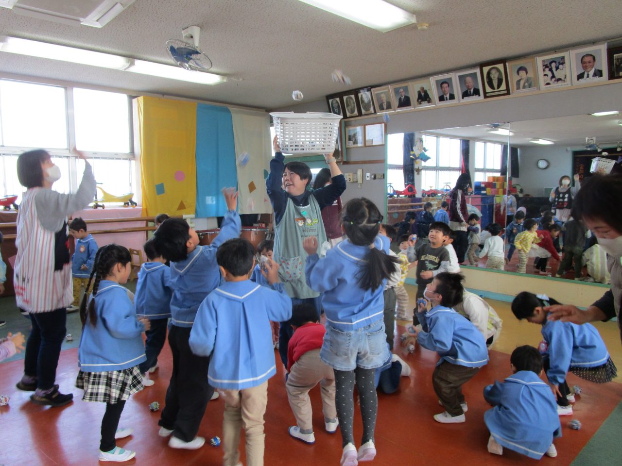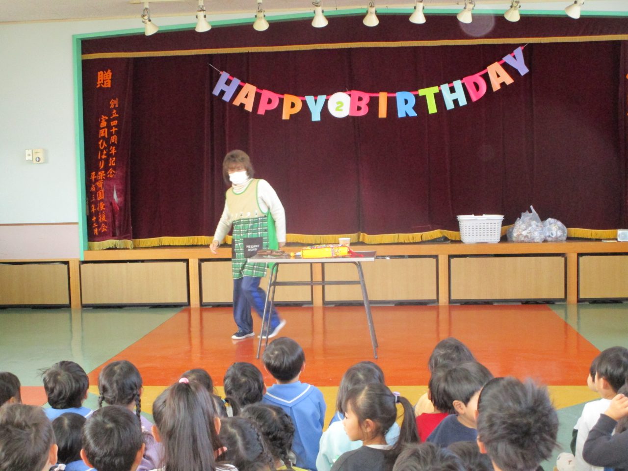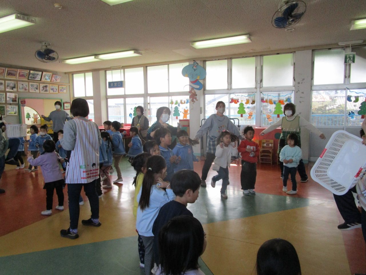 誕生会ではさくら組さん3名、ひまわり組さん2名、職員1名そして、なんと!園長先生に前に出てもらいみんなで楽しくお祝いをしました❣