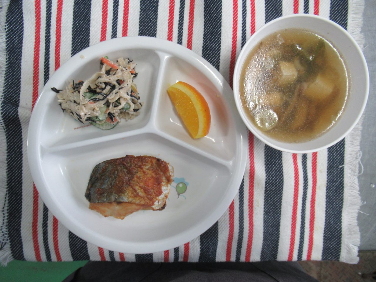 お昼・・・さわらの梅みそ焼き/鉄骨サラダ/こしね汁