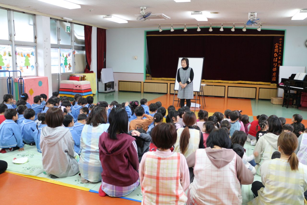 ひばりこども園でもホールに集まって『ひな祭り集会』を行いました。