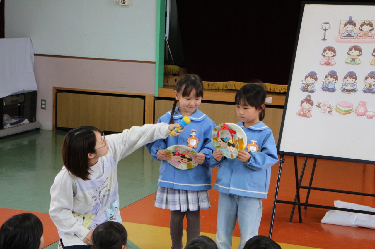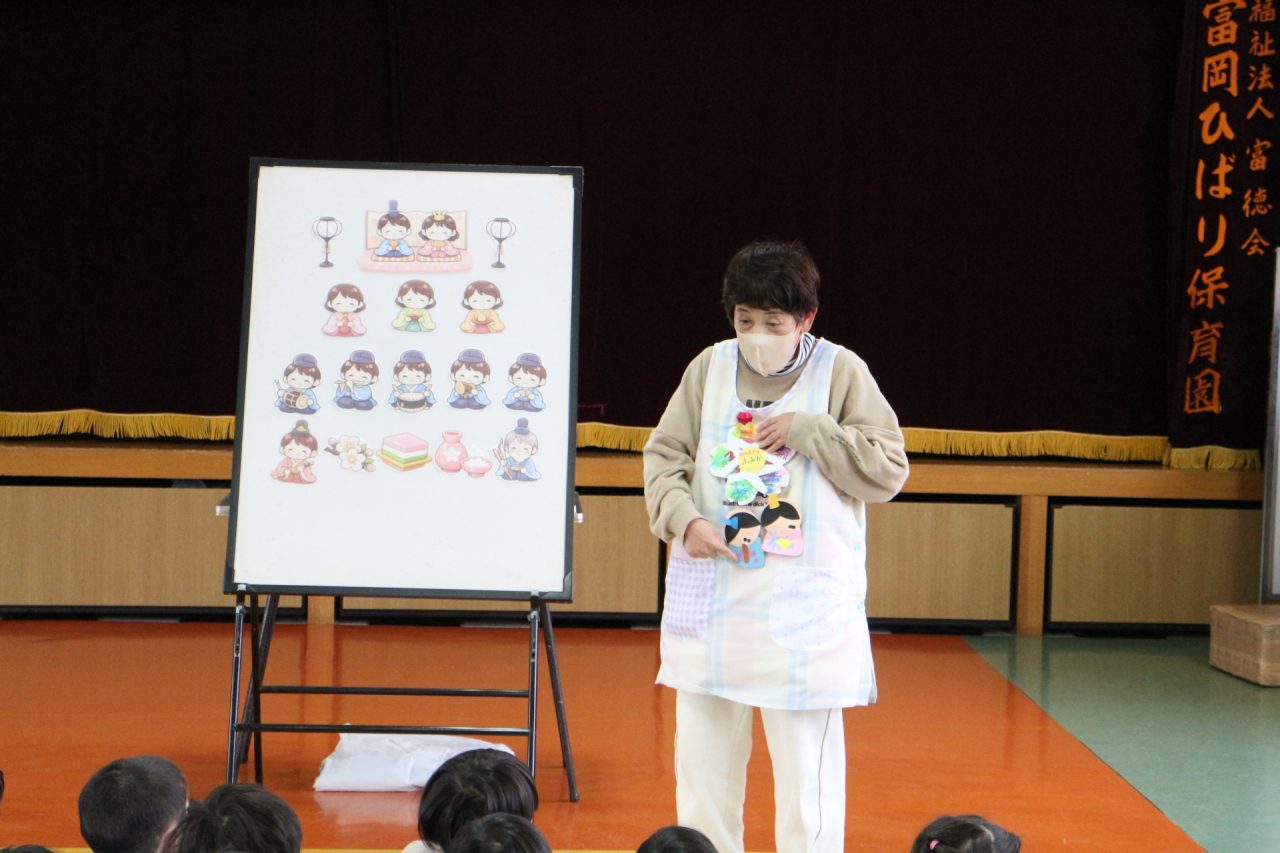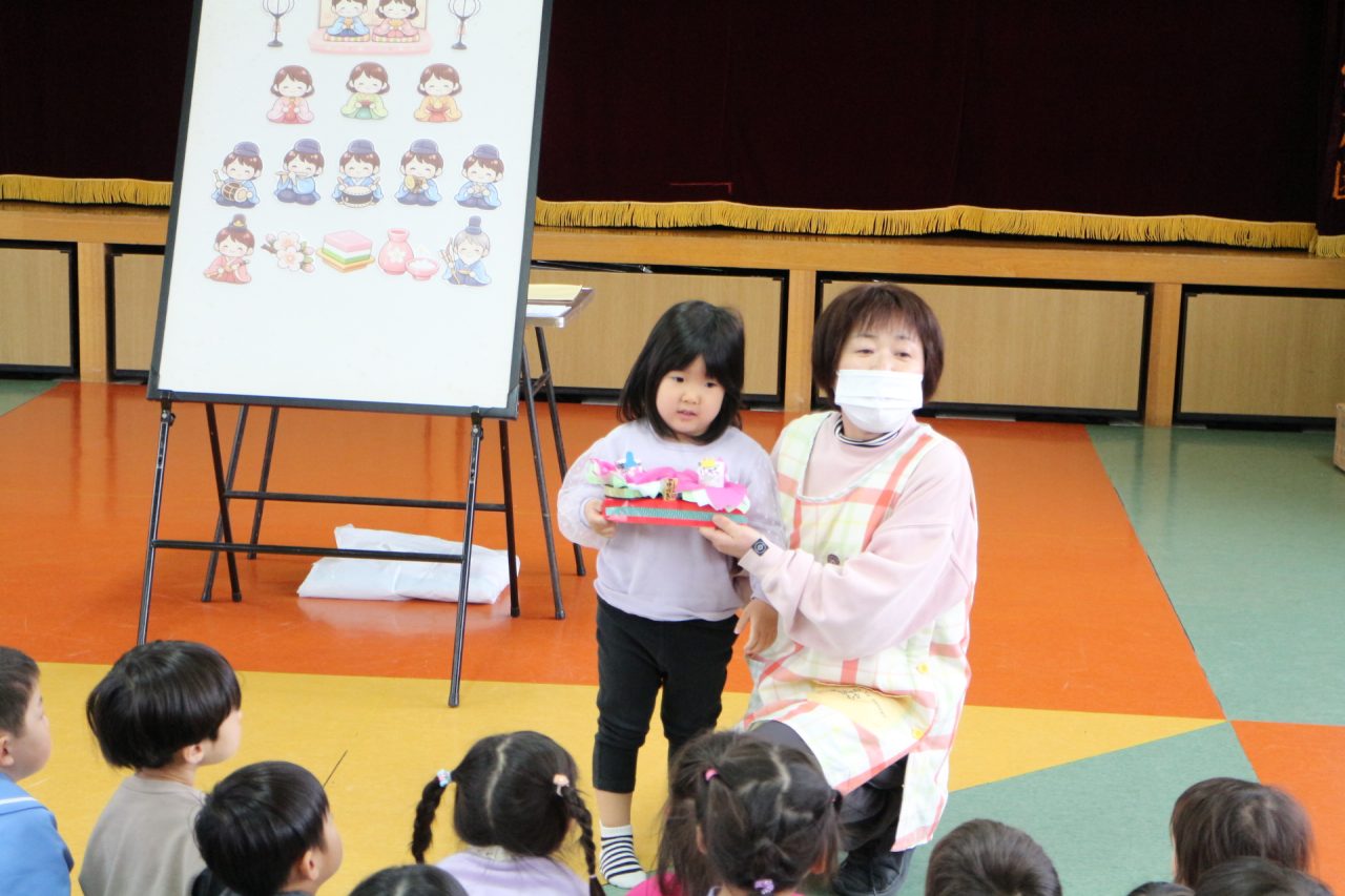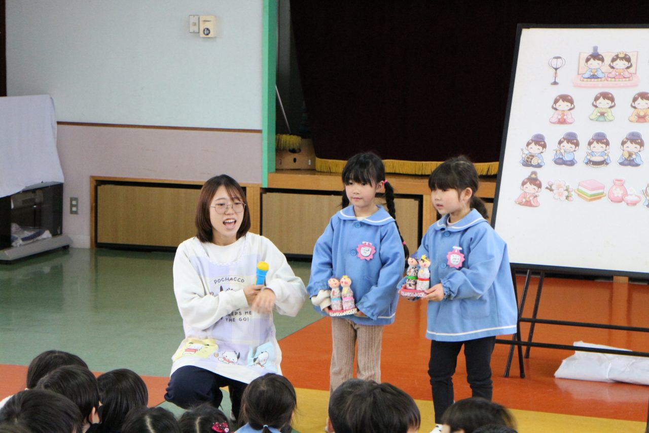 パネルシアターを見たり、クイズをしたり、自分たちが作ったおひなさまの紹介があったりと、子どもたちも集会を楽しんでいるようでした。