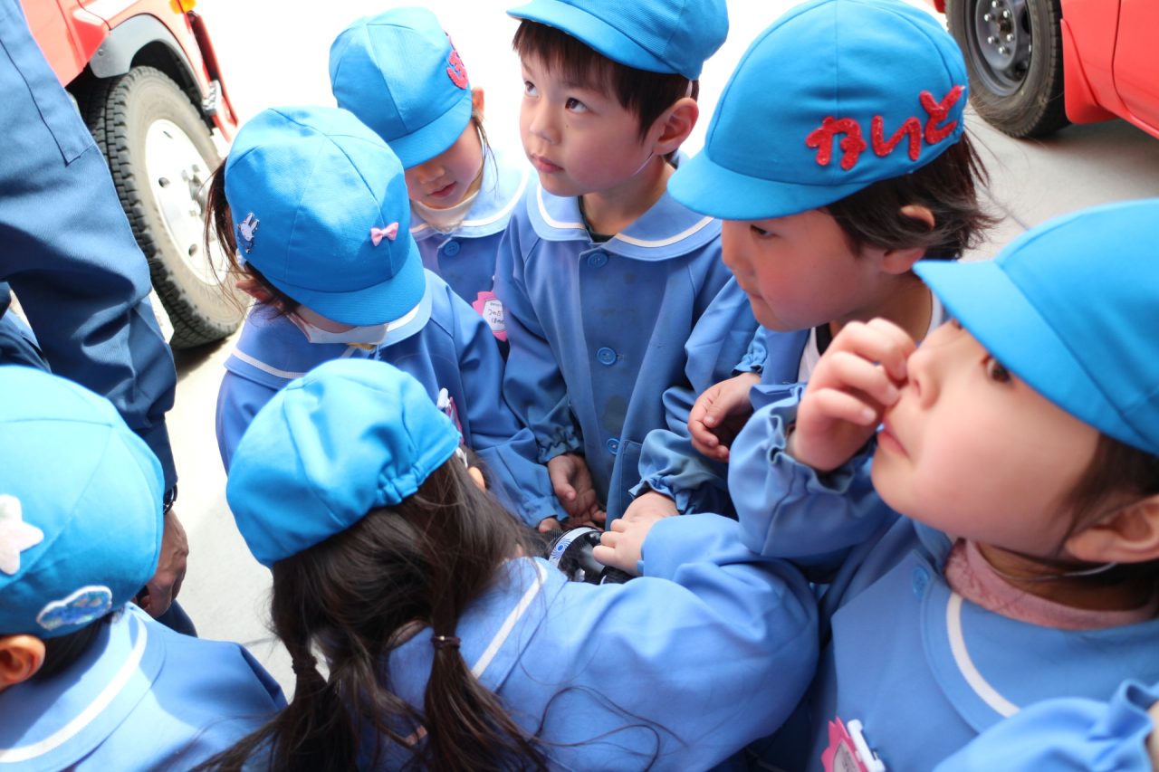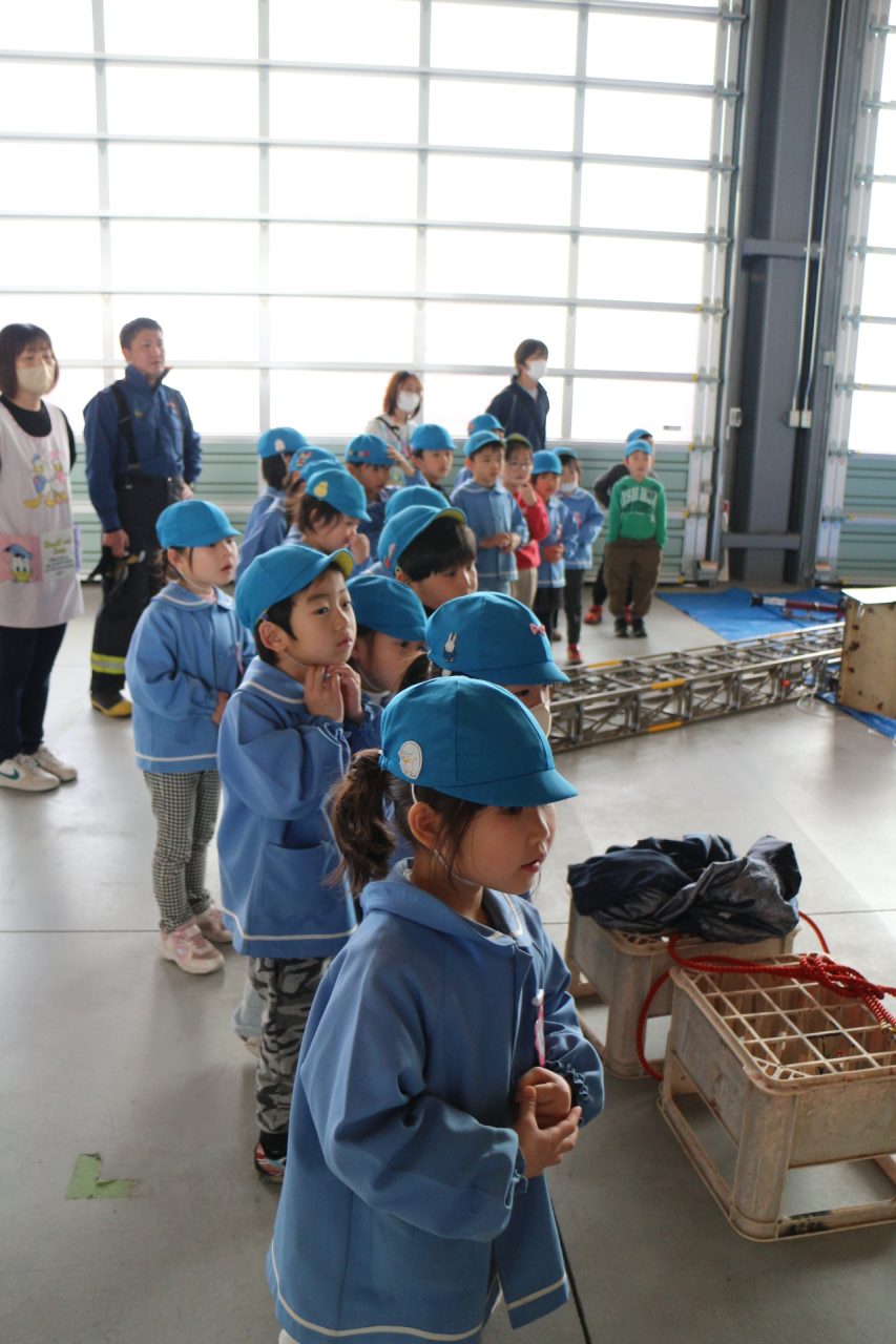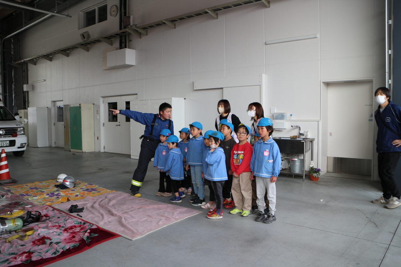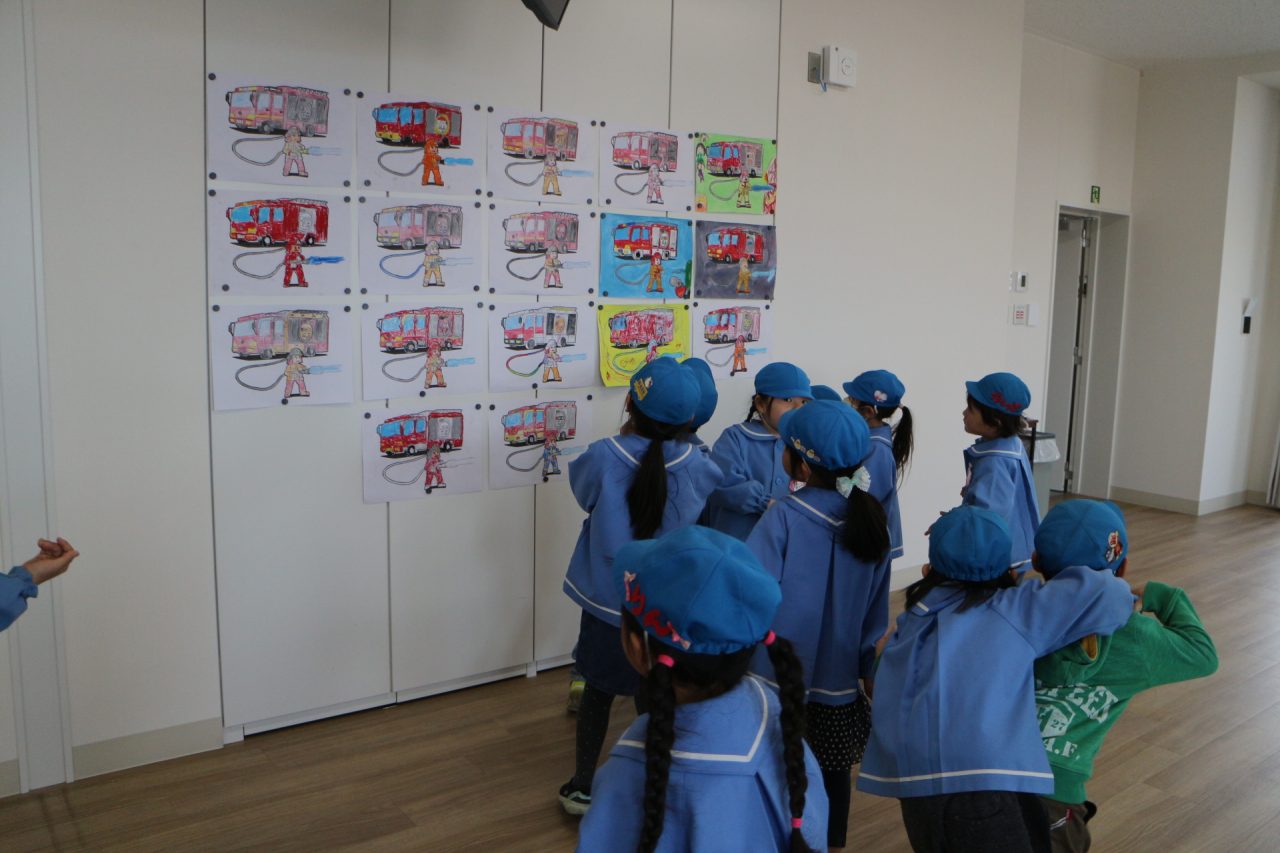 消防署へ塗り絵を見に行きながら、消防車や訓練の様子を見せてもらいに行きました。塗り絵は、自分のものをみんな見つけて大喜びしていました。消防車を見せてもらったり、訓練も見せていただきました。訓練はとても真剣で見ている子どもたちにも伝わり、いつの間にか『がんばれー!!』と応援している子もいました。みんなの命を守るのには自分たちの命も守らなくてはいけない、そのためには大変な訓練も必要だということが子どもたちにも伝わったのではと思います。